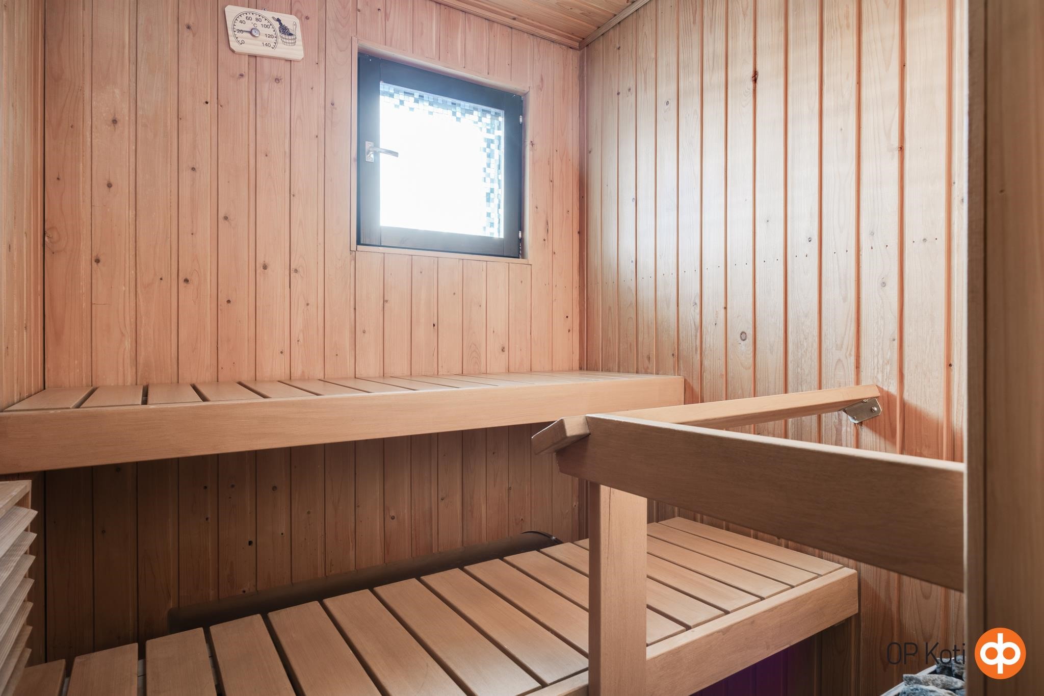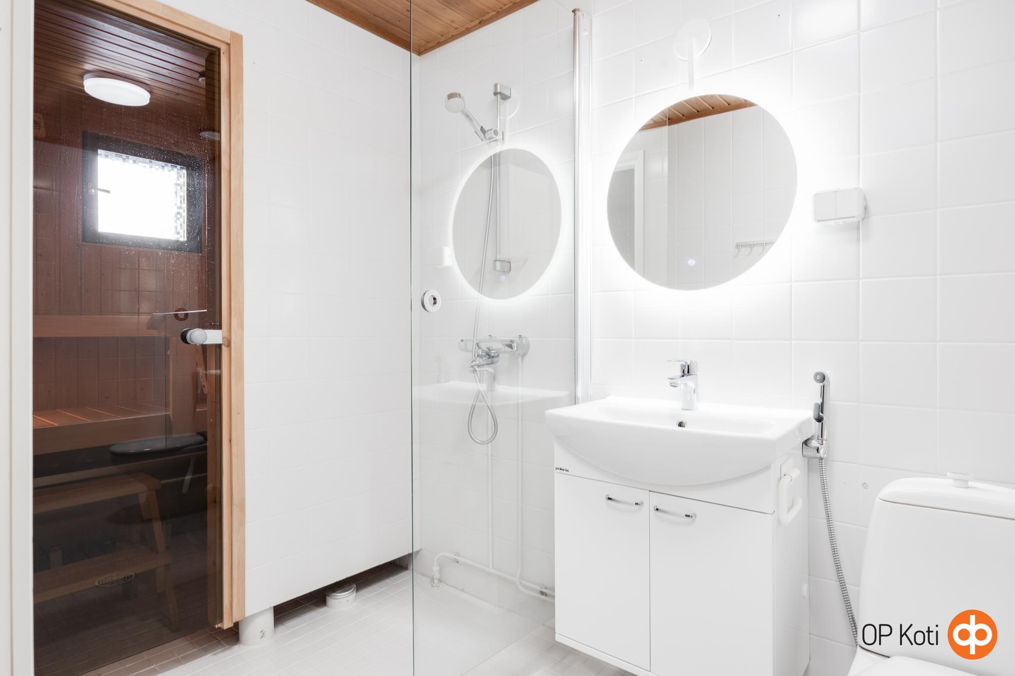 - Sauna, sähkökiuas, kylpyhuone, suihku, suihkuseinä, peilit, allaskaappi, pesukoneliitäntä, lattialämmitys, kiinteät valaisimet.