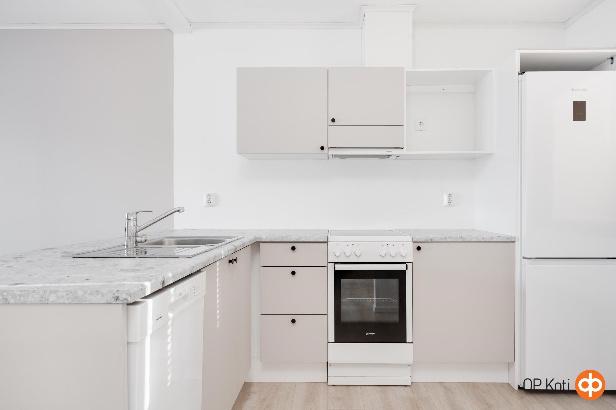 - Jääkaappipakastin, lattialiesi, keraaminen liesi, liesituuletin, astianpesukone, kaapistot, kiinteät valaisimet.