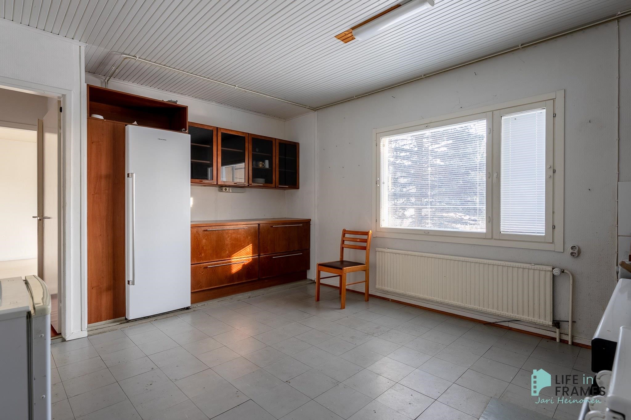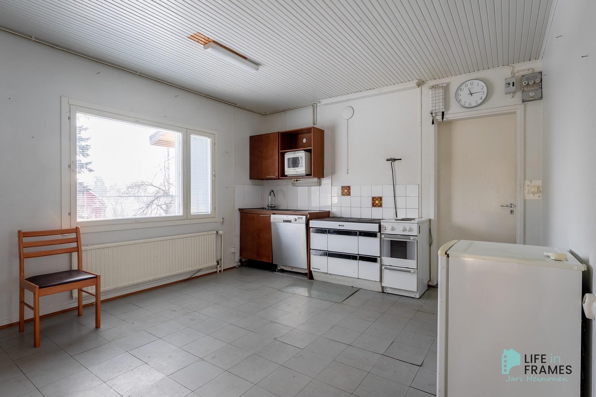 - Jääkaappi, pakastekaappi, sähköliesi, astianpesukone, kaapistot, kiinteät valaisimet. Puuhella