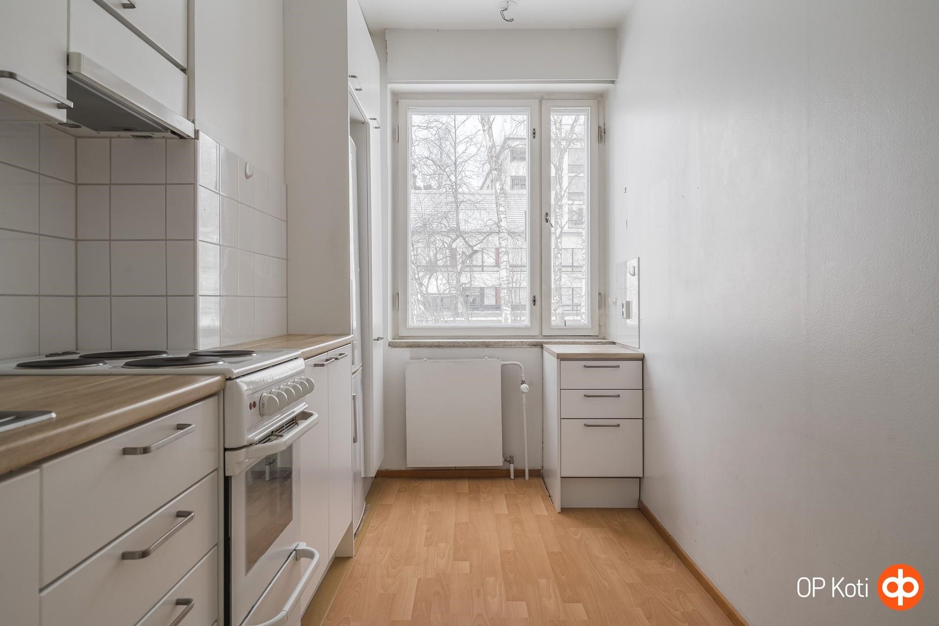 - Jääkaappipakastin (vanha, mutta toimii), sähköliesi, liesituuletin, kiinteät valaisimet.