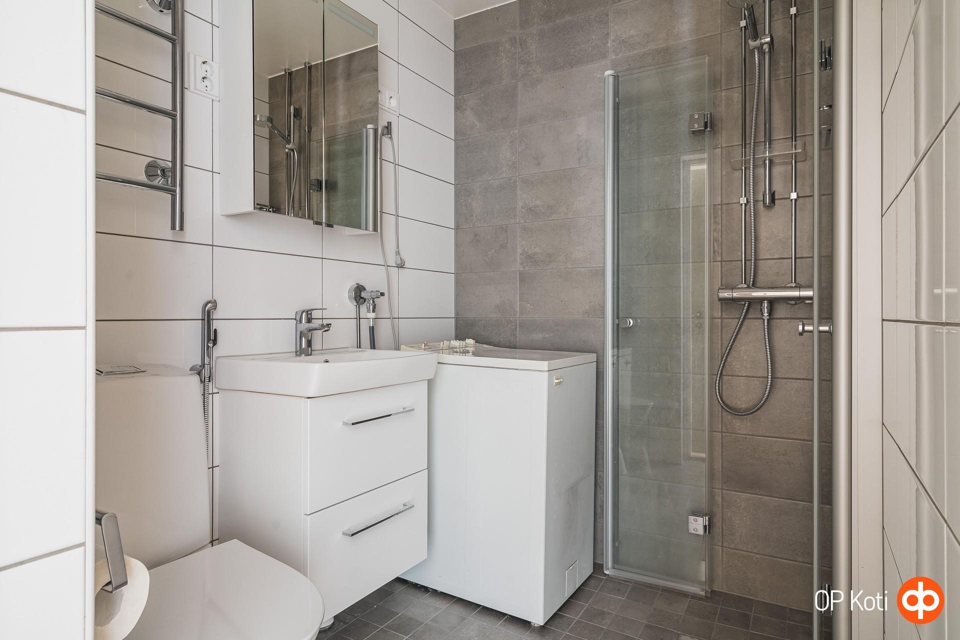 - Kylpyhuone on uusittu v. 2019 tehdyn linjasaneerauksen yhteydessä. Kylpyhuoneessa suihku, suihkukaappi, peilit, peilikaappi, kaapit, allaskaappi, pesukoneliitäntä, kiinteät valaisimet.