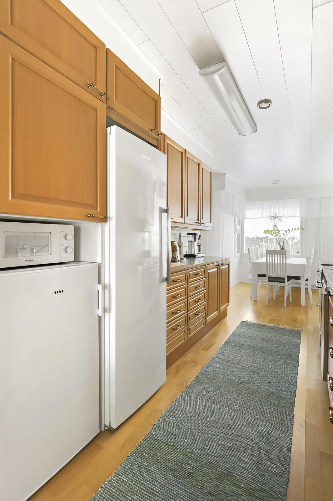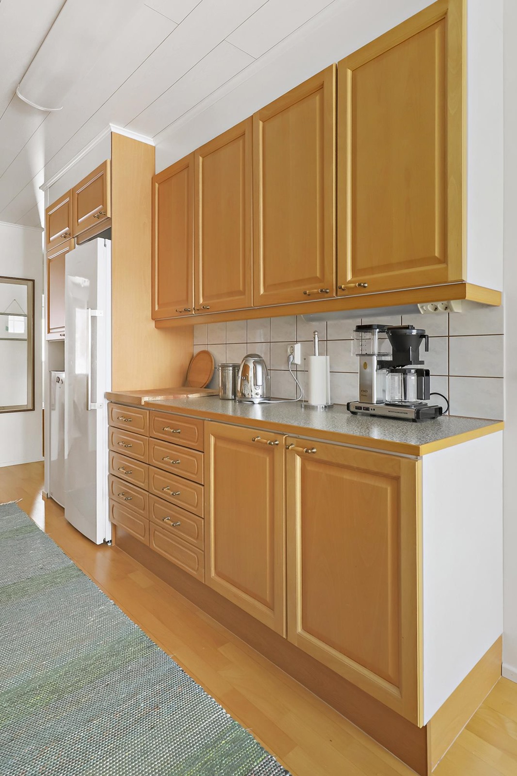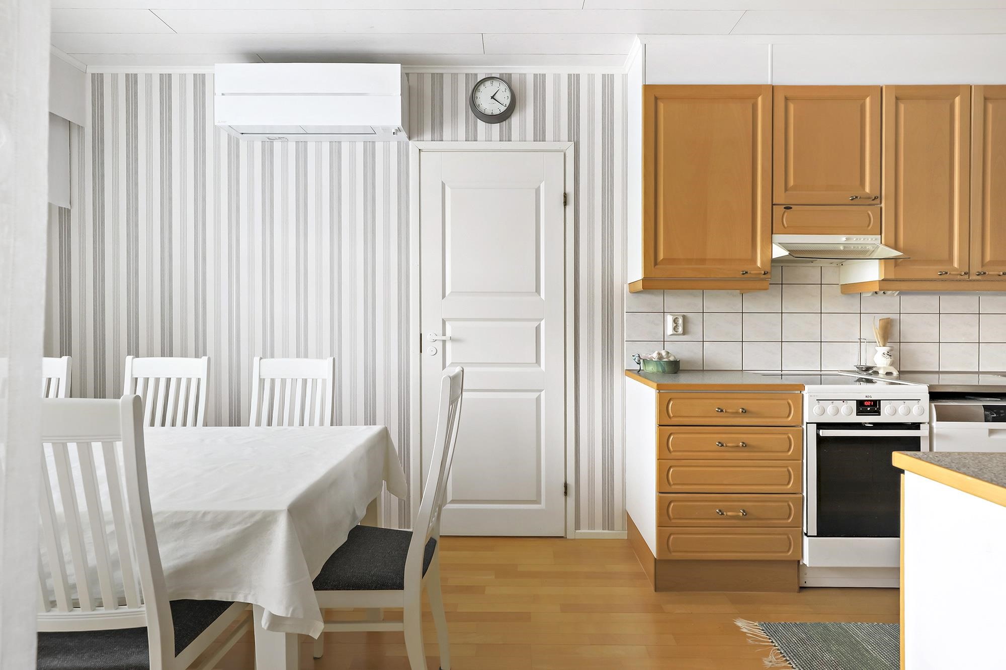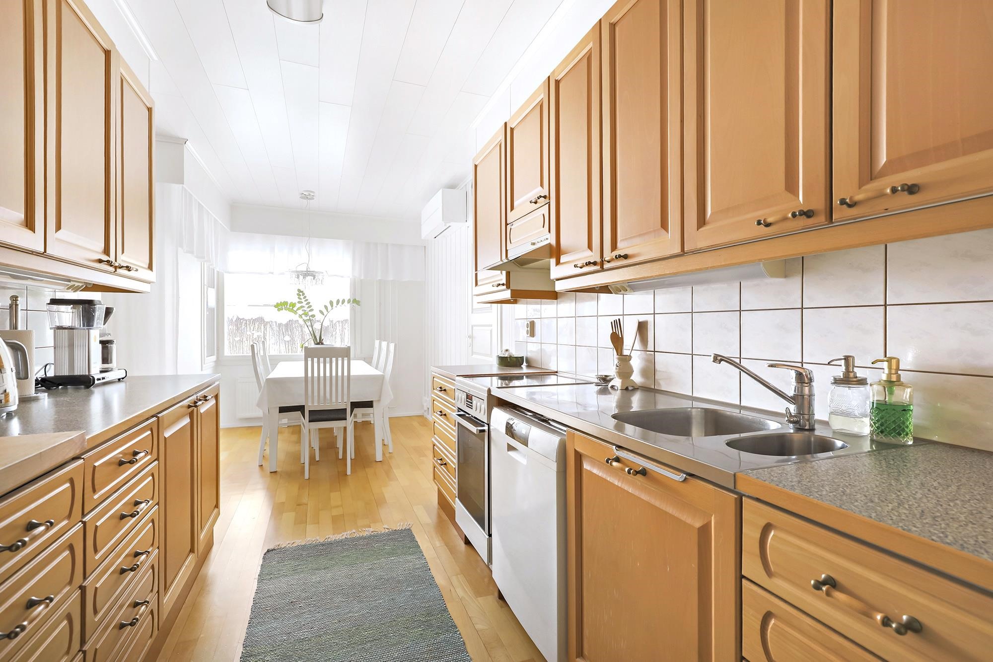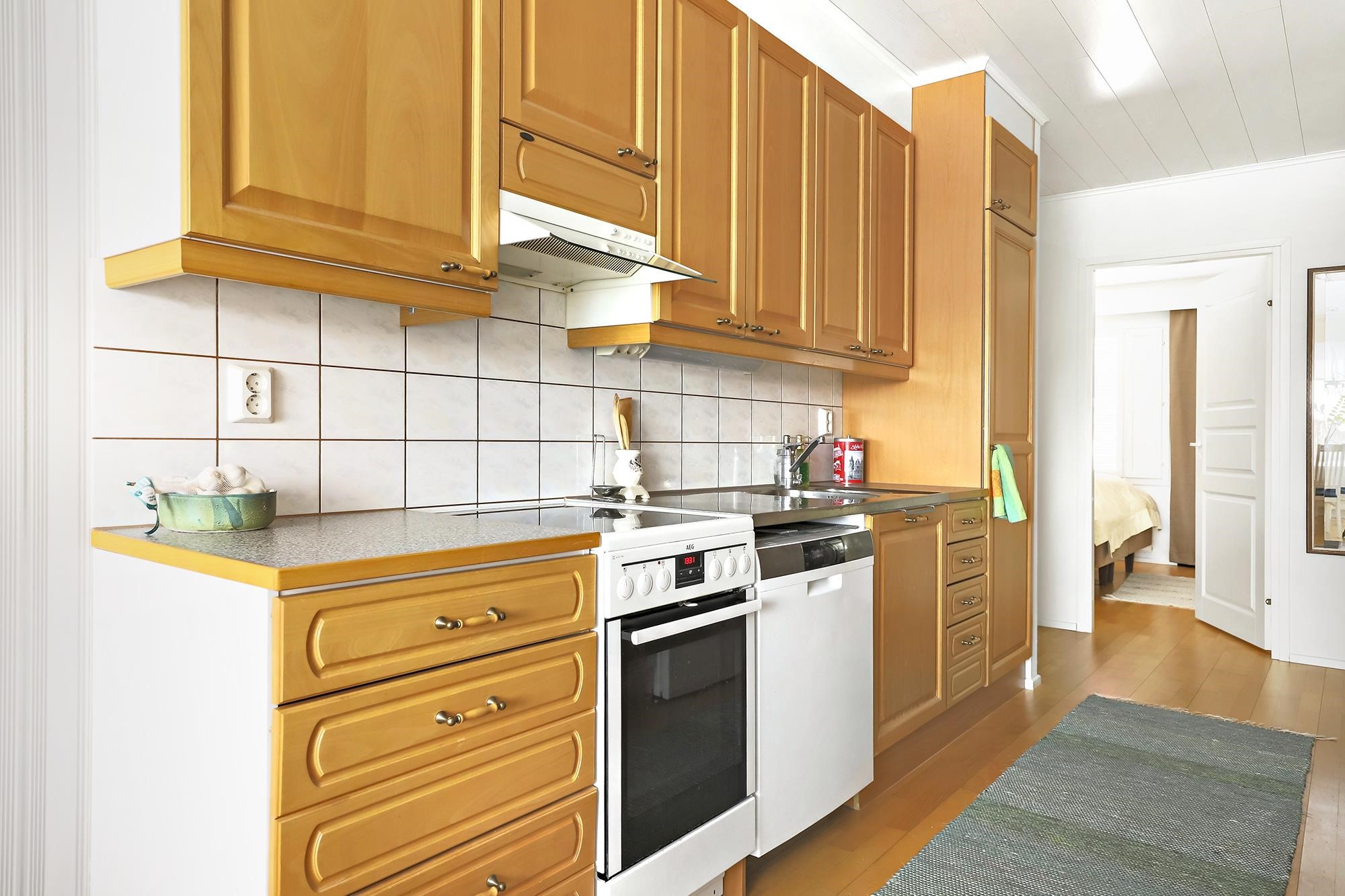 - Jääkaappi, pakastekaappi, keraaminen liesi, liesituuletin, astianpesukone, kaapistot, kiinteät valaisimet.