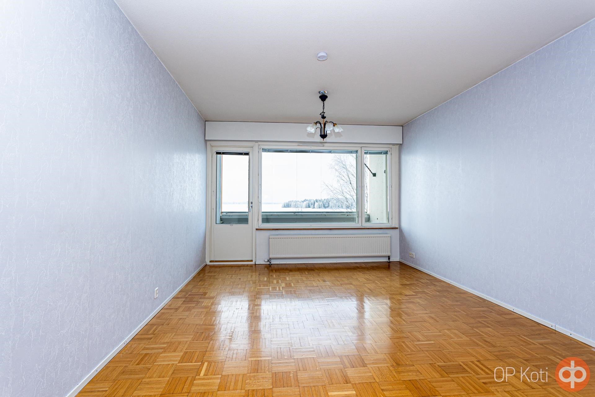 Poistamalla keittiön ja olohuoneen väliseinän saa yhtenäisen tilan, jossa ruokailuhetketkin vietetään järvinäkymästä nauttien. Olohuone on avara ja valoisa, ja kodissa on kaksi makuuhuonetta.