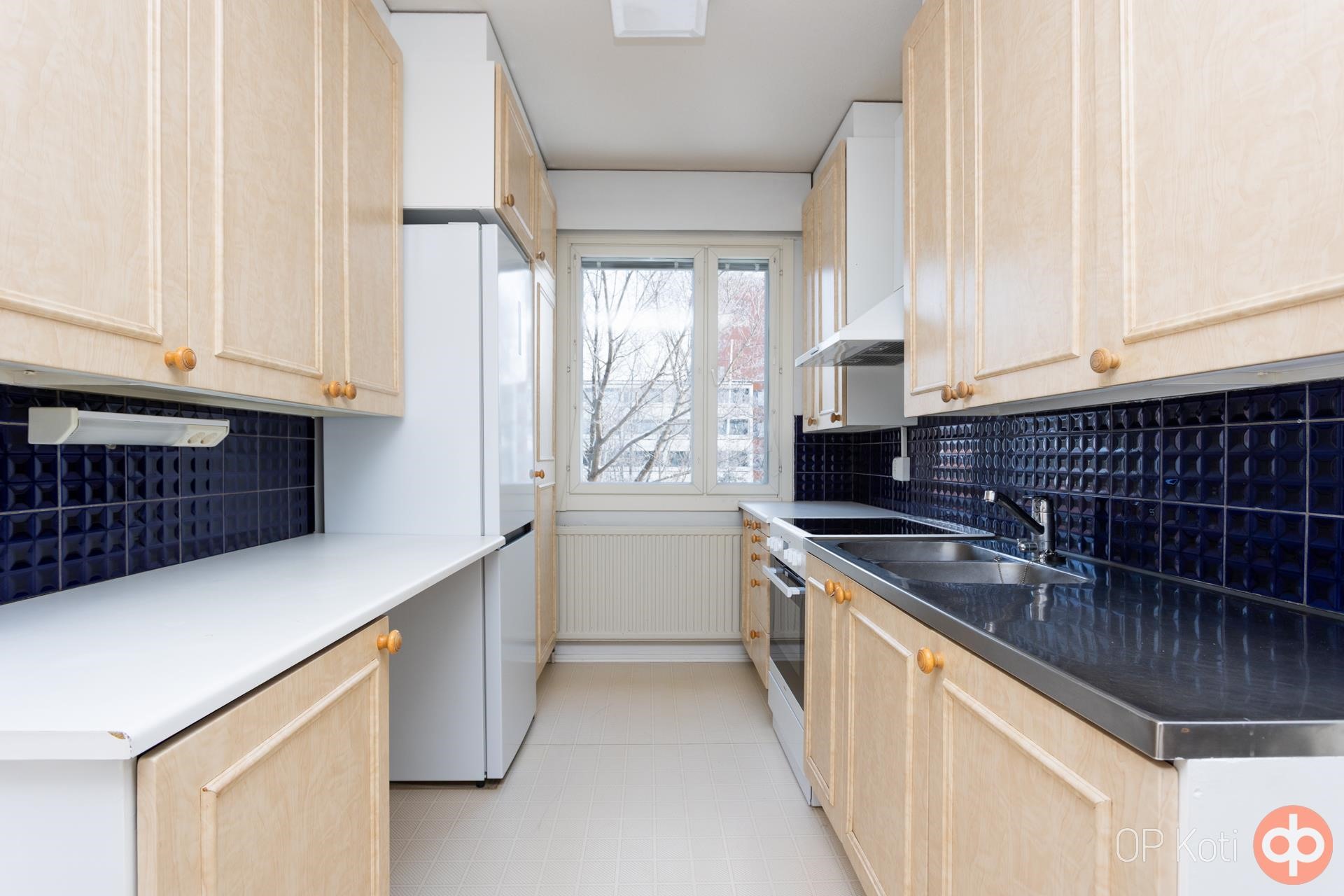 - Jääkaappipakastin 2025, keraaminen liesi 2020, liesituuletin 2022, kaapistot, kiinteät valaisimet.