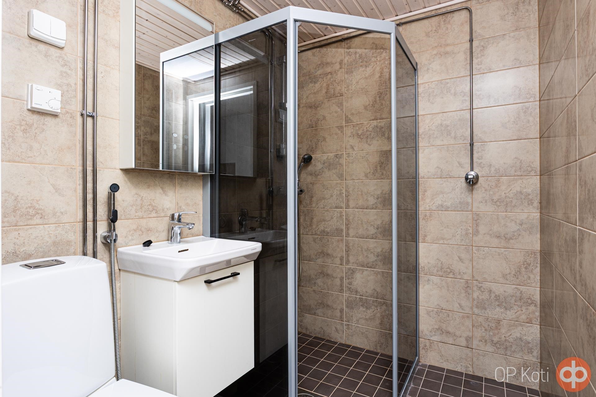 - Kylpyhuone, suihku, suihkuseinä, peilikaappi, allaskaappi, pesukoneliitäntä, lattialämmitys, kiinteät valaisimet. Kylpyhuone remontoitu täysin kalusteineen 2017. Samalla asennettu tilaan lattialämmitys.