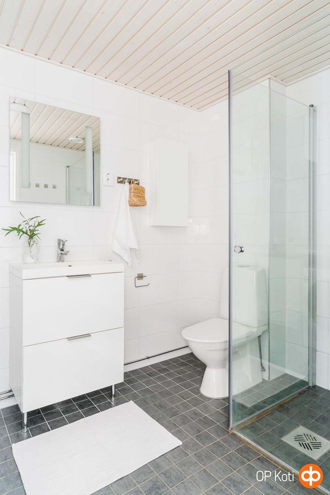 - Kylpyhuone, suihku, peilit, kaapit, allaskaappi, pesukoneliitäntä, lattialämmitys sähkötoiminen mukavuuslattialämmitys, kiinteät valaisimet.