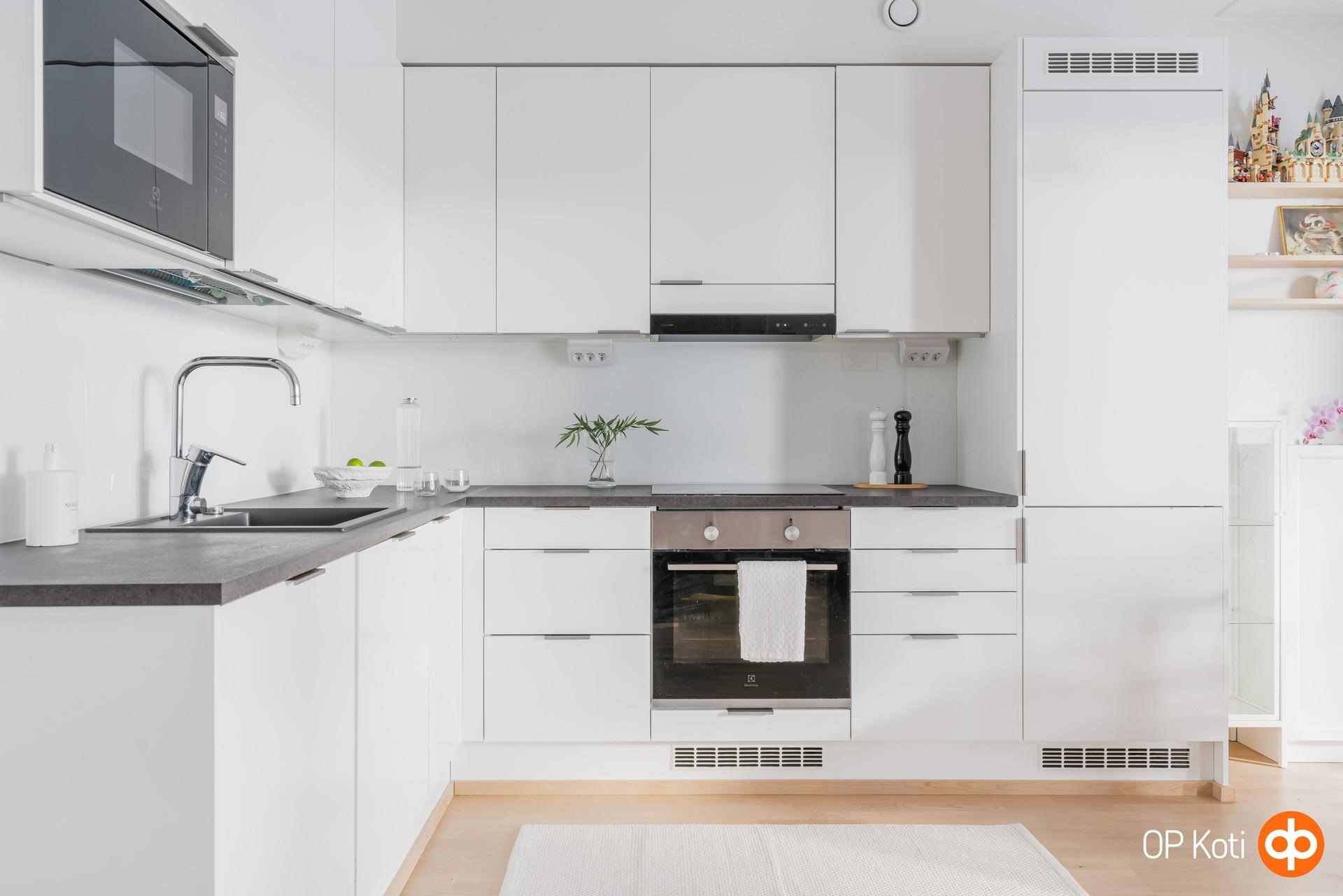 - Jääkaappipakastin, erillisuuni, liesitaso induktio, liesituuletin, mikroaaltouuni integroitu, astianpesukone integroitu, kaapistot, kiinteät valaisimet.