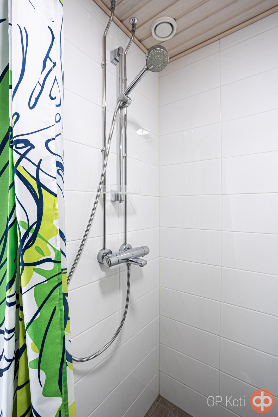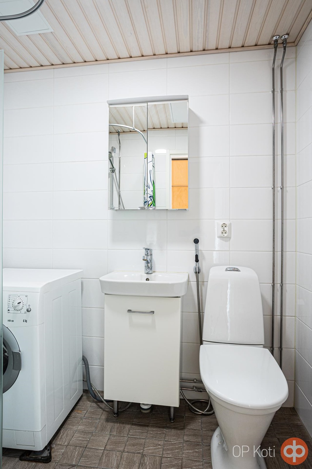 - Kylpyhuone, suihku, suihkuseinä, peilit, peilikaappi, kaapit, allaskaappi, pesukoneliitäntä, lattialämmitys, kiinteät valaisimet.