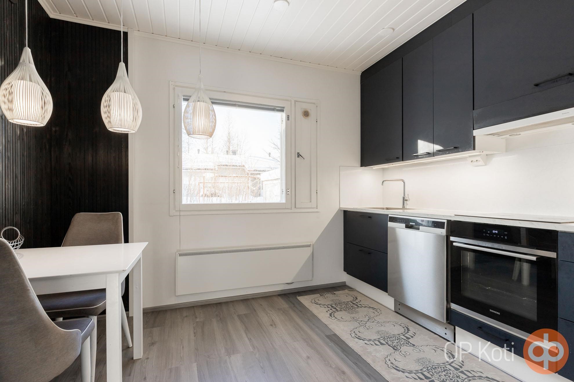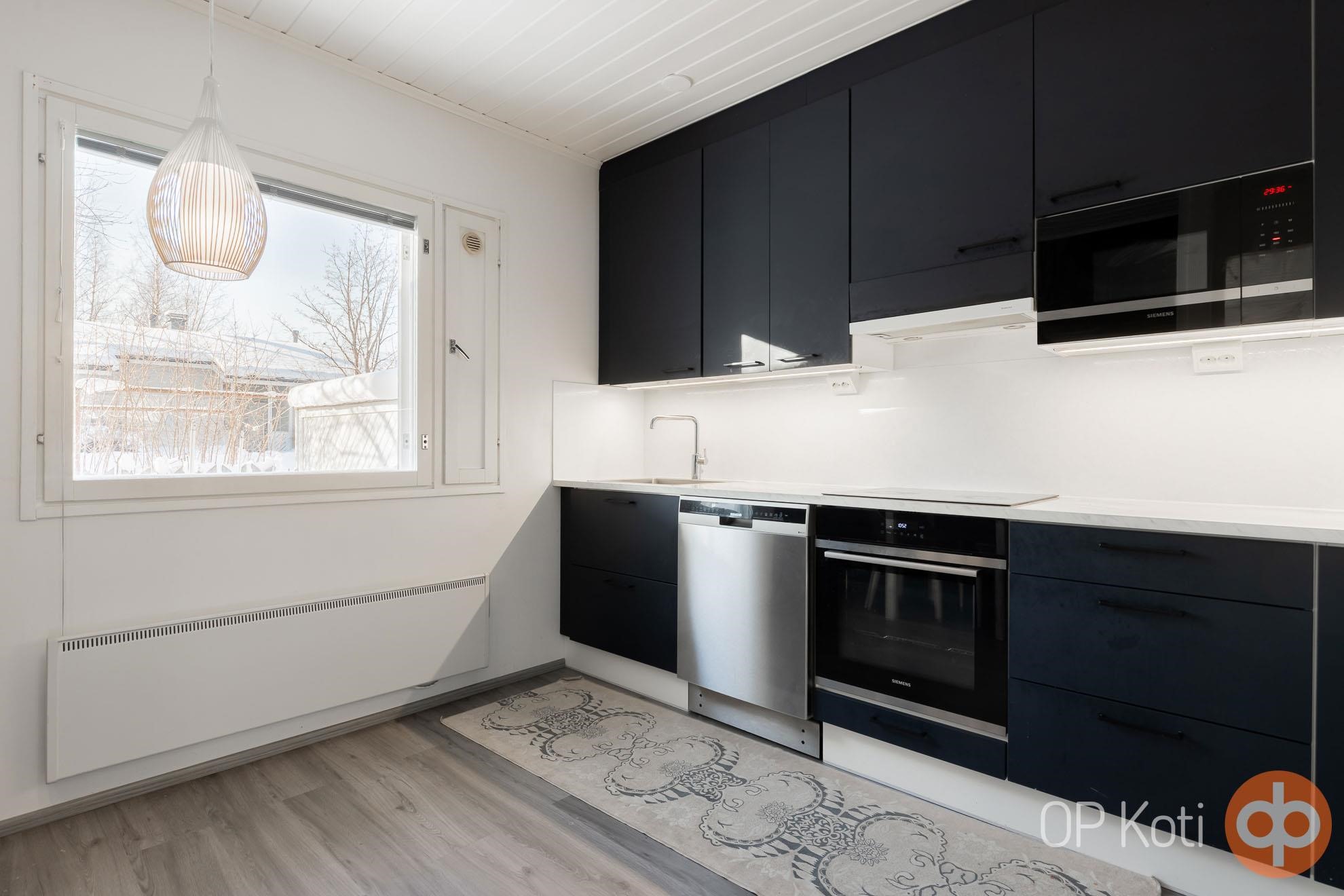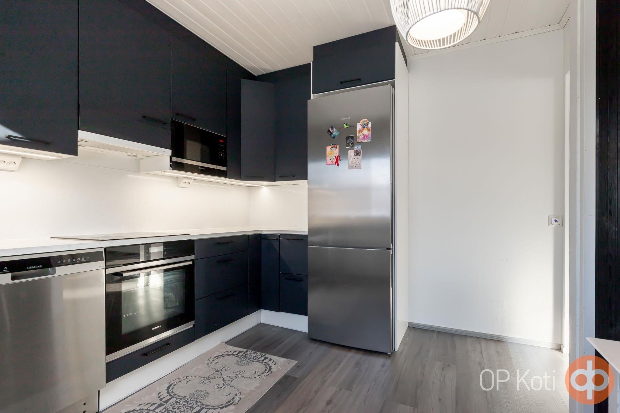 - Jääkaappipakastin, erillisuuni, induktioliesi, liesikupu, mikroaaltouuni, astianpesukone, kaapistot, kiinteät valaisimet.