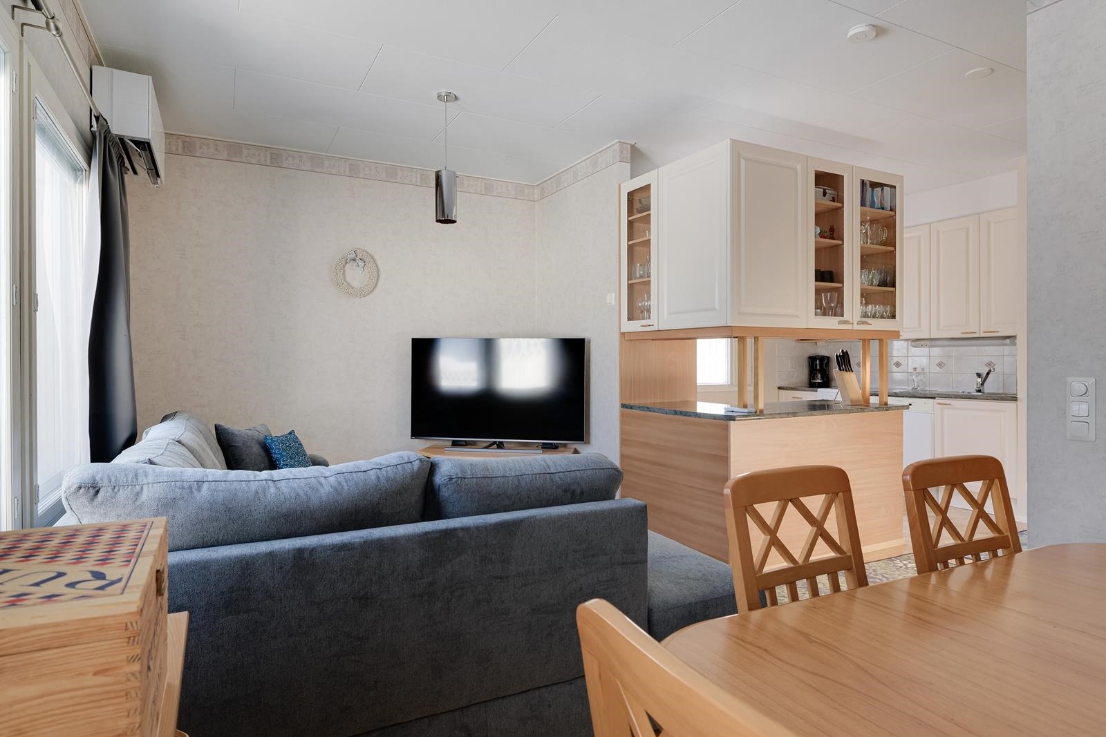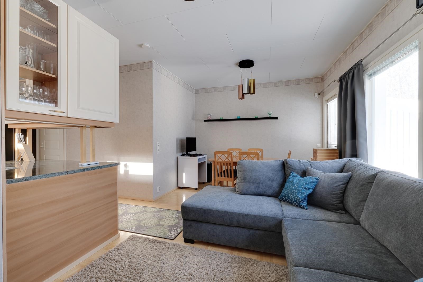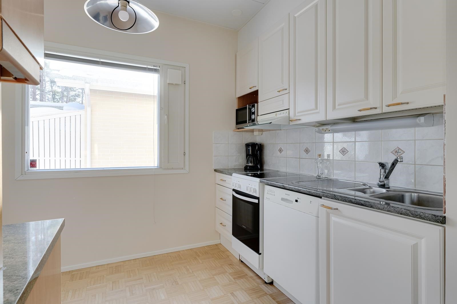 - Jääkaappipakastin, keraaminen liesi, liesituuletin, astianpesukone, kaapistot, kiinteät valaisimet.