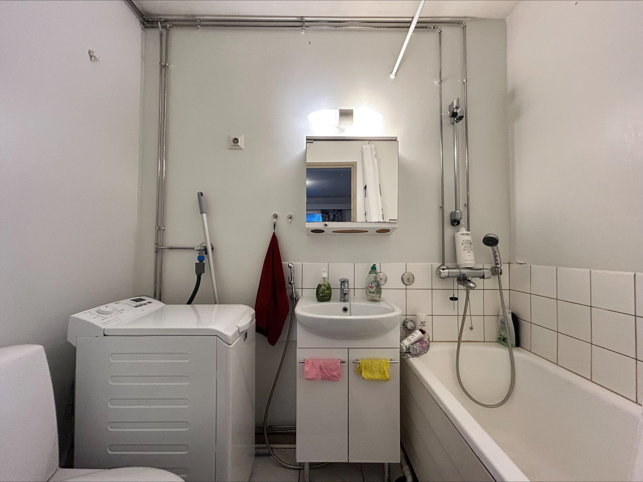 - Kylpyhuone, suihku, amme, peilikaappi, allaskaappi, pesukoneliitäntä, kiinteät valaisimet.