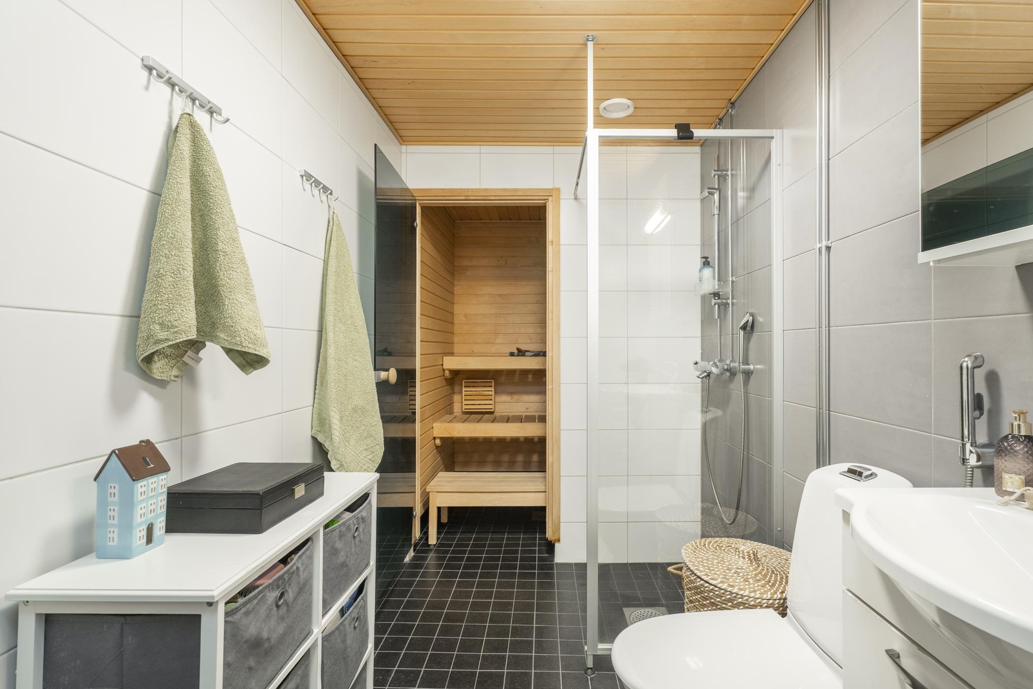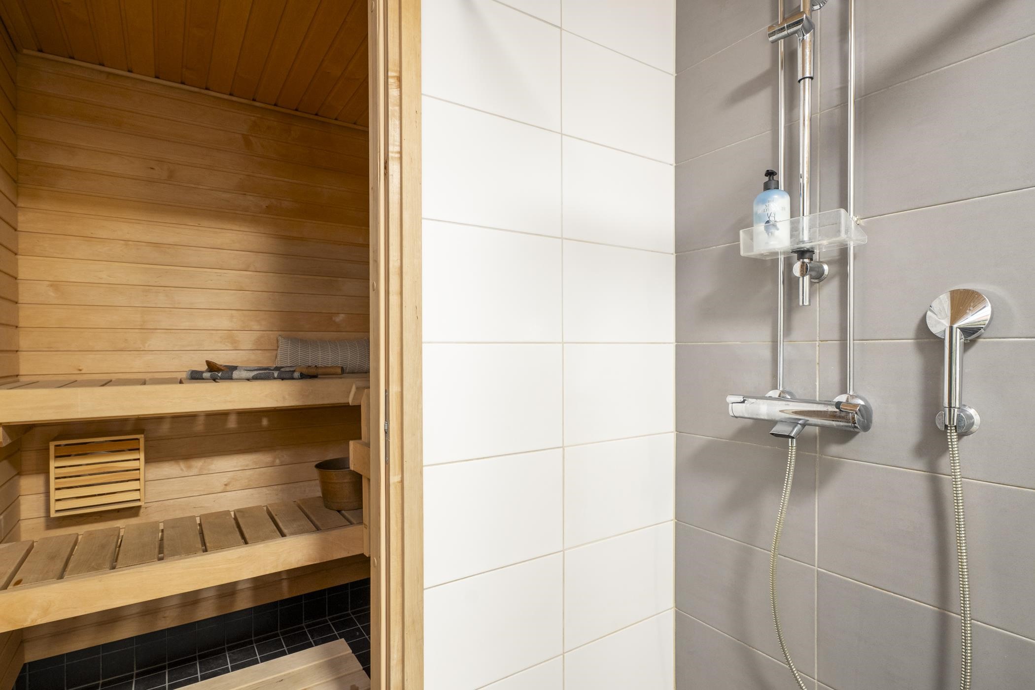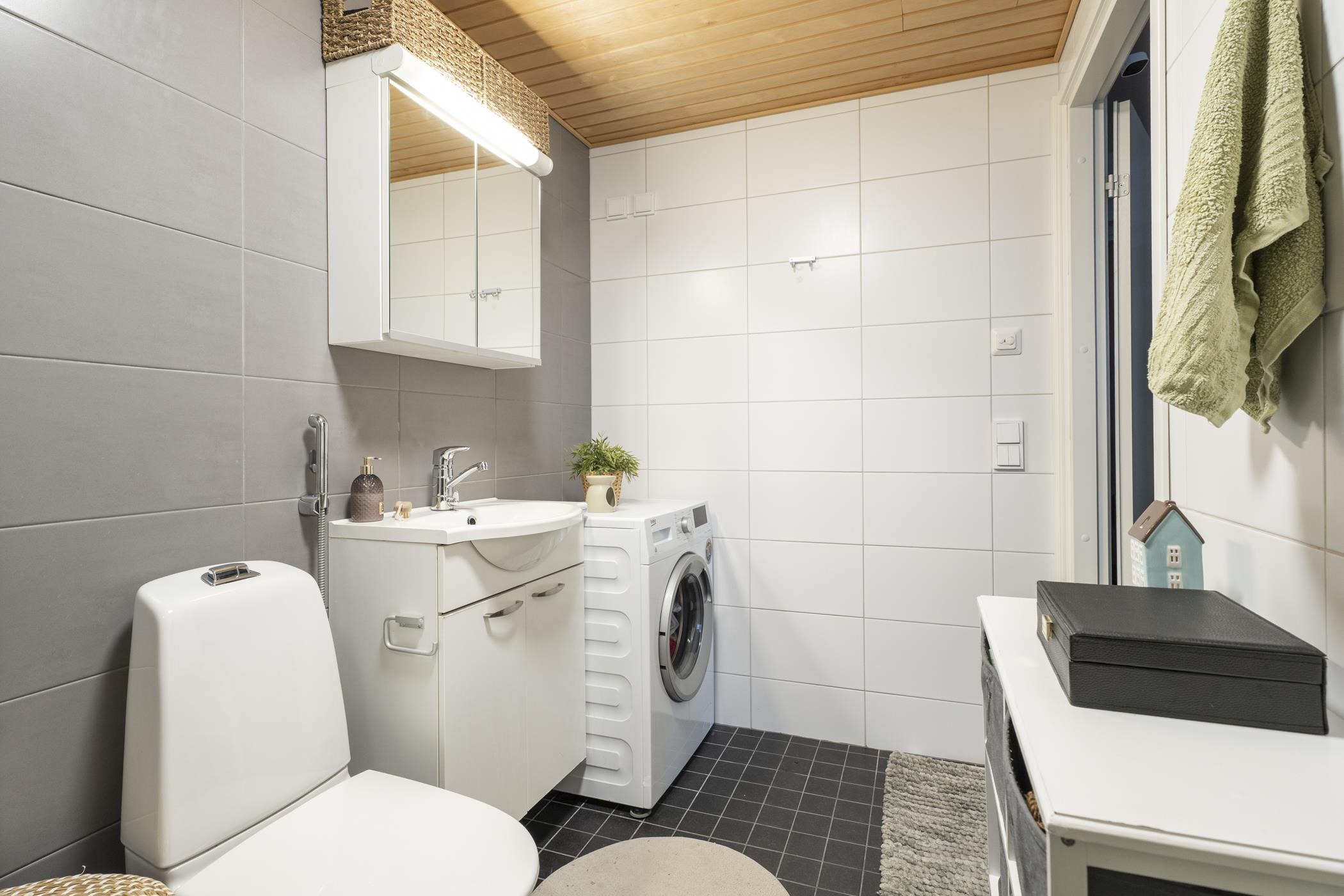 - Saunassa sähkökiuas Kylpyhuoneessa suihku, suihkuseinä, peilikaappi, allaskaappi, pesukoneliitäntä, lattialämmitys, kiinteät valaisimet.