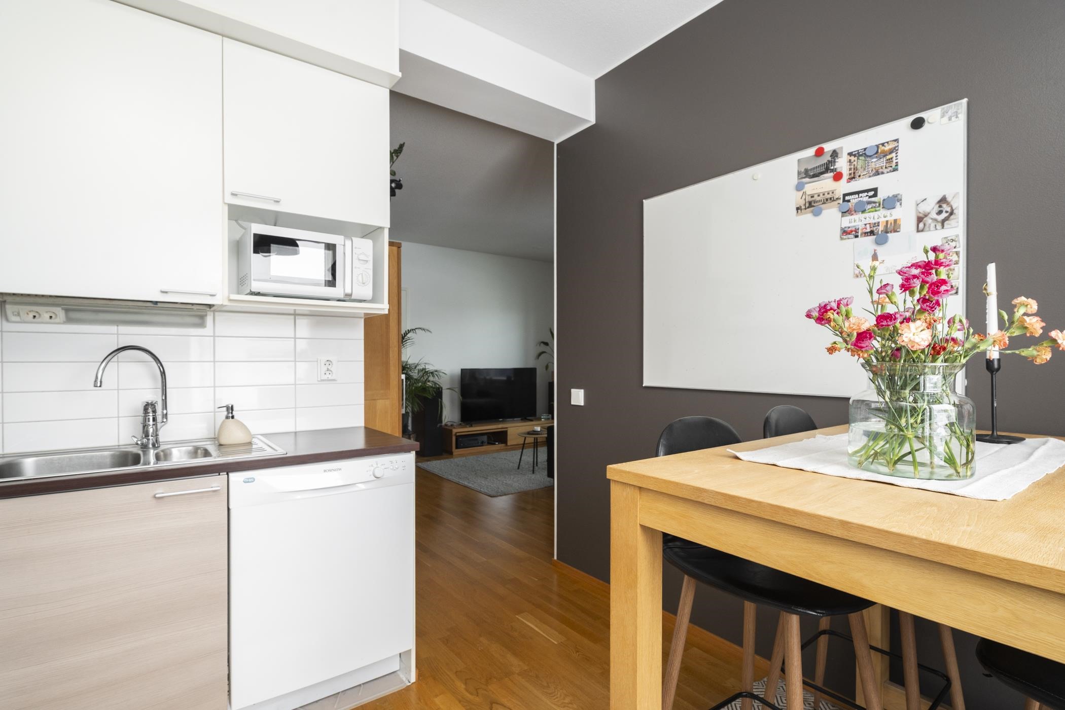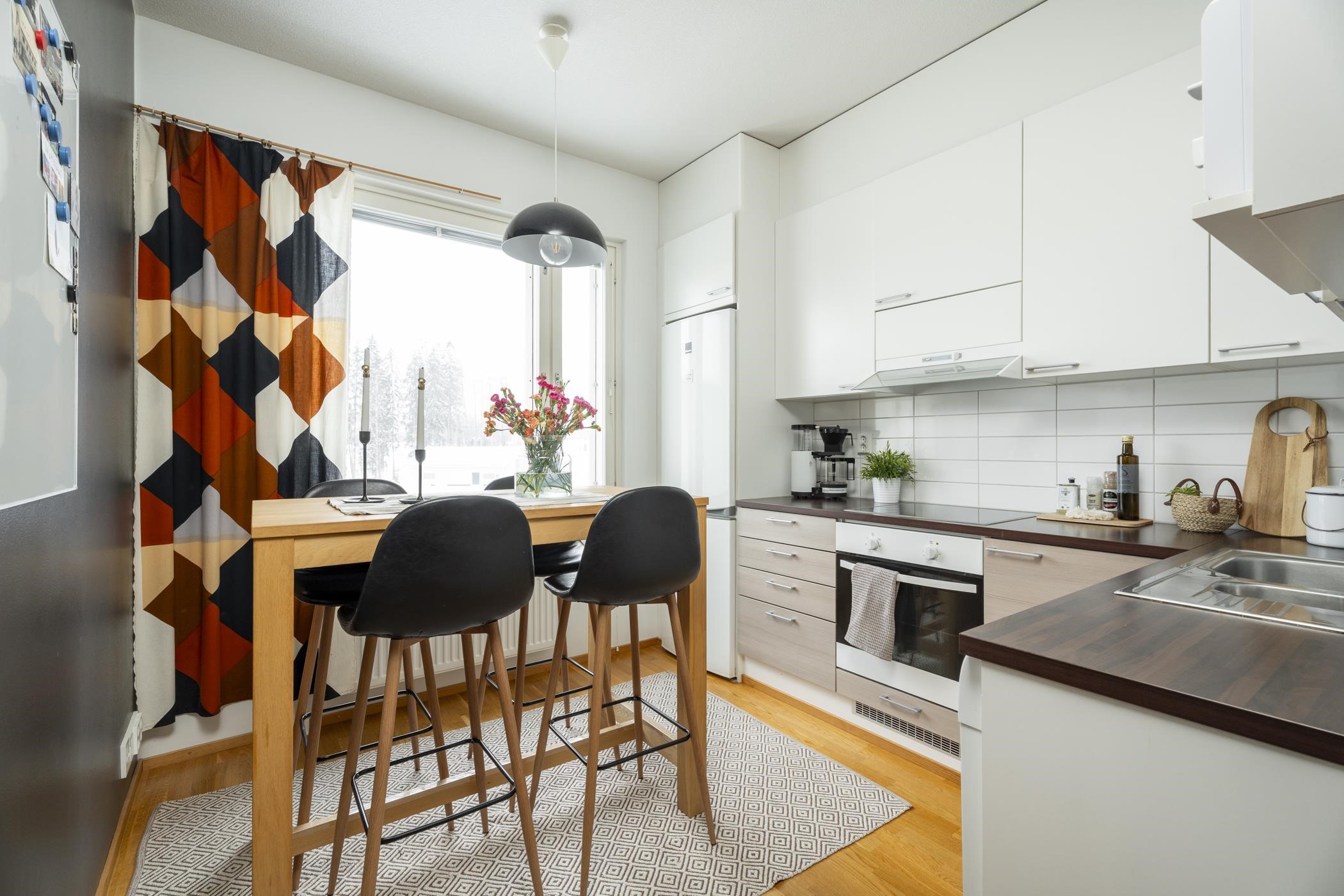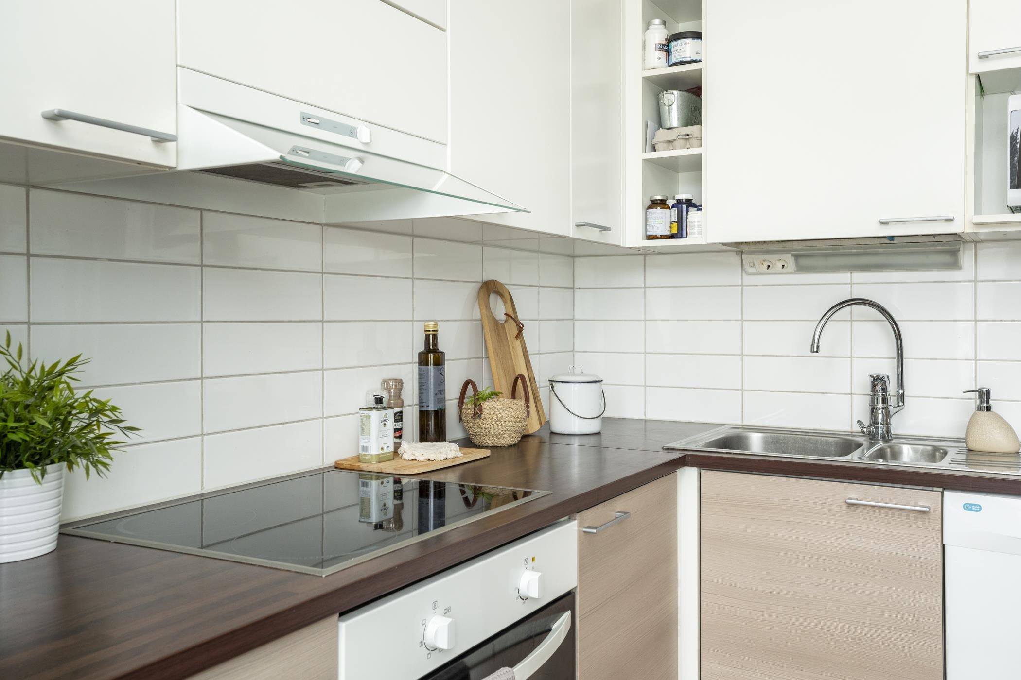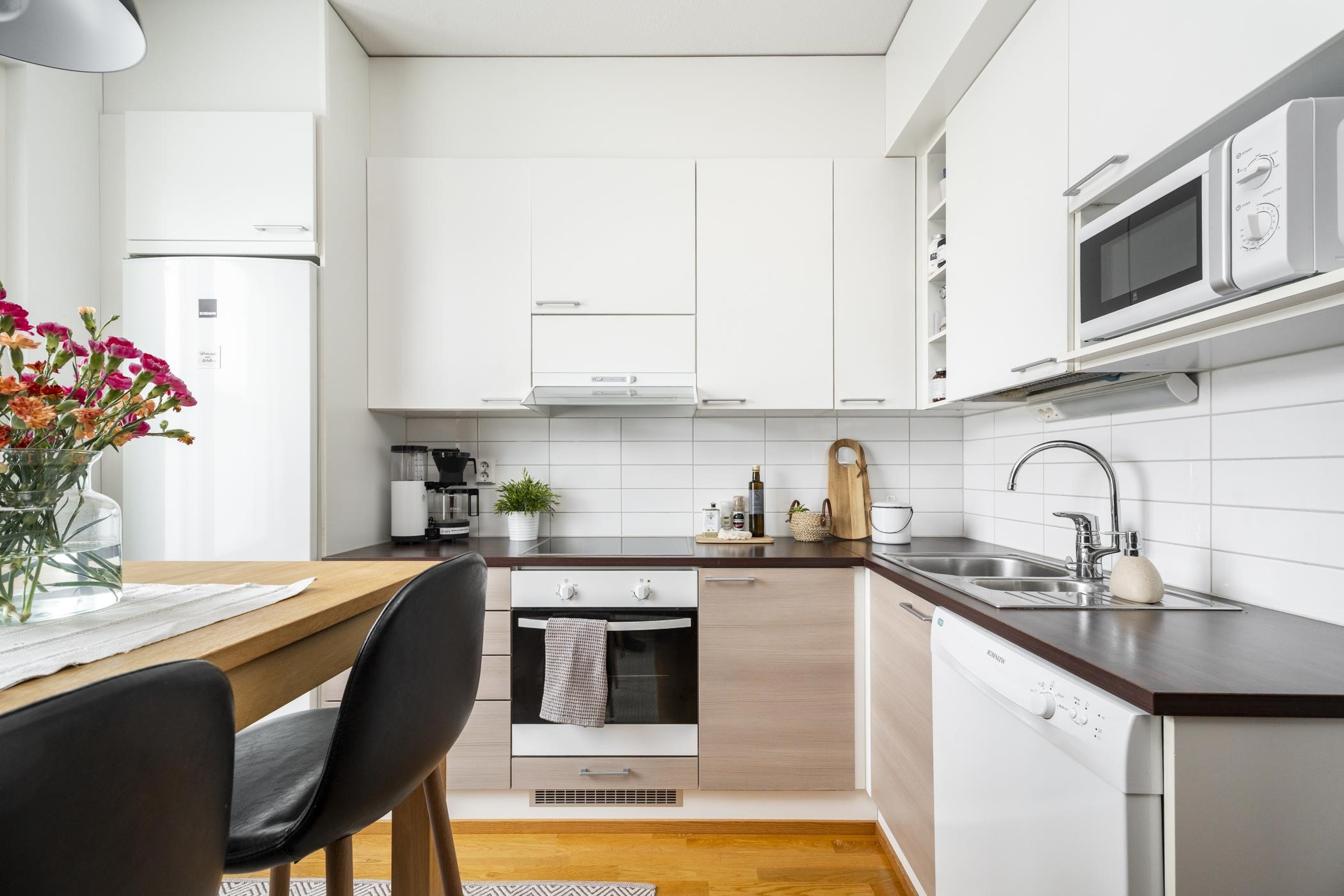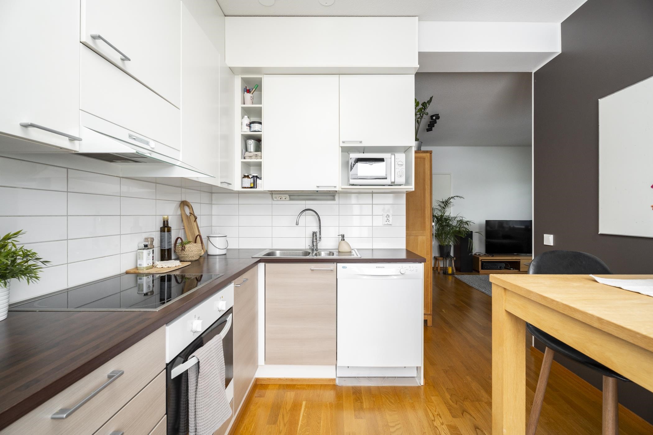 - Jääkaappipakastin, kiertoilmaerillisuuni, induktioliesitaso, liesituuletin, astianpesukone, kaapistot, kiinteät valaisimet.