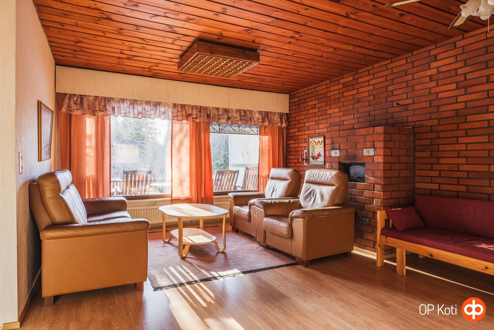 Keittiö: seinät maali, lattia parketti. Olohuone: tiiliseinä/tapetti, lattia parketti. Makuuhuone 1: seinät tapetti, lattia muovimatto. Makuuhuone 2: seinät maali, lattia muovimatto. Makuuhuone 3: seinät tapetti, lattia muovimatto. Kodinhoitohuone: /pukuhuone: seinät maali, lattia muovimatto. Sauna: seinät paneeli, lattia laatoitettu. Kylpyhuone: seinät ja lattia laatoitettu. Eteinen: seinät maali, lattia parketti. Wc: x 2 seinät maali, lattia muovimatto. Tuulikaappi: seinät maali, lattia laatta.