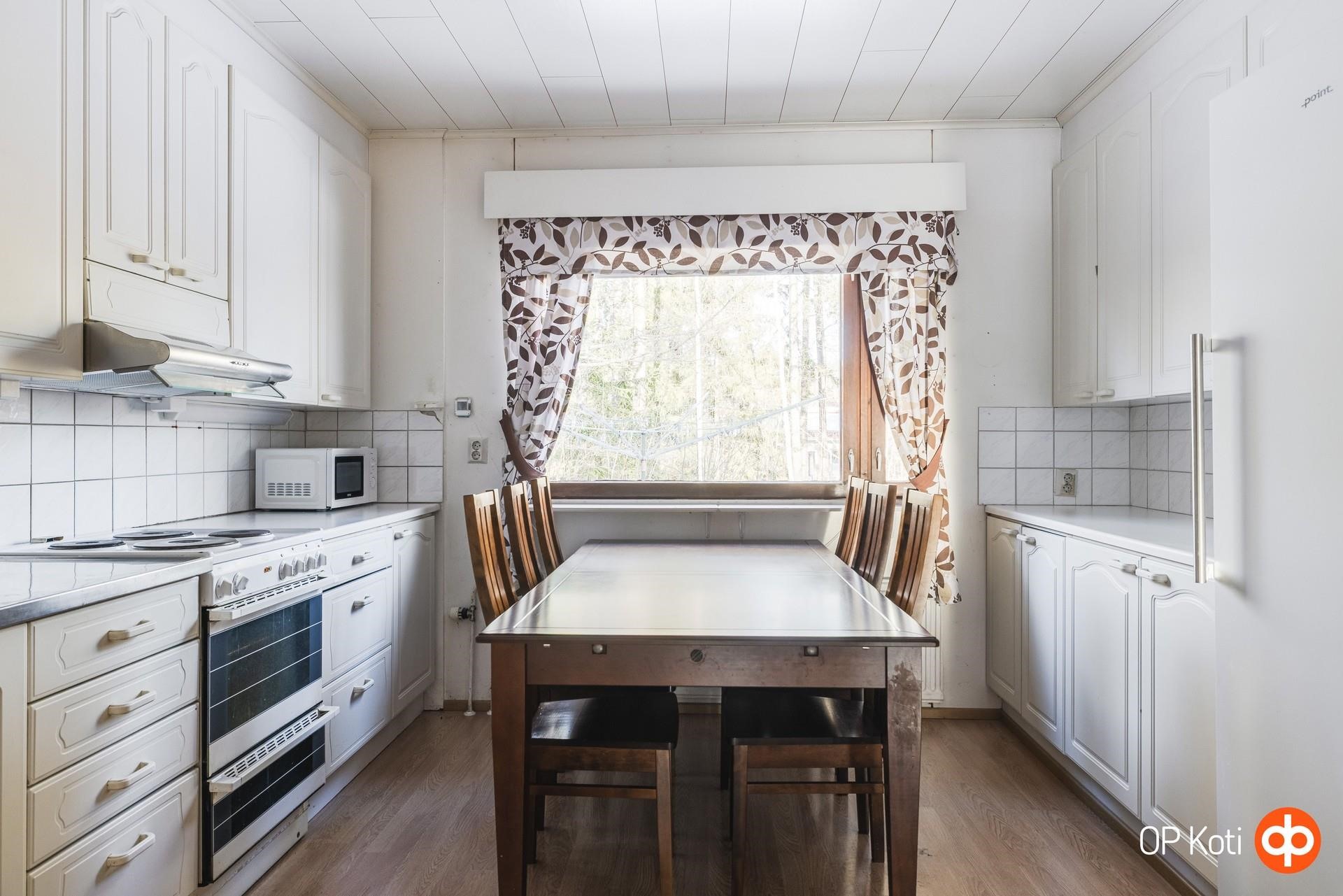 - Jääkaappi, kylmiö, sähköliesi, liesituuletin, leivinuuni olohuoneessa, mikroaaltouuni asiakkaan halutessa, kaapistot, kiinteät valaisimet, pöytätasojen materiaali laminaatti.