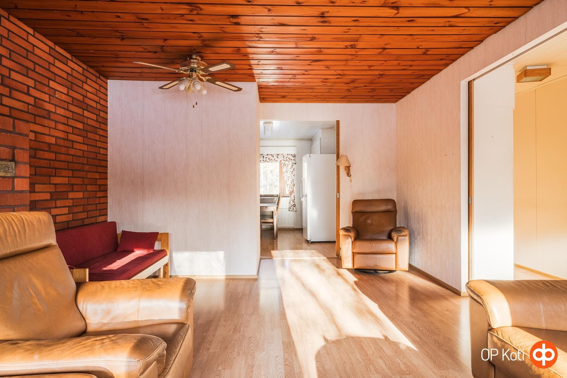 Asuintilat muodostuvat valoisasta olohuoneesta, toimivasta keittiöstä, kolmesta makuuhuoneesta, kodinhoitotilasta, kahdesta wc:stä sekä noin 10 vuotta sitten remontoidusta kylpyhuoneesta ja saunasta. Olohuoneessa on leivinuuni. Kohteen pinnat kaipaavat päivitystä.