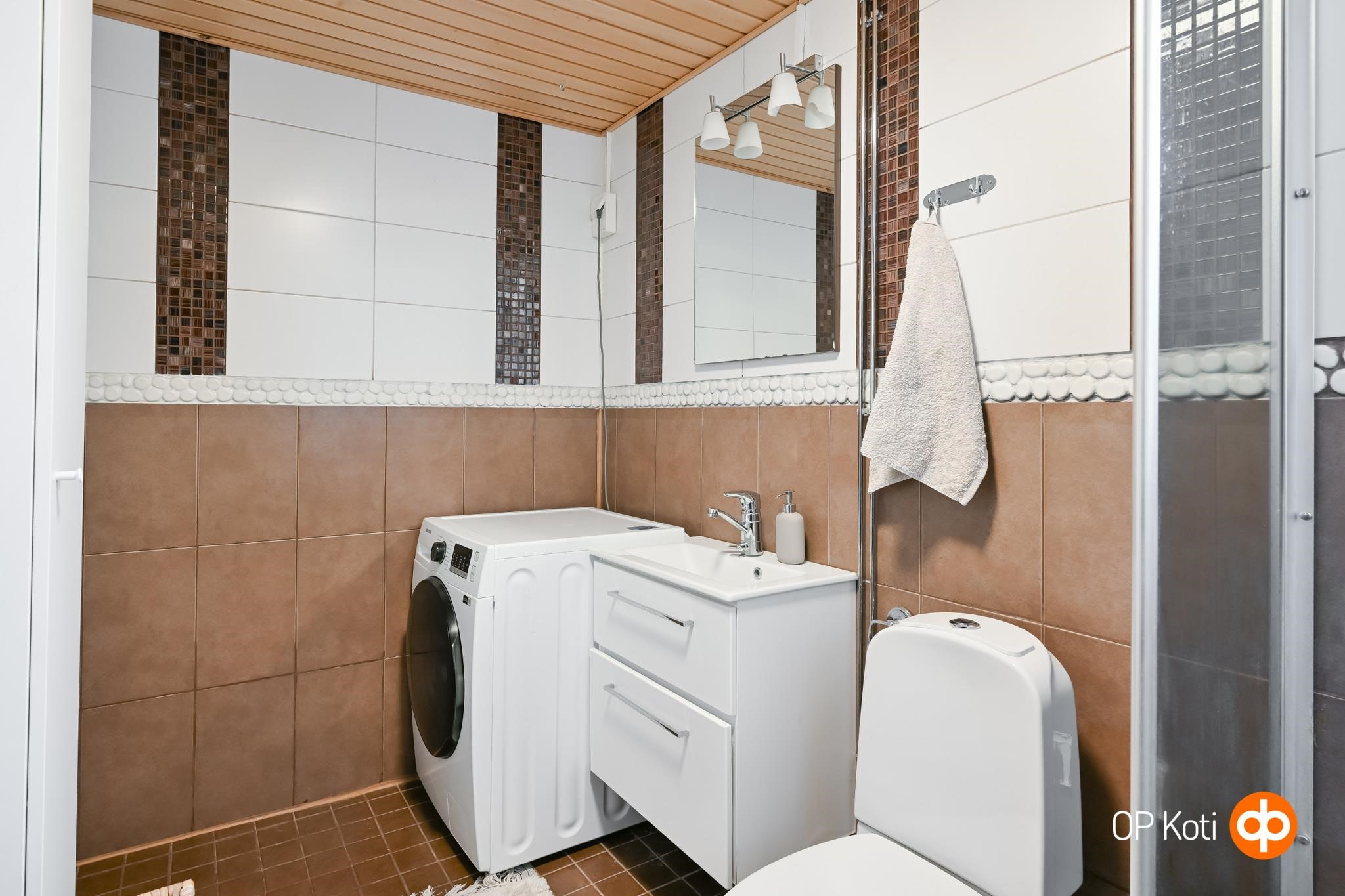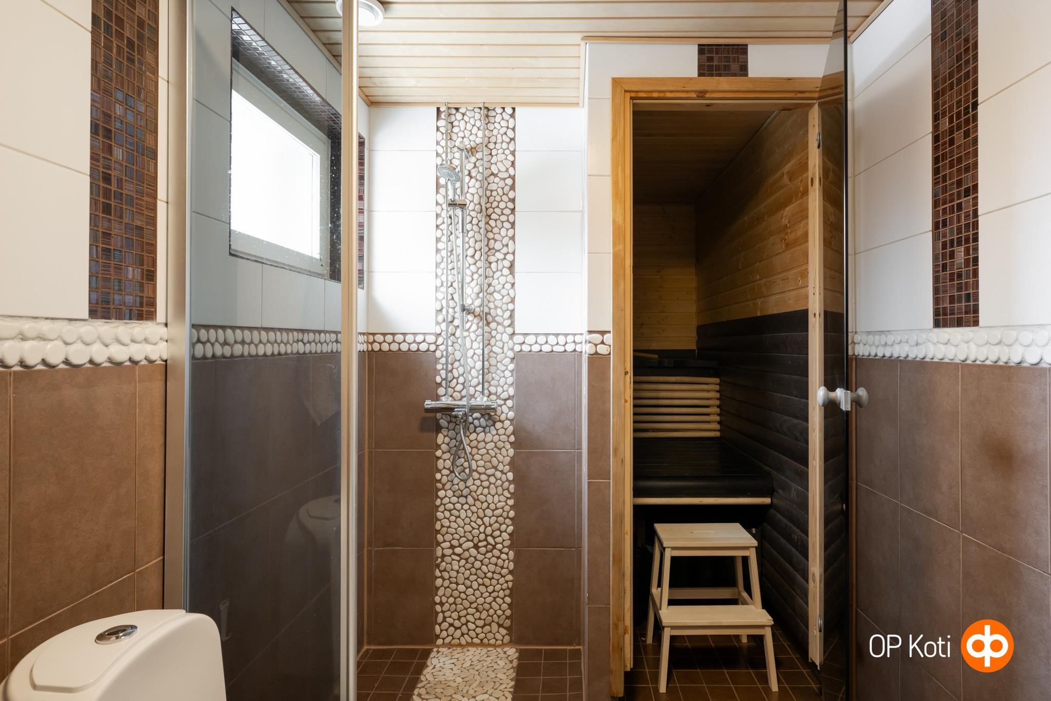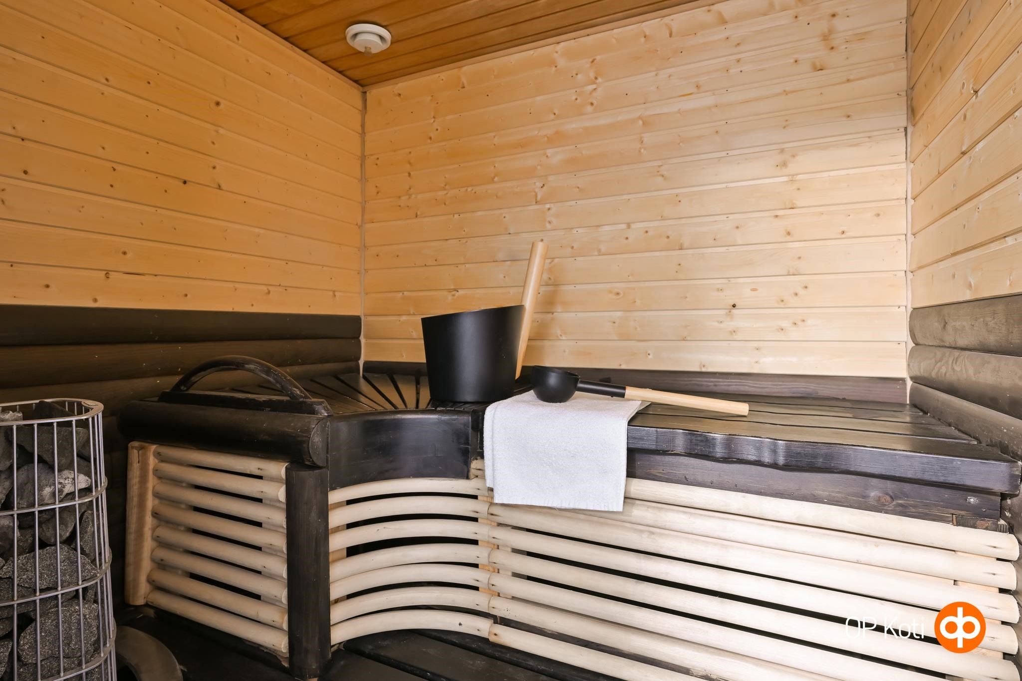 - Sauna, sähkökiuas, kylpyhuone, erillinen wc, suihku, peilikaappi, allaskaappi, pesukoneliitäntä, kiinteät valaisimet. Kylpyhuoneessa vesikiertoinen lattialämmitys