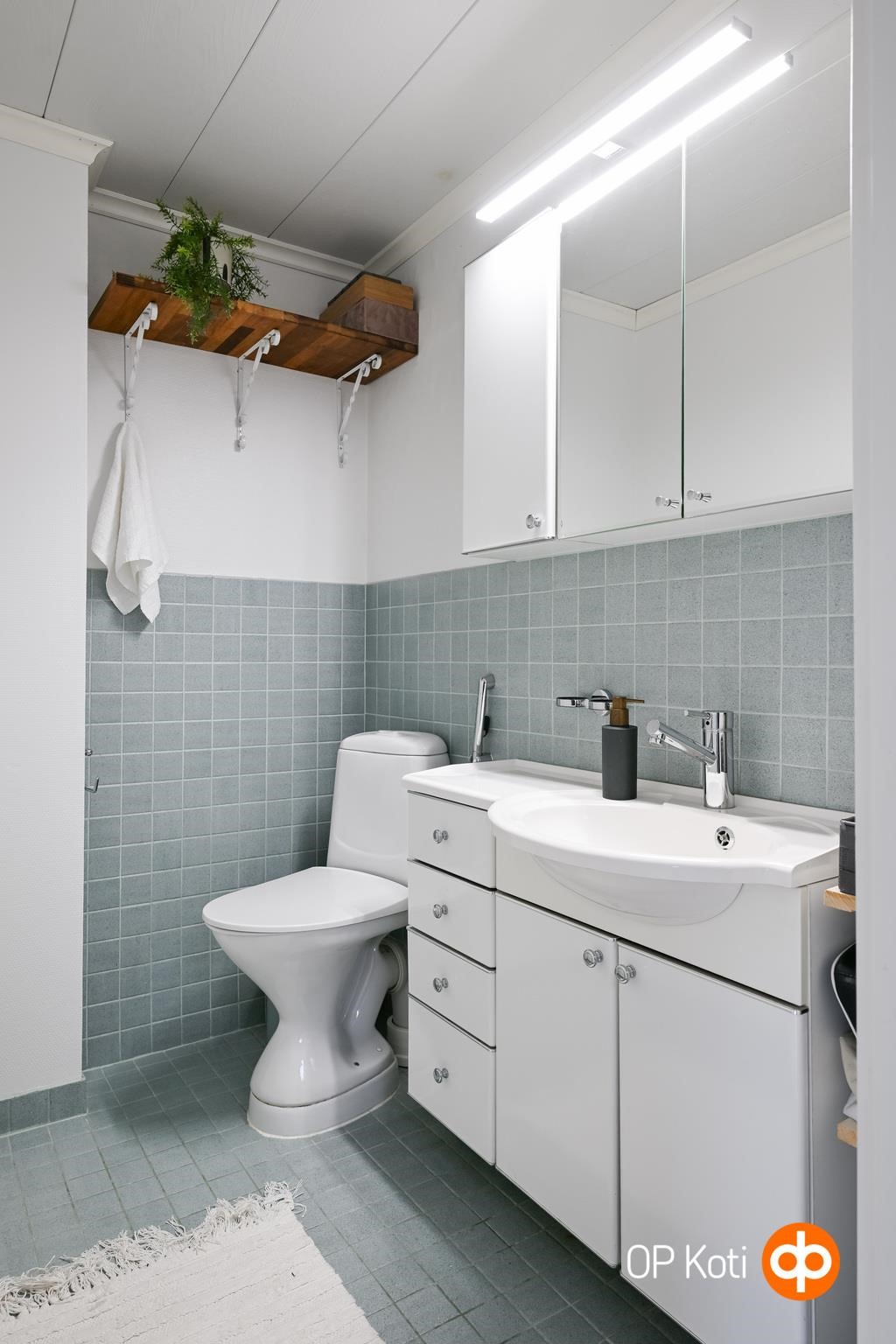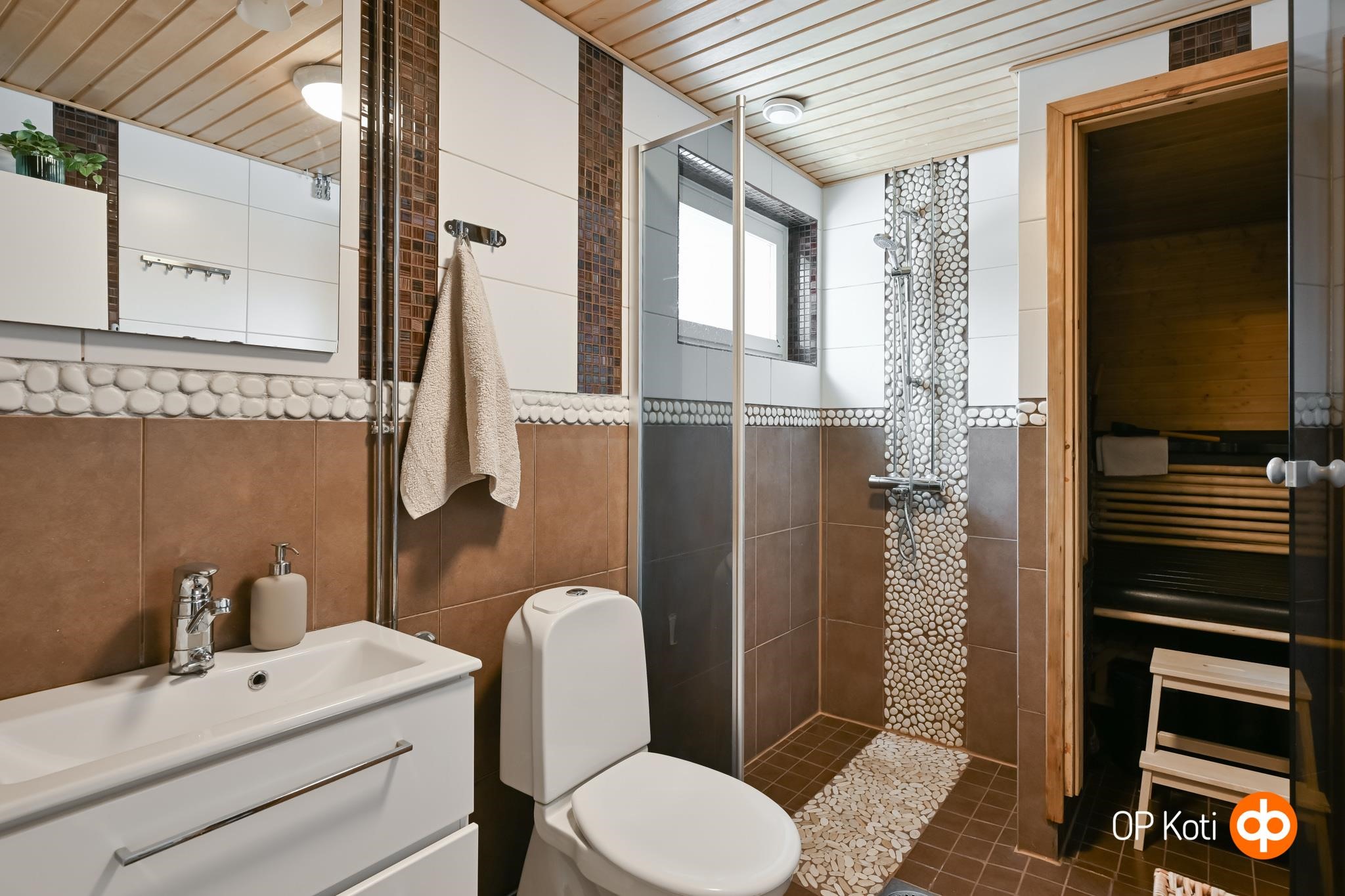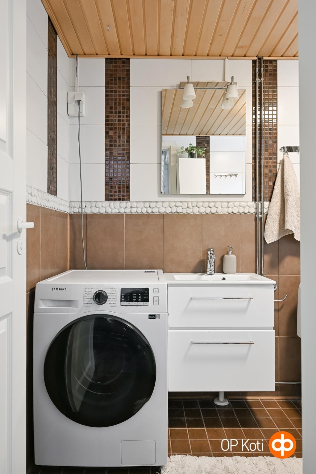 - Sauna, sähkökiuas, kylpyhuone, erillinen wc, suihku, peilikaappi, allaskaappi, pesukoneliitäntä, kiinteät valaisimet. Kylpyhuoneessa vesikiertoinen lattialämmitys