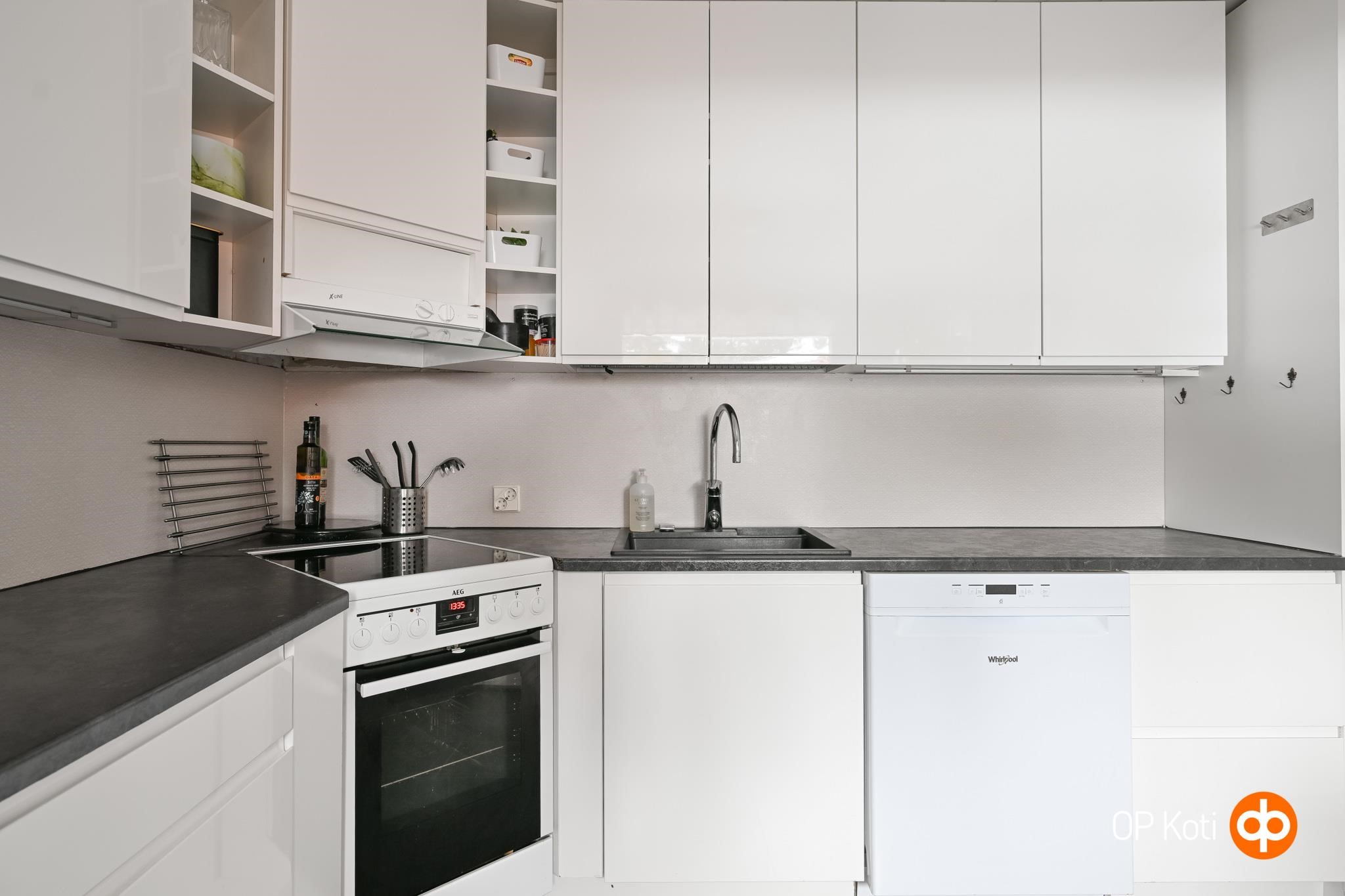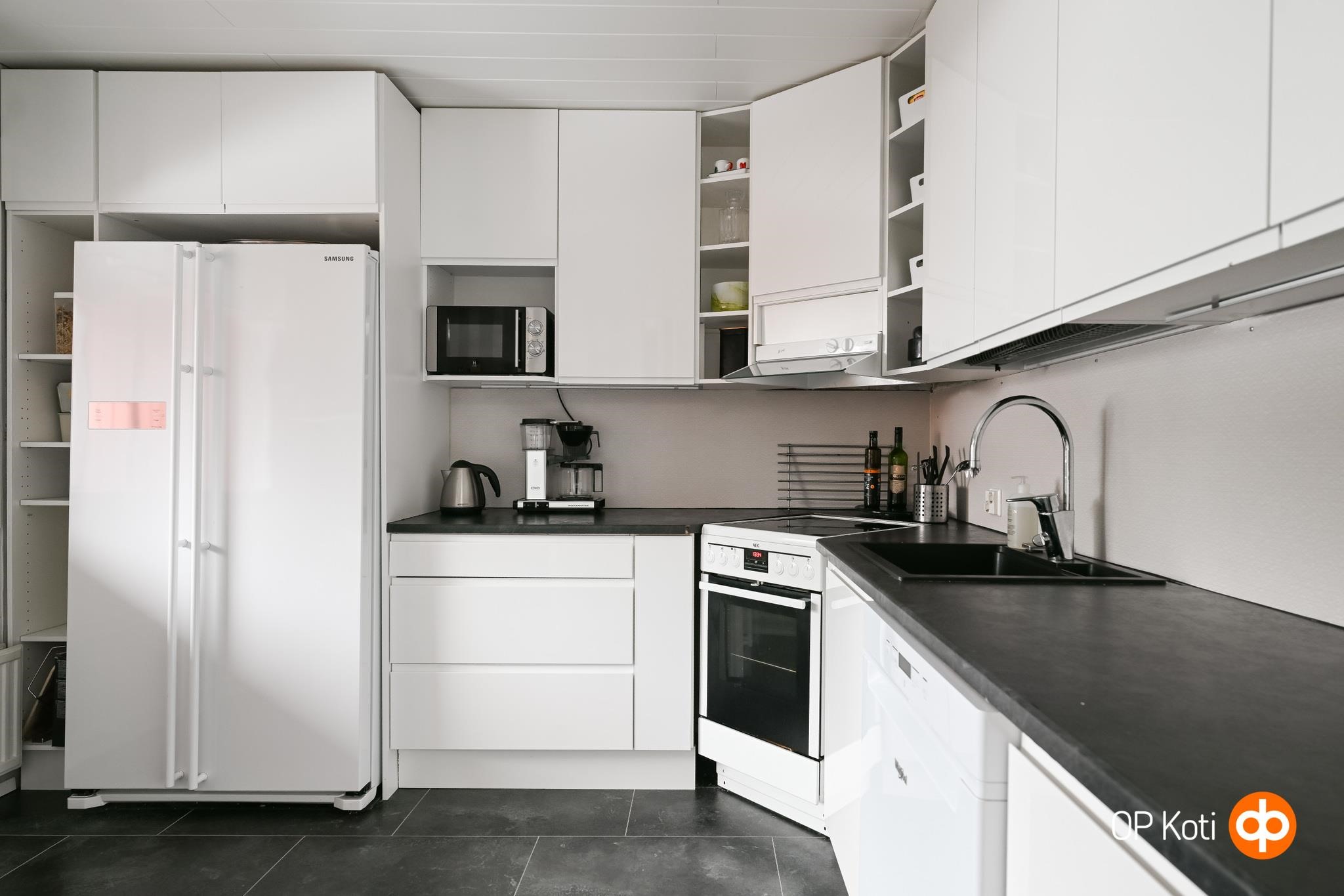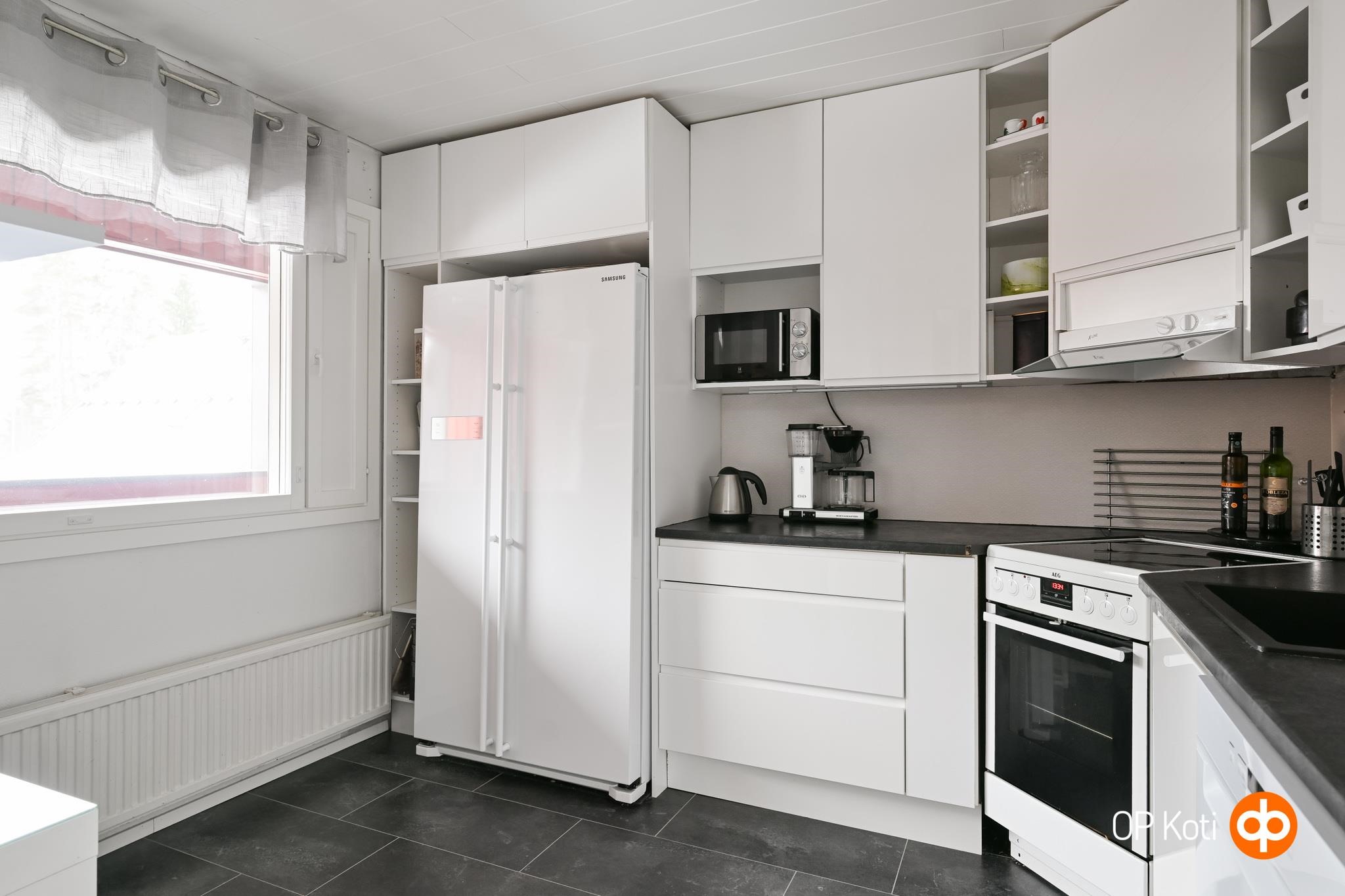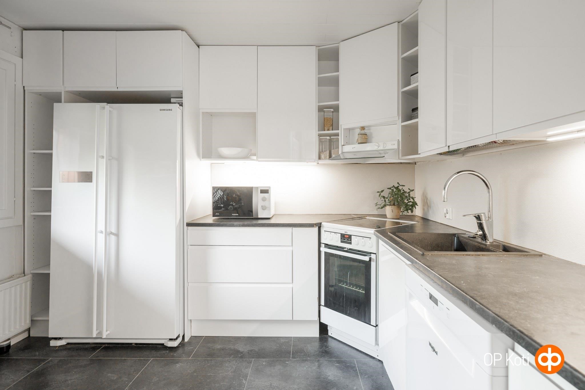 - Jääkaappipakastin, erillisuuni, keraaminen liesi, liesituuletin, astianpesukone, kiinteät valaisimet.