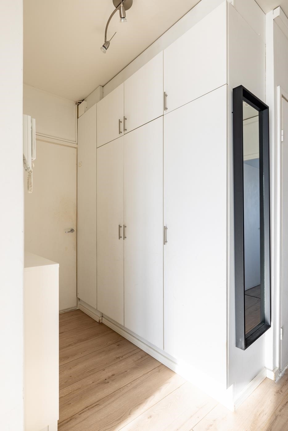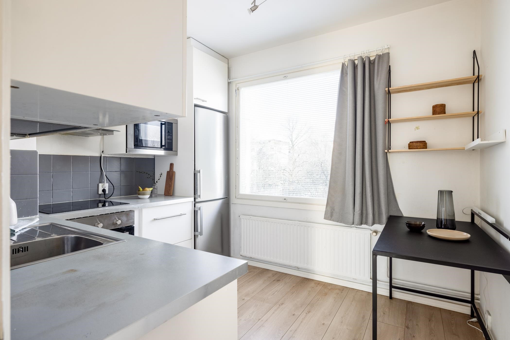 Huoneisto on selkeä ja toimiva kokonaisuus: kaksi huonetta ja keittiö, jossa varustelu on nykyaikainen ja kattava. Induktioliesi, astianpesukone, mikroaaltouuni sekä jääkaappipakastin tekevät ruoanlaitosta mutkatonta. Vehreä näkymä keittiön ikkunoista kohti pientä rinteellä olevaa puistoa, joka tarjoaa miellyttävää vihreyttä suurimman osan vuodesta. Asunnon molempien puolien näkymät ovat hyvin avarat, antaen asunnolle enemmän avoimuutta, valoa ja yksityisyyttä verrattuna moniin kaupunkiasuntoihin. Keittiön ja olohuoneen lattiat ovat lämminhenkistä parkettia, kylpyhuoneessa taas käytännöllinen laattalattia ja kaakeloidut seinät. Säilytystilaa löytyy vaatehuoneesta, vintistä sekä jäähdytetystä kellarista, ja asuntoon kuuluu myös pyykinpesukone ja kiinteät valaisimet. Taloyhtiön laajakaista ja kaapeli-tv pitävät arjen sujuvana.