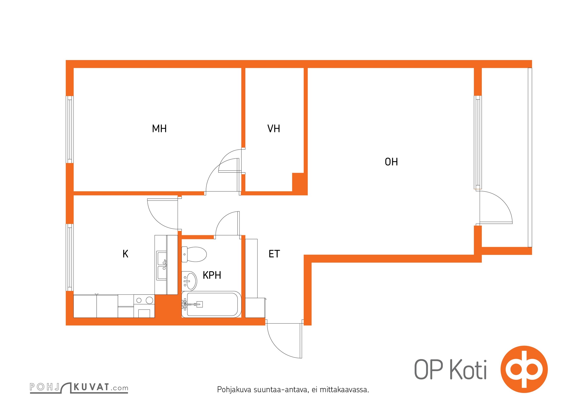 - 55,5 m2Yhtiöjärjestyksen huoneistoselitelmän mukaan huoneisto on 2h+k.
