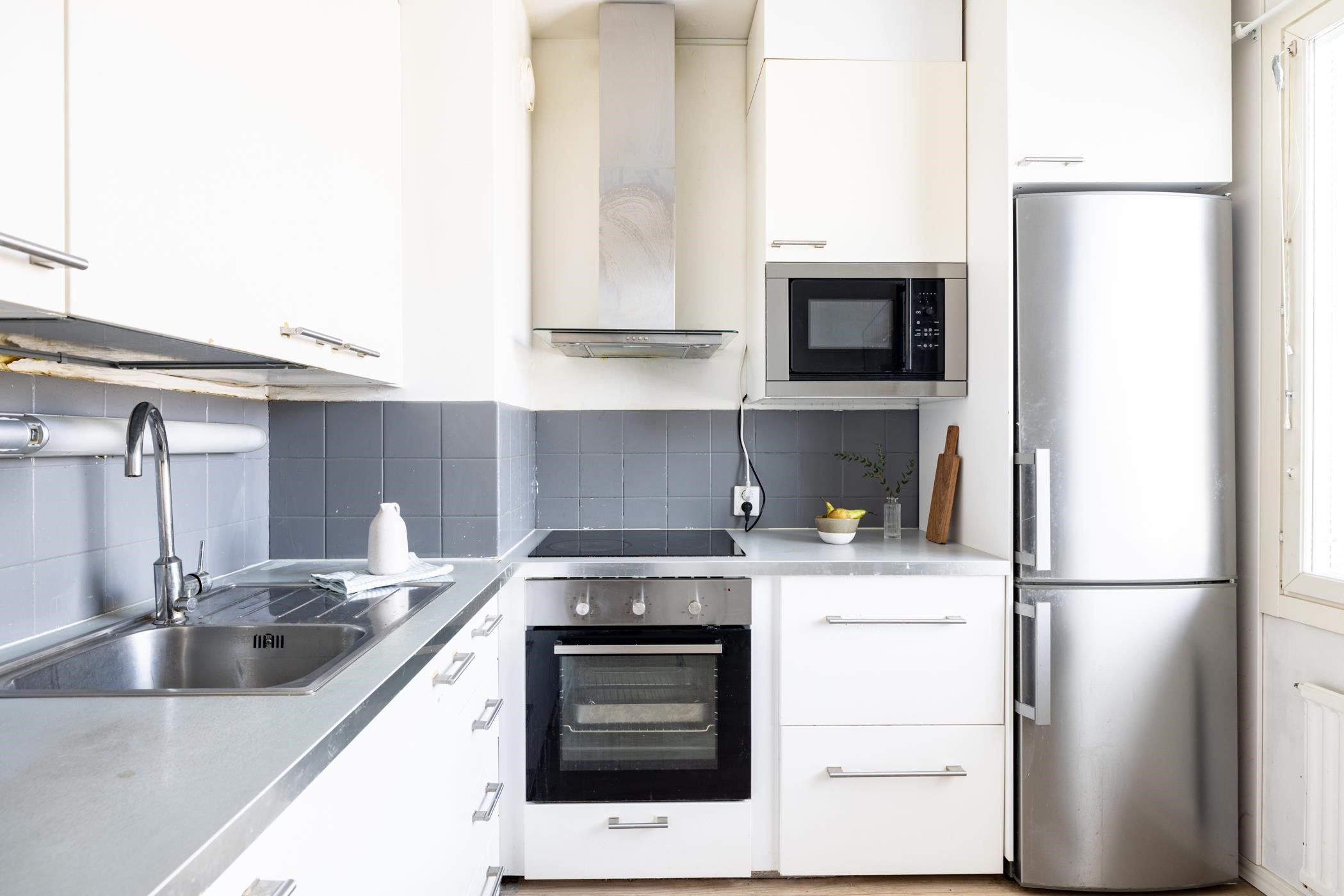 - Keittiön varusteina ovat jääkaappipakastin, erillisuuni, induktioliesi, liesituuletin, mikroaaltouuni, astianpesukone ja kiinteät valaisimet.
