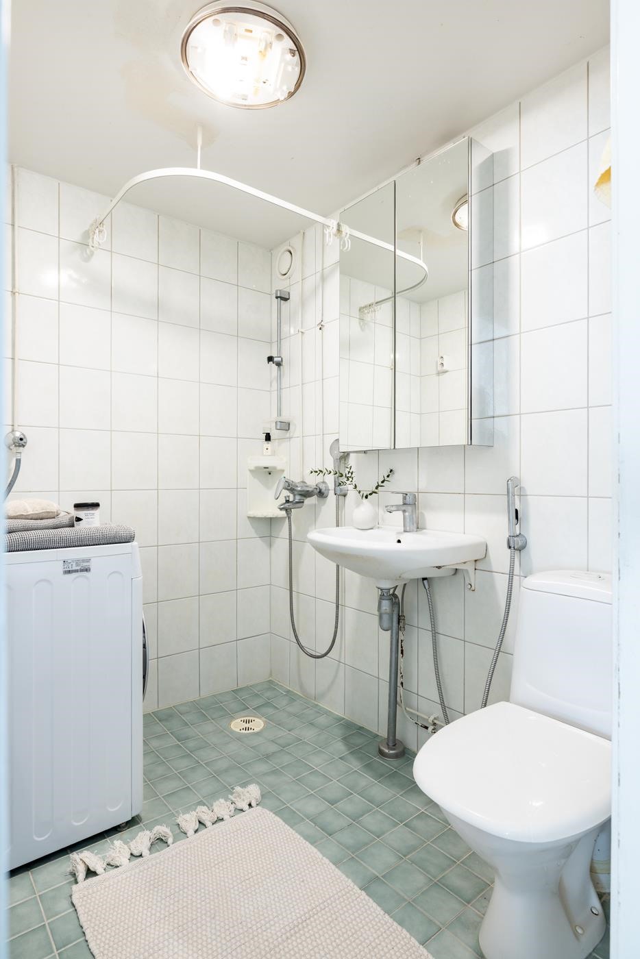 - Kylpyhuoneesta löytyy suihku, peilikaappi, pesukoneliitäntä ja kiinteät valaisimet.