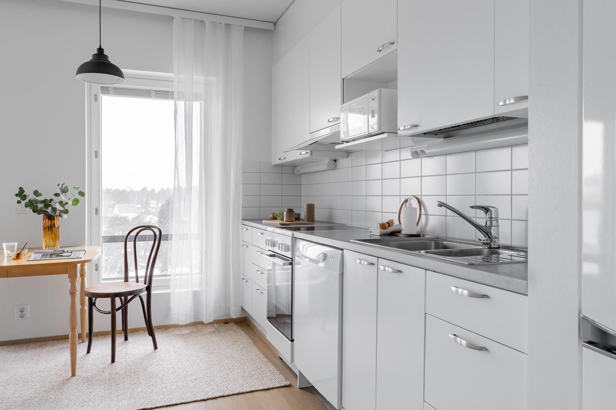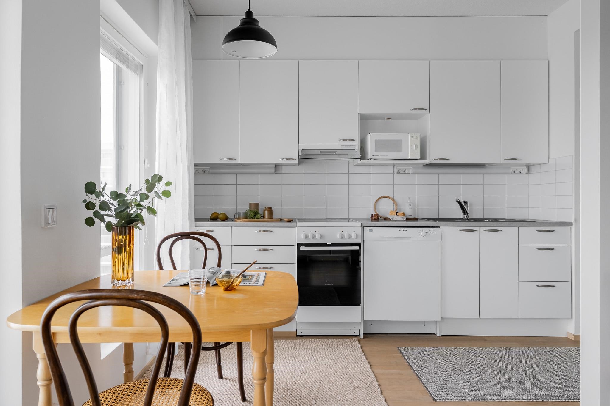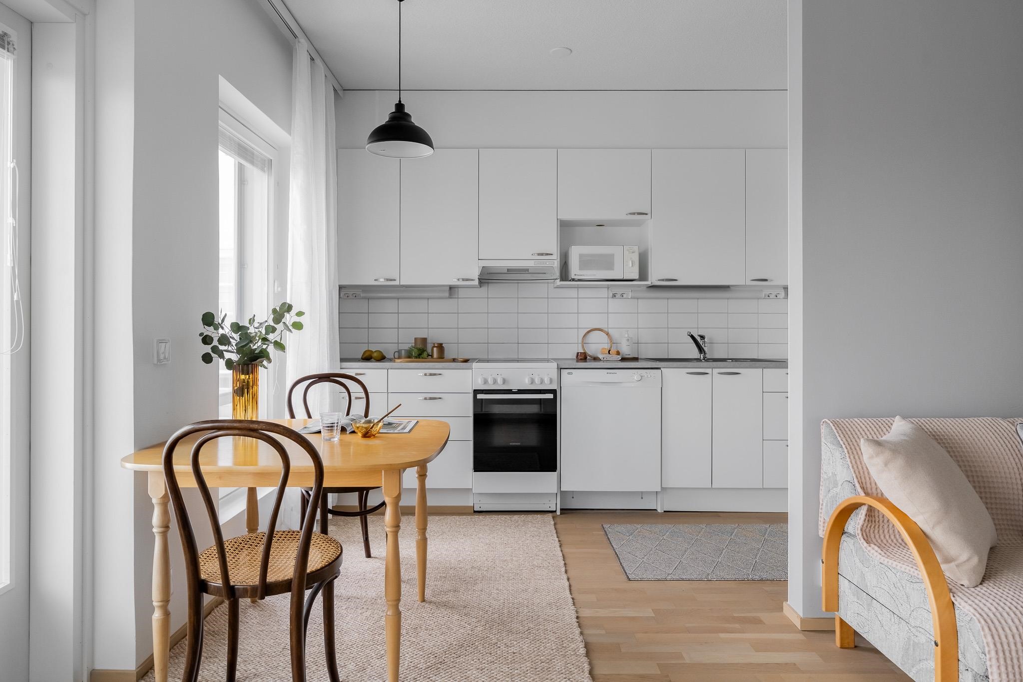 - Jääkaappipakastin, keraaminen liesi, liesituuletin, mikroaaltouuni, astianpesukone, kaapistot, kiinteät valaisimet.