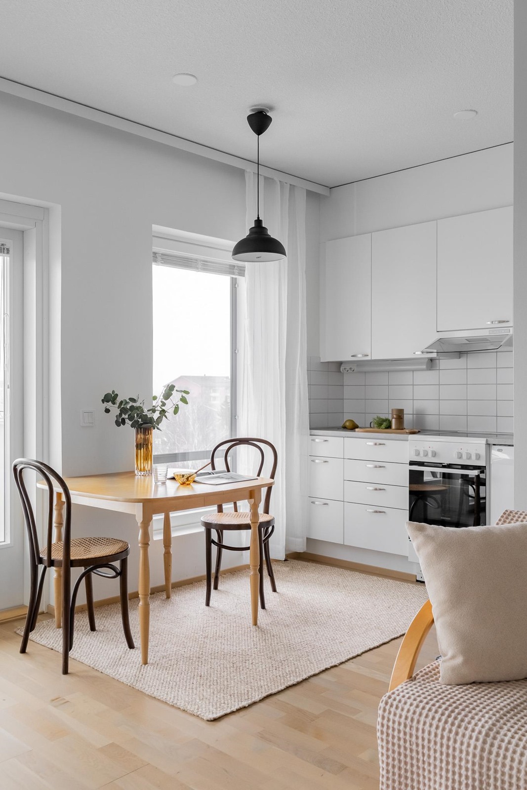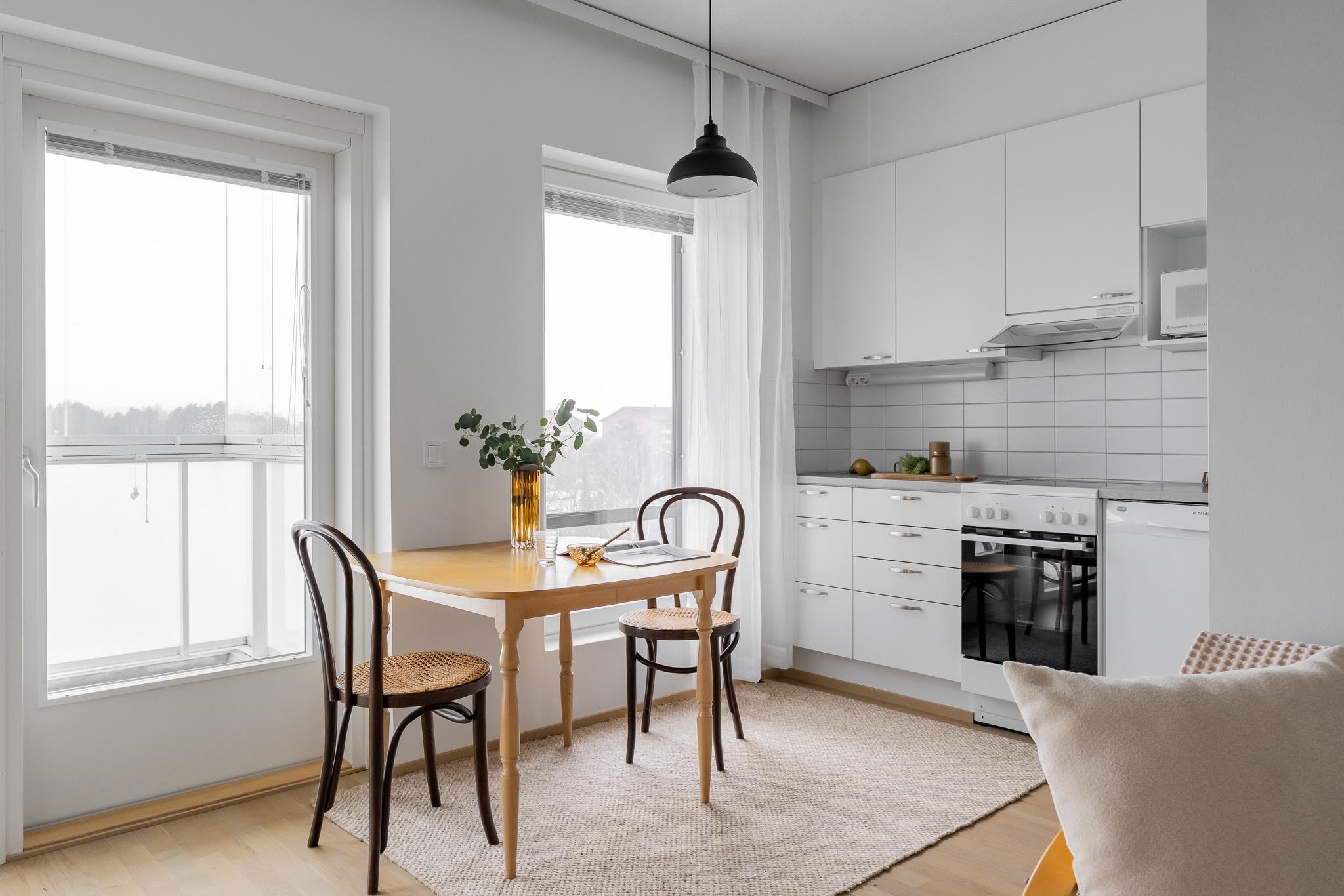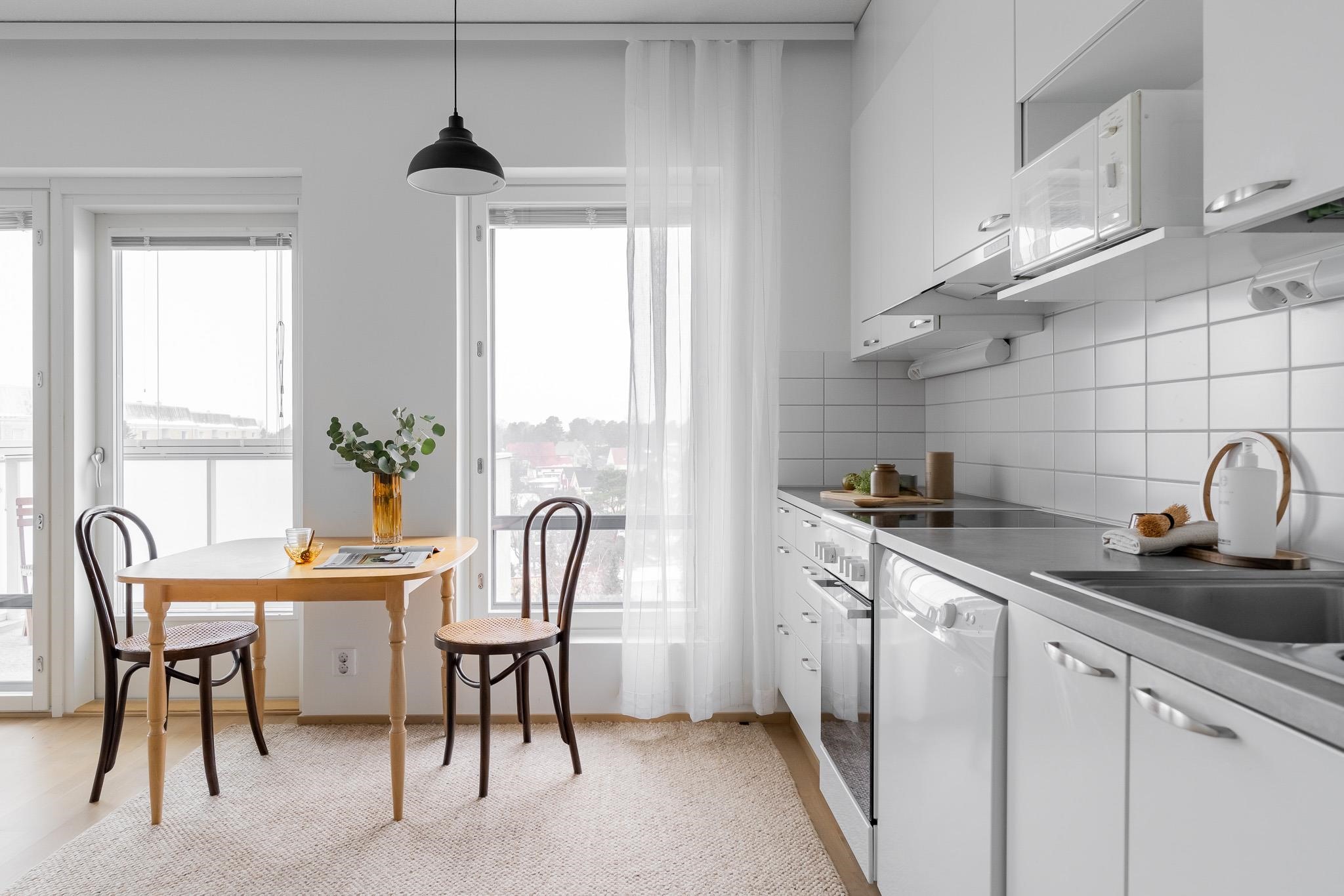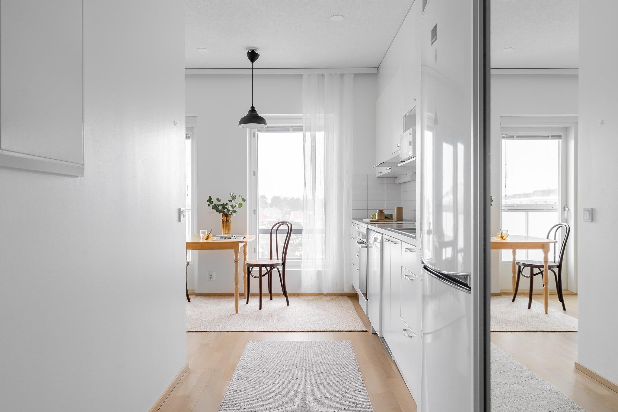 - Jääkaappipakastin, keraaminen liesi, liesituuletin, mikroaaltouuni, astianpesukone, kaapistot, kiinteät valaisimet.