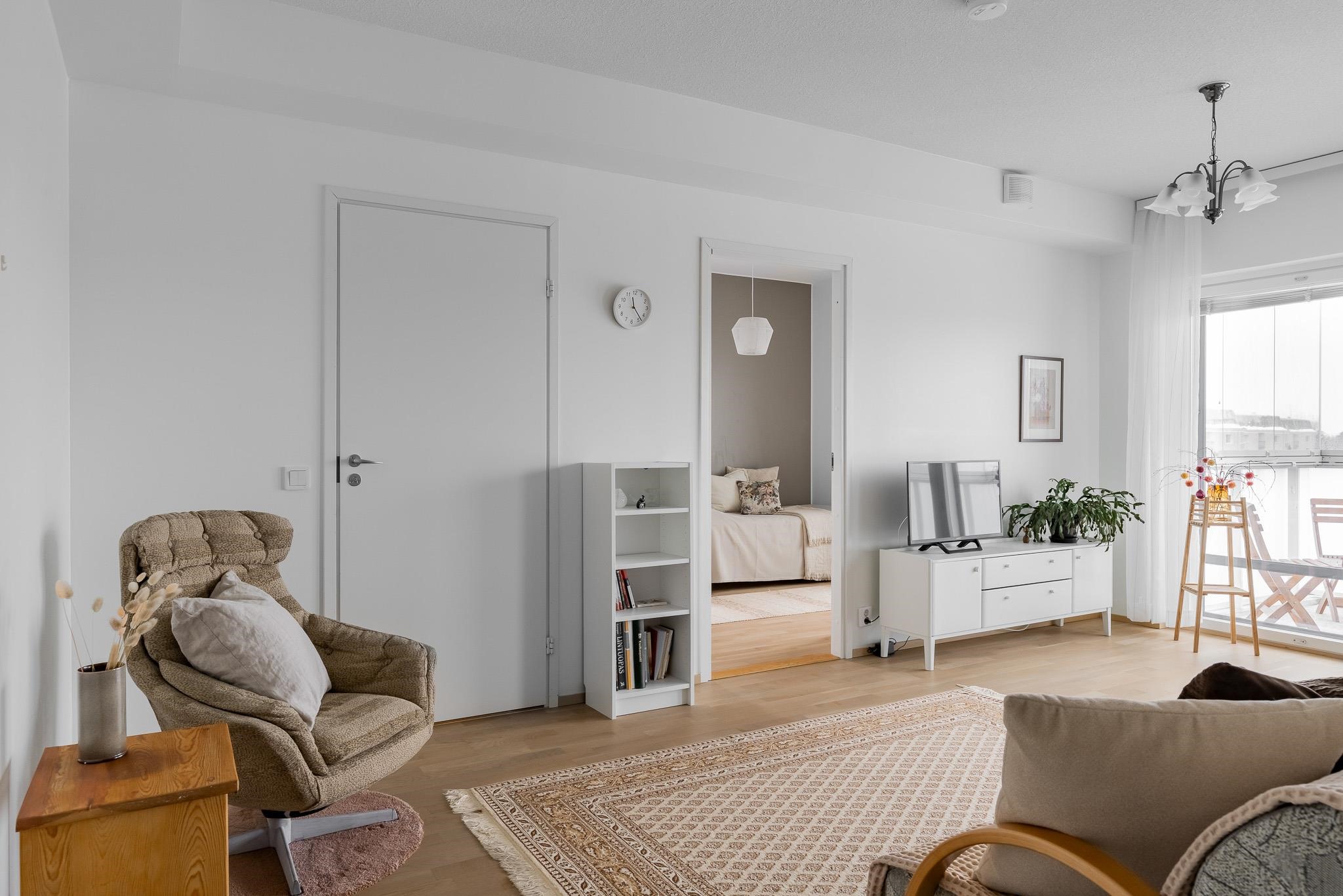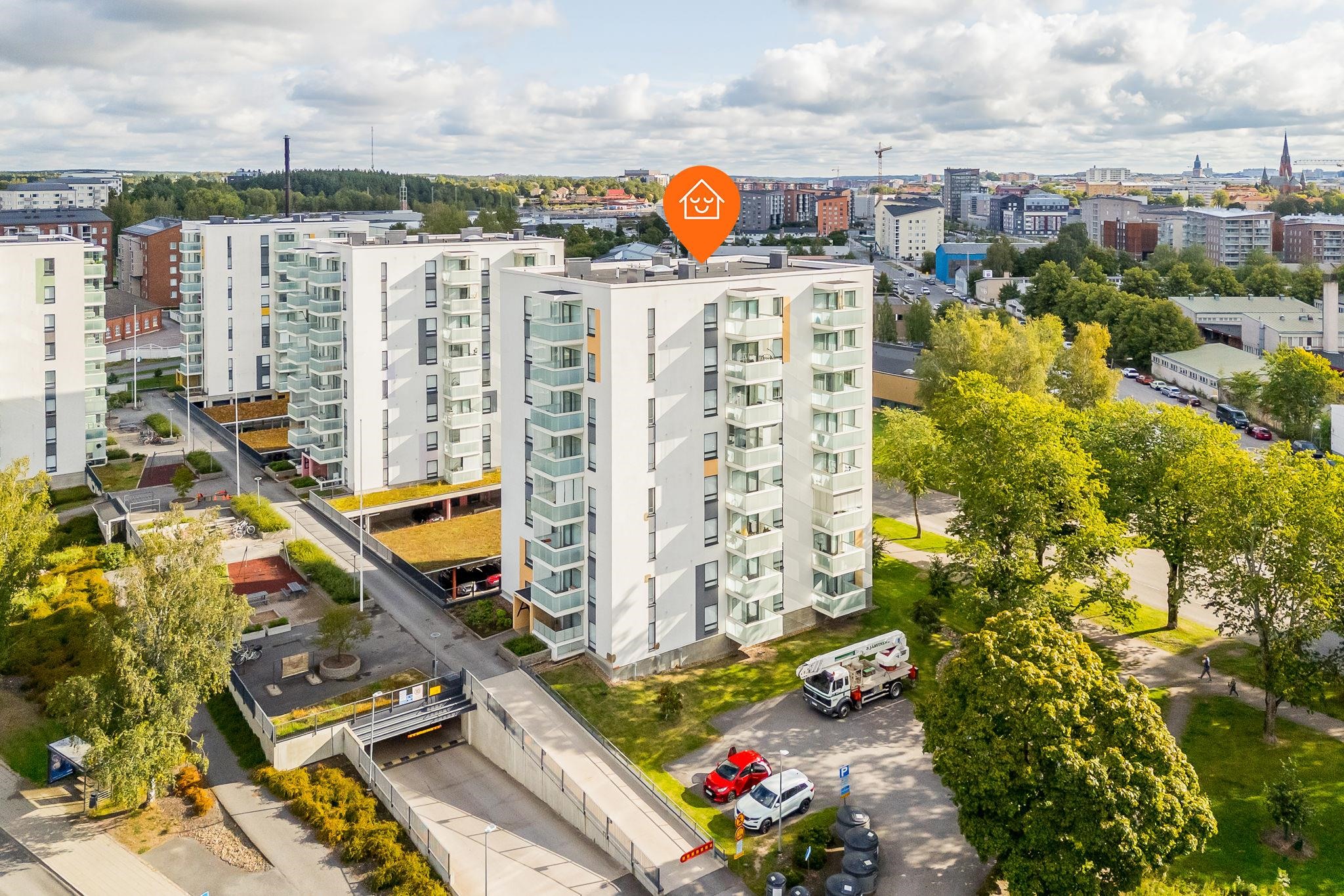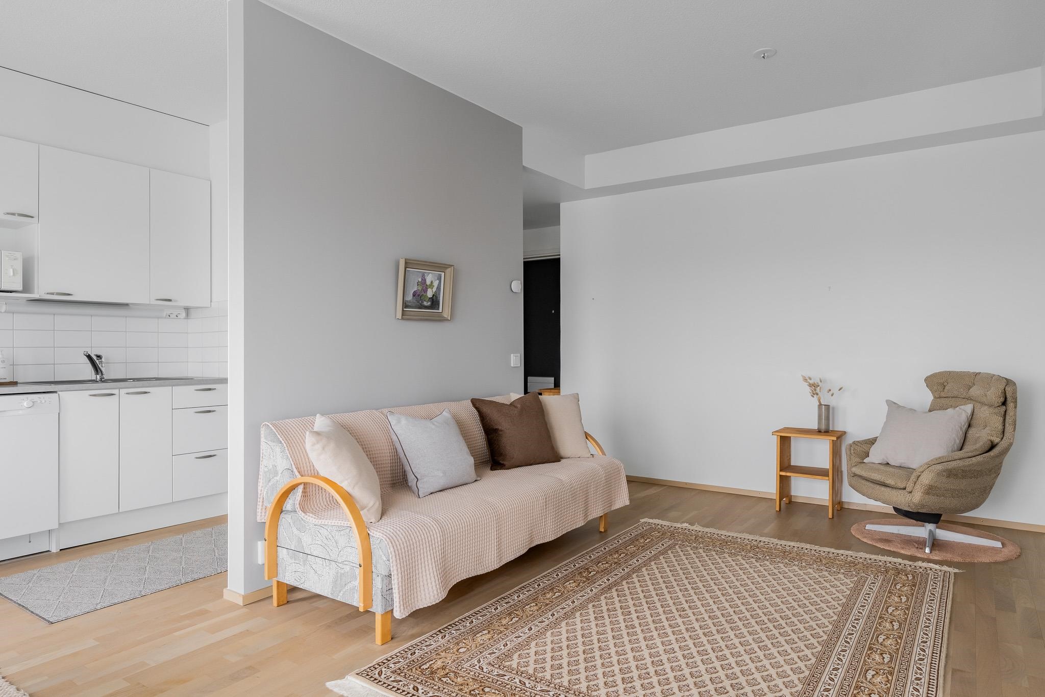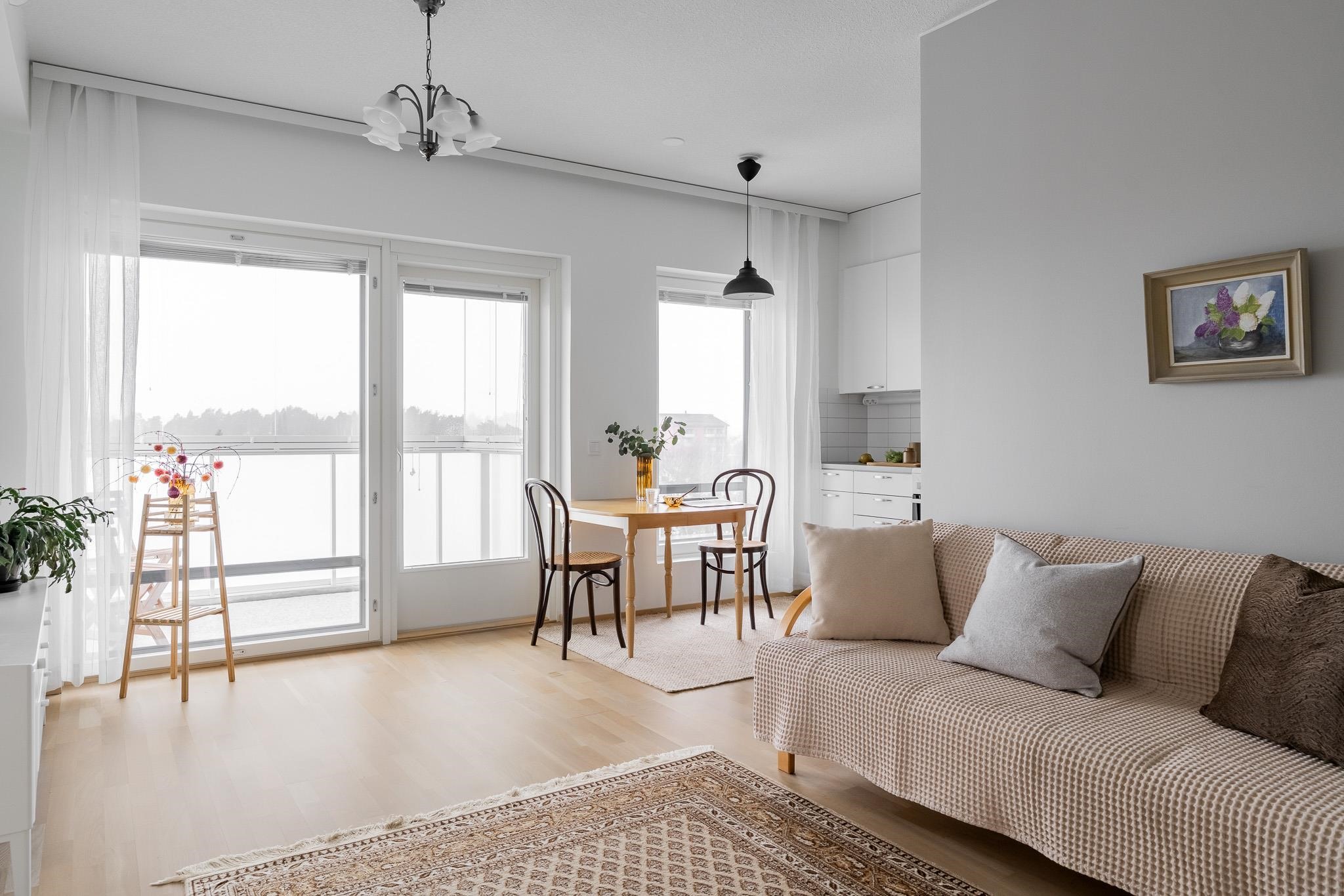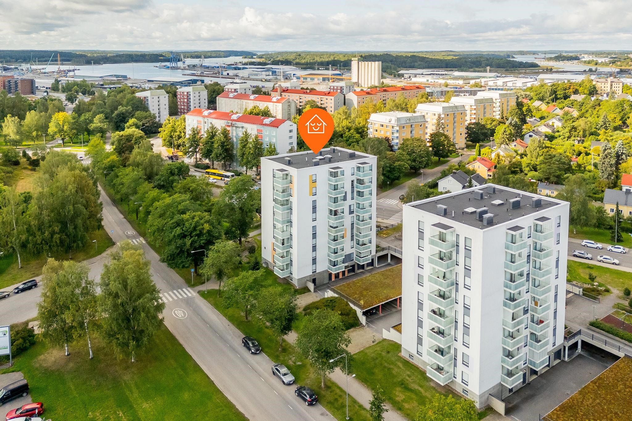 Tässä kuudennen kerroksen valoisassa 46m2:n asunnossa arki sujuu vaivattomasti. Asuntoon tullaan eteiseen, jossa peililiukuovikaappi kätkee ulkovaatteet. Keittiötila on osittain olohuoneen kanssa samaa tilaa, väliseinä tarjoaa näkösuojaa. Olohuoneeseen mahtuu ruokaryhmän lisäksi oleskeluryhmä. Tilasta on käynti lasitetulle parvekkeelle, josta näkymät ovat sataman suuntaan. Makuuhuoneessa on hyvin säilytystilaa. Kylpyhuone on tilava, siellä on asumismukavuutta lisäävä lattialämmitys. Lattiat ovat tammiparkettia, seinät maalatut, joten voit helposti vaihtaa väritystä tai tapetoida mieleiseksesi. Kylpyhuoneessa on neutraalit mutta tyylikkäät harmaa-valkoiset laatat. Huoneistossa on huoneistokohtainen ilmanvaihto lämmön talteenotolla ja miellyttävä vesikiertoinen lattialämmitys. Säilytystilaa löytyy lisää taloyhtiön kellarista. Iso-Heikkilä on asuinalue, jossa arjen palvelut löytyvät läheltä. Lähikaupat, liikuntamahdollisuudet ja hyvät liikenneyhteydet keskustaan tekevät sijainnista käytännöllisen. Alueen pihat ja viheralueet ovat yhteiskäytössä naapuritaloyhtiöiden kanssa. Jos haluat tutustua tähän kotiin tarkemmin, sovi esittely välittäjän kanssa. Yhteystiedot: Kirsi Kivimäki, puh. 050 478 3158 tai kirsi.kivimaki@op.fi