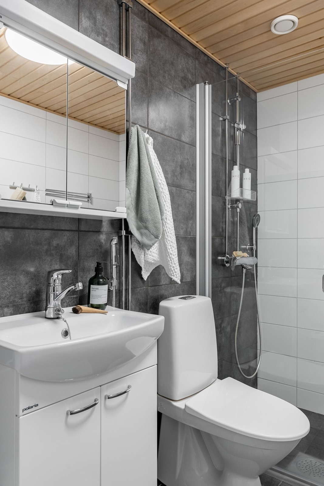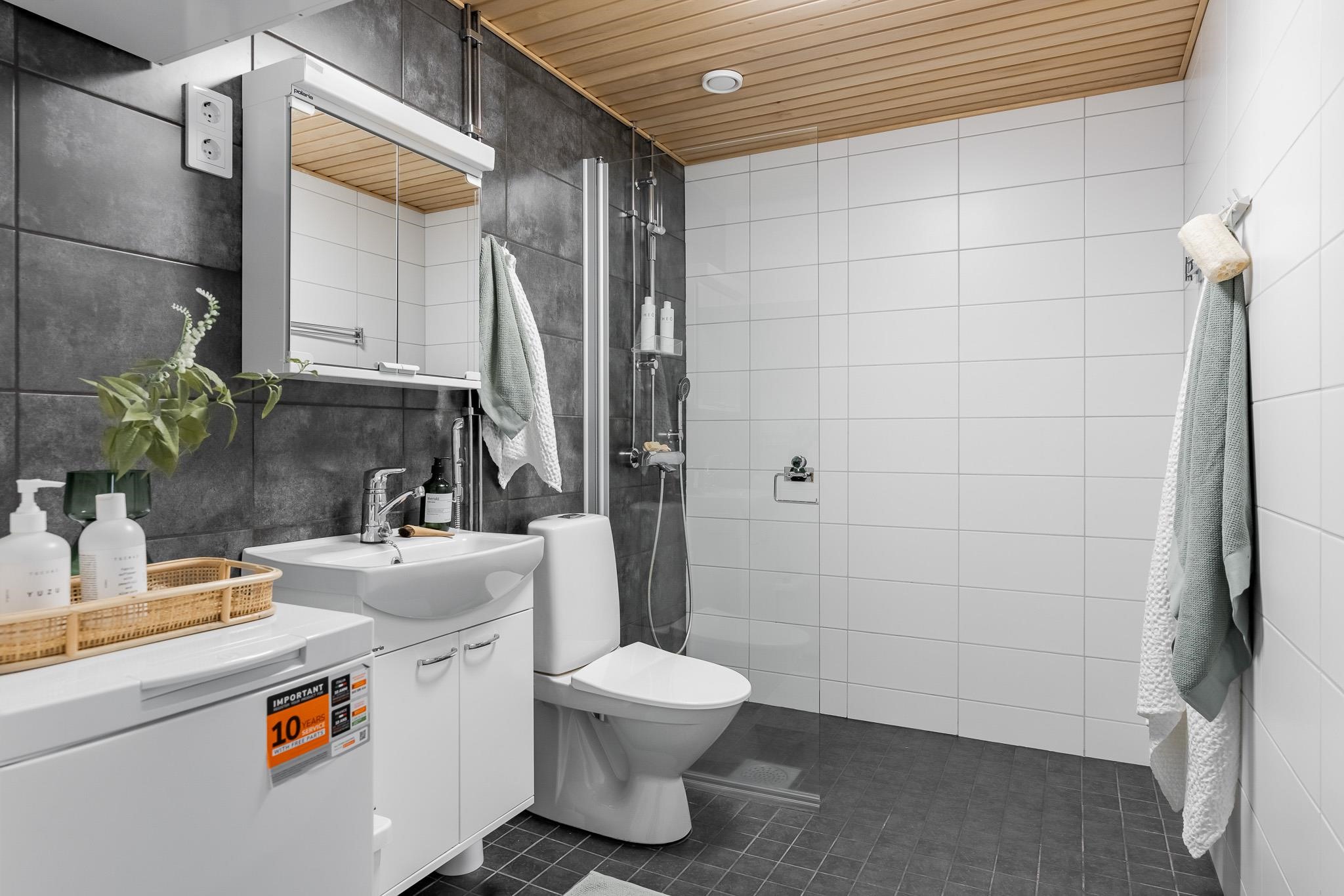 - Kylpyhuone, suihku, peilikaappi, allaskaappi, pesukoneliitäntä, lattialämmitys vesikiertoinen, kiinteät valaisimet.