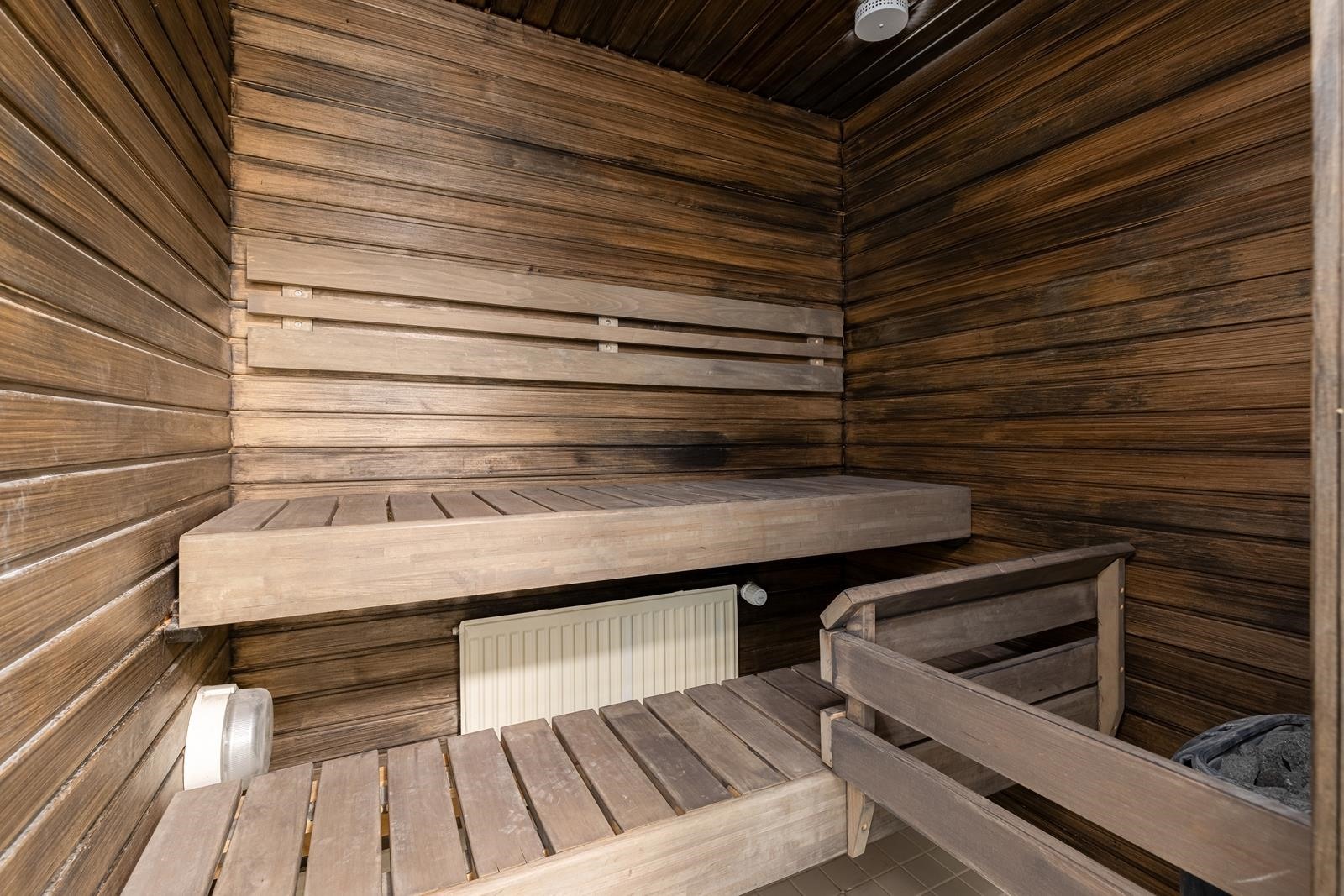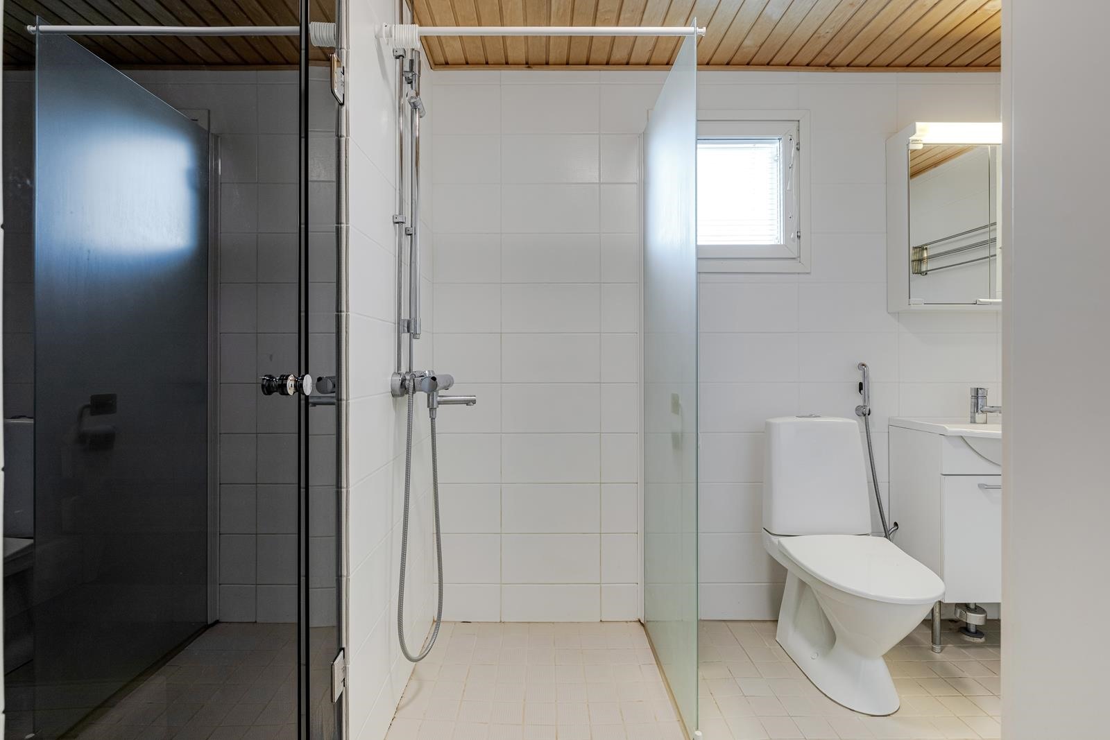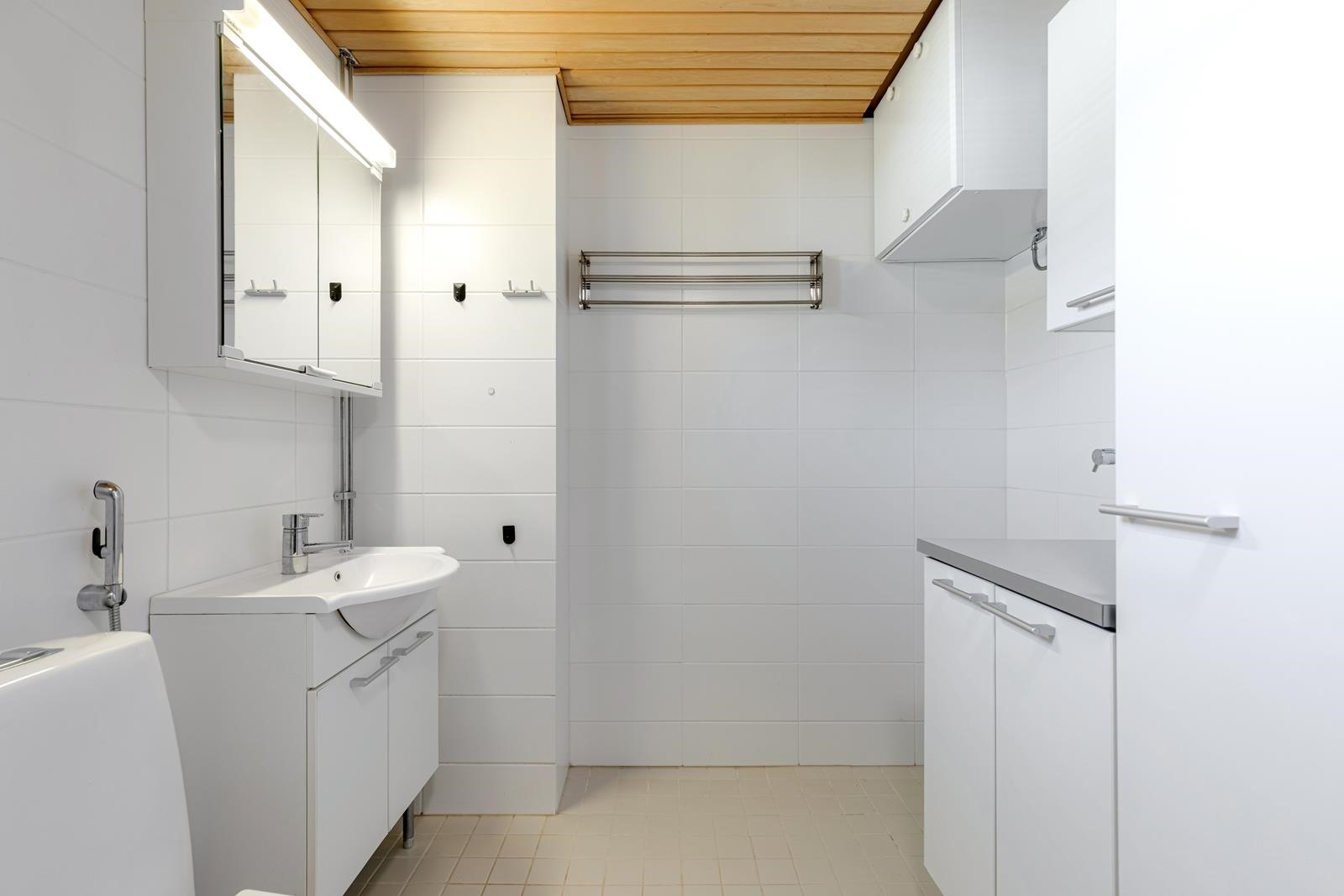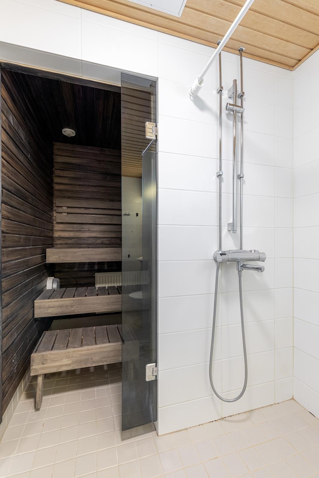 - Sauna, kylpyhuone, erillinen wc, suihku, suihkuseinä, peilikaappi, kaapit, allaskaappi, pesukoneliitäntä, lattialämmitys, kiinteät valaisimet.