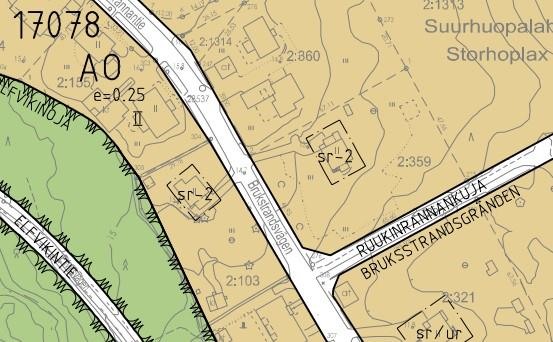 - AO II e=0,25. Nykyinen rakennus on merkitty kaavaluonnokseen Sr-2. Suojeltava rakennus. Maanomistajan kuulemisessa ehdotettu/ ehdotetaan suojelumääräyksen poistamista.