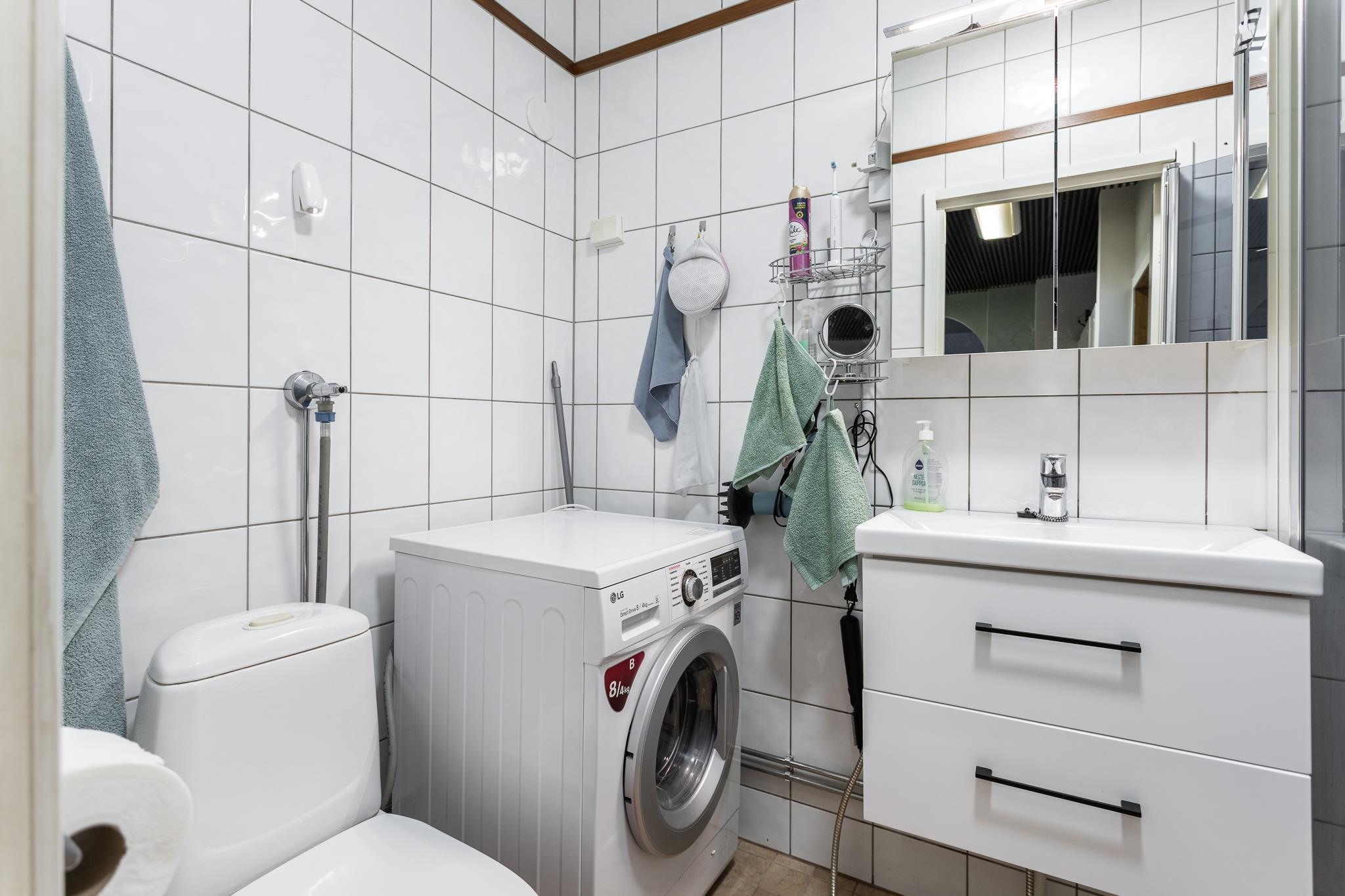 - Kylpyhuone / wc, suihku, suihkuseinä 2024, peilit, allaskaappi 2026, pesukoneliitäntä.