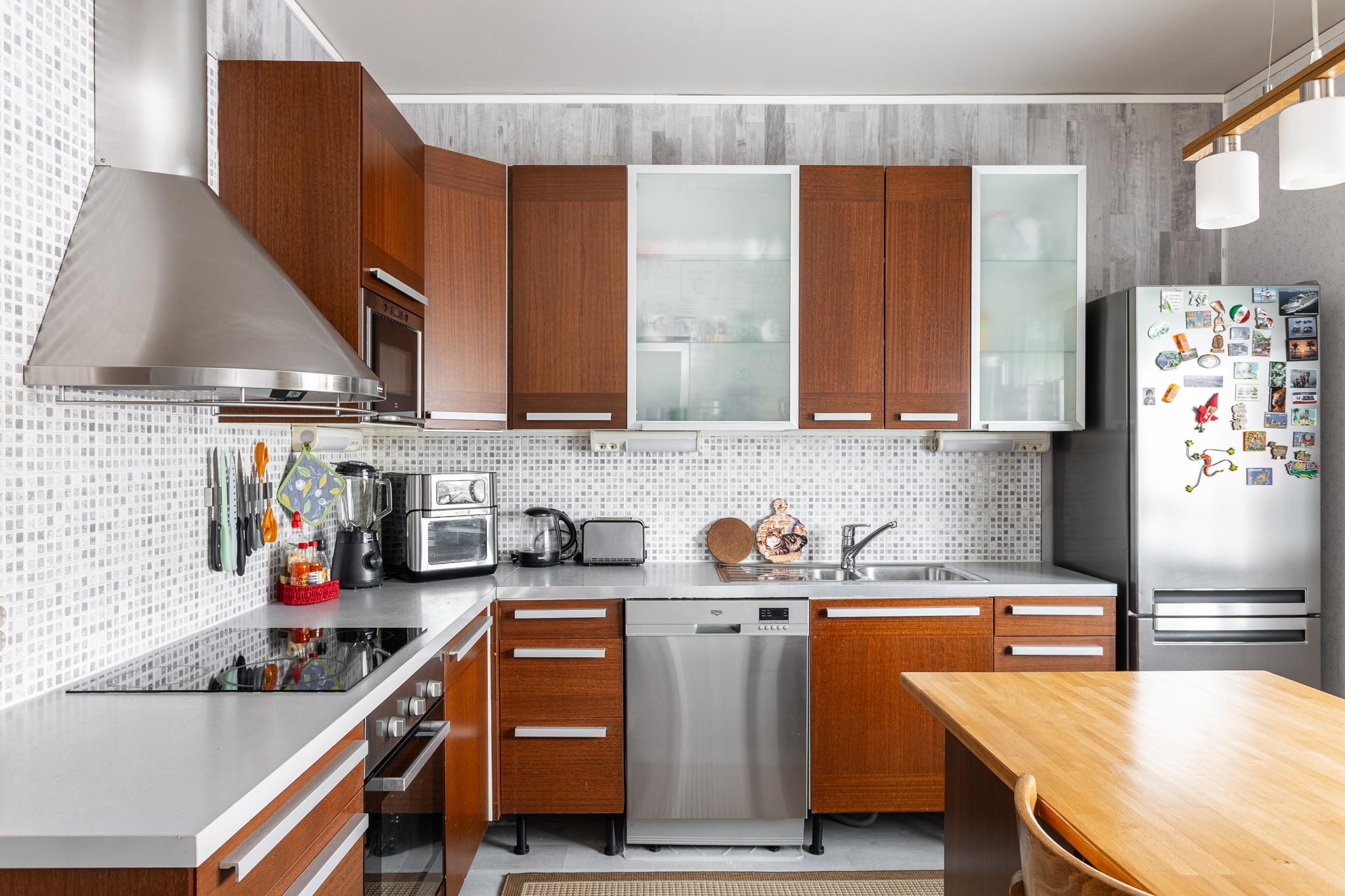 - Jääkaappipakastin, erillisuuni, liesitaso, liesituuletin, astianpesukone, kaapistot, kiinteät valaisimet.