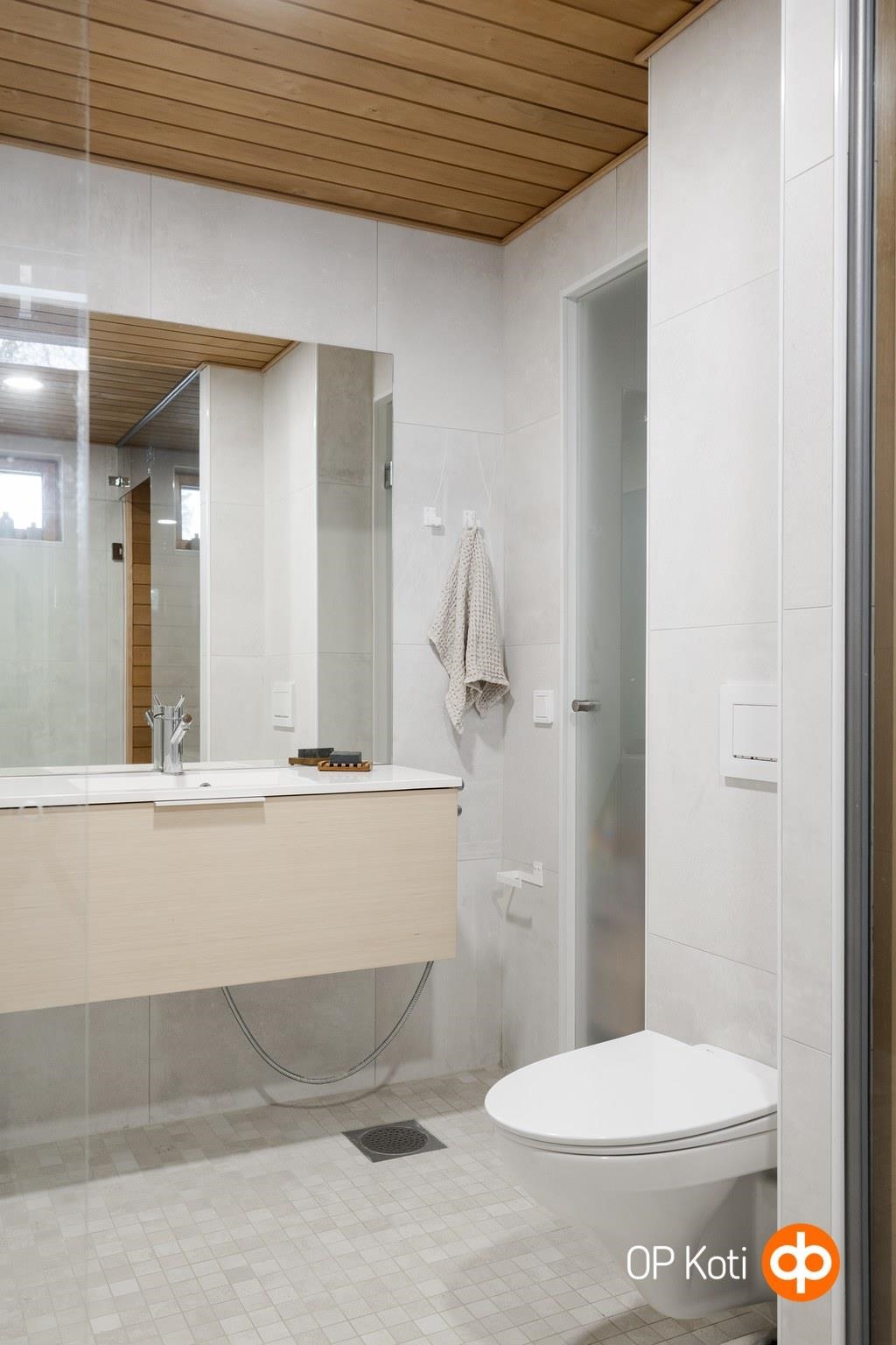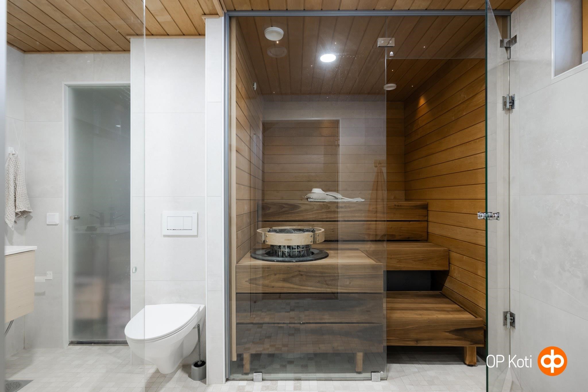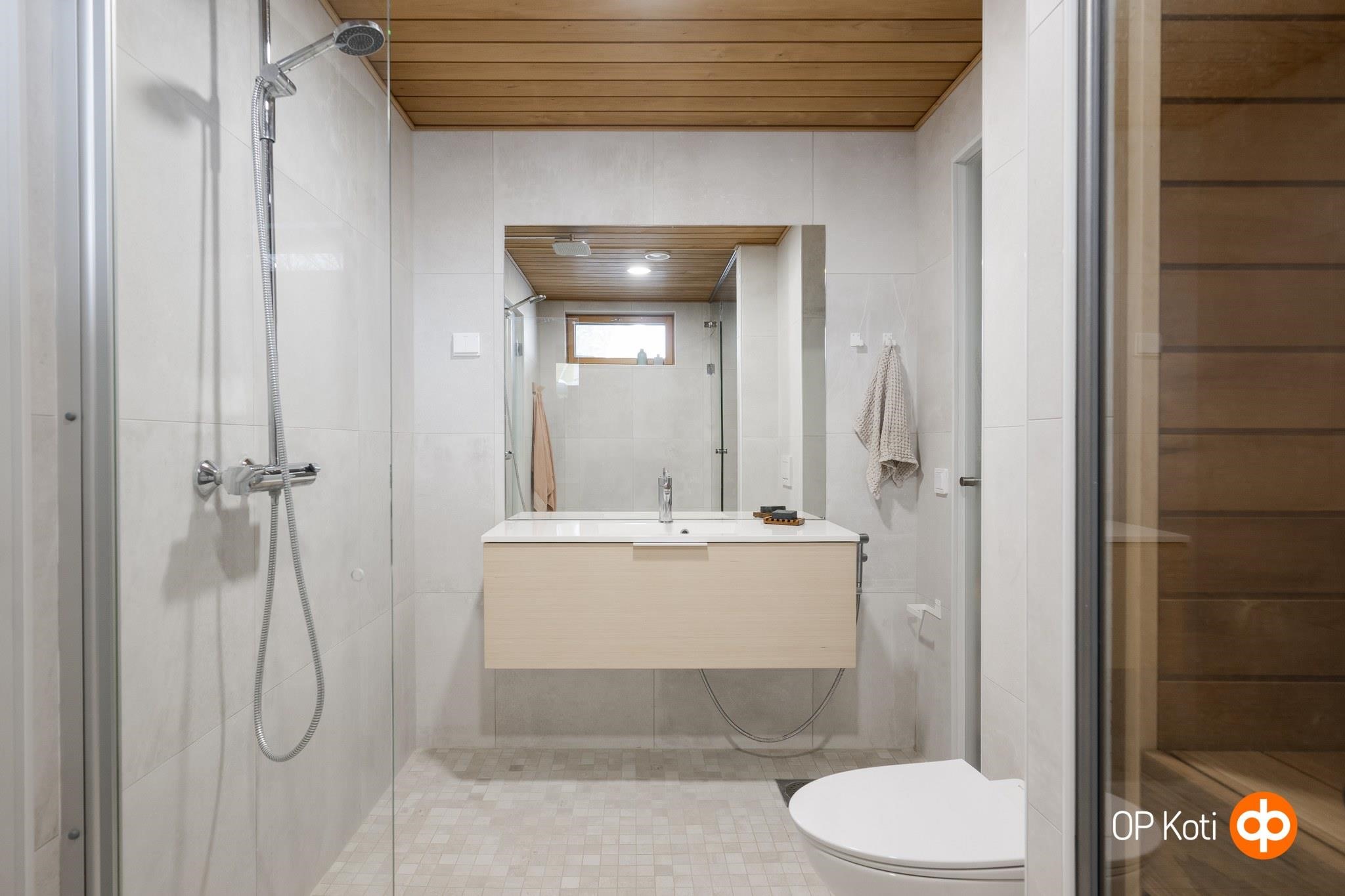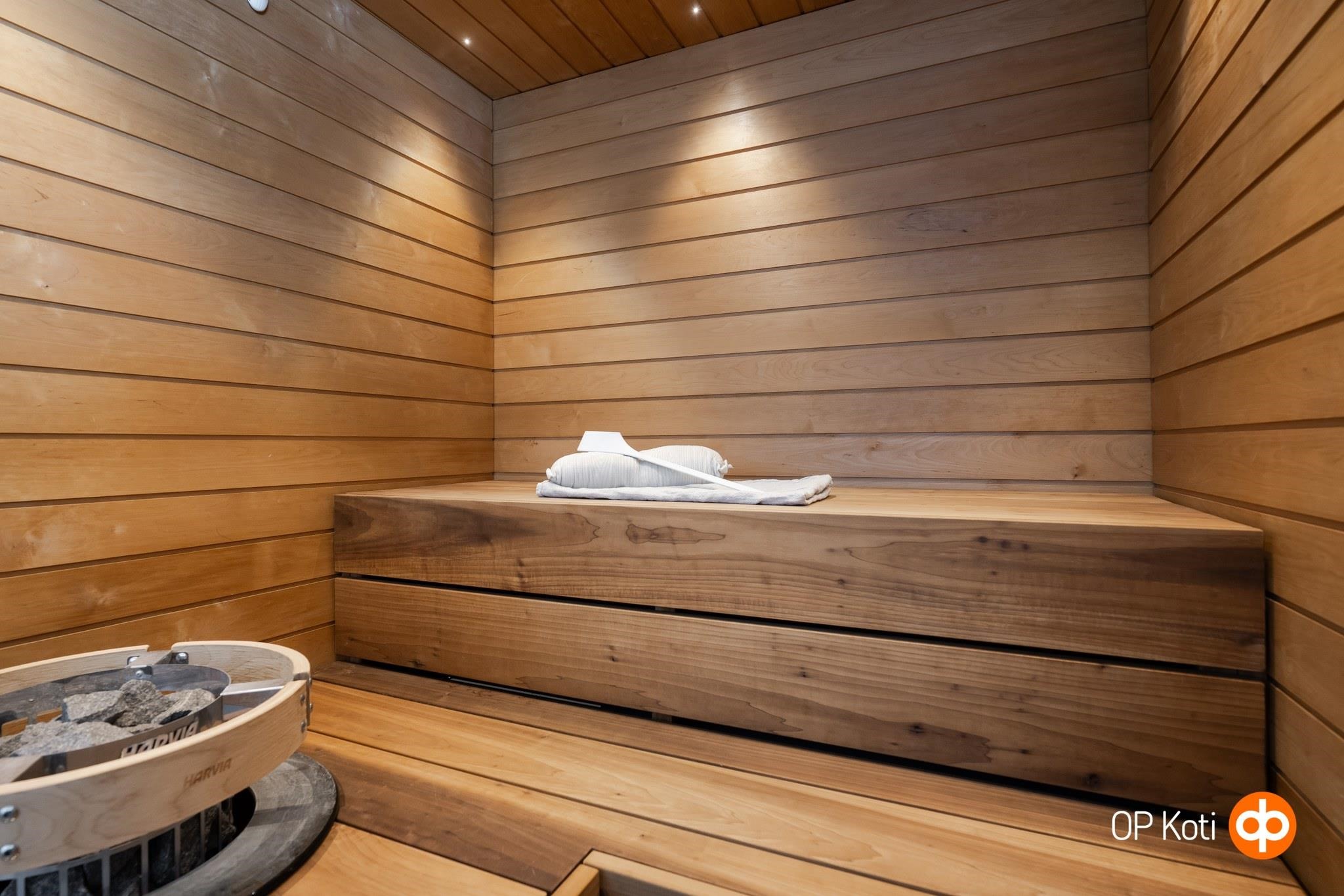- Sauna, sähkökiuas Harvia Cilindro, kylpyhuone, erillinen wc yläkerrassa, suihku, suihkuseinä kääntyvä, peilit wc+kph, allaskaappi, pesukoneliitäntä khh, lattialämmitys, kiinteät valaisimet kph,s.
