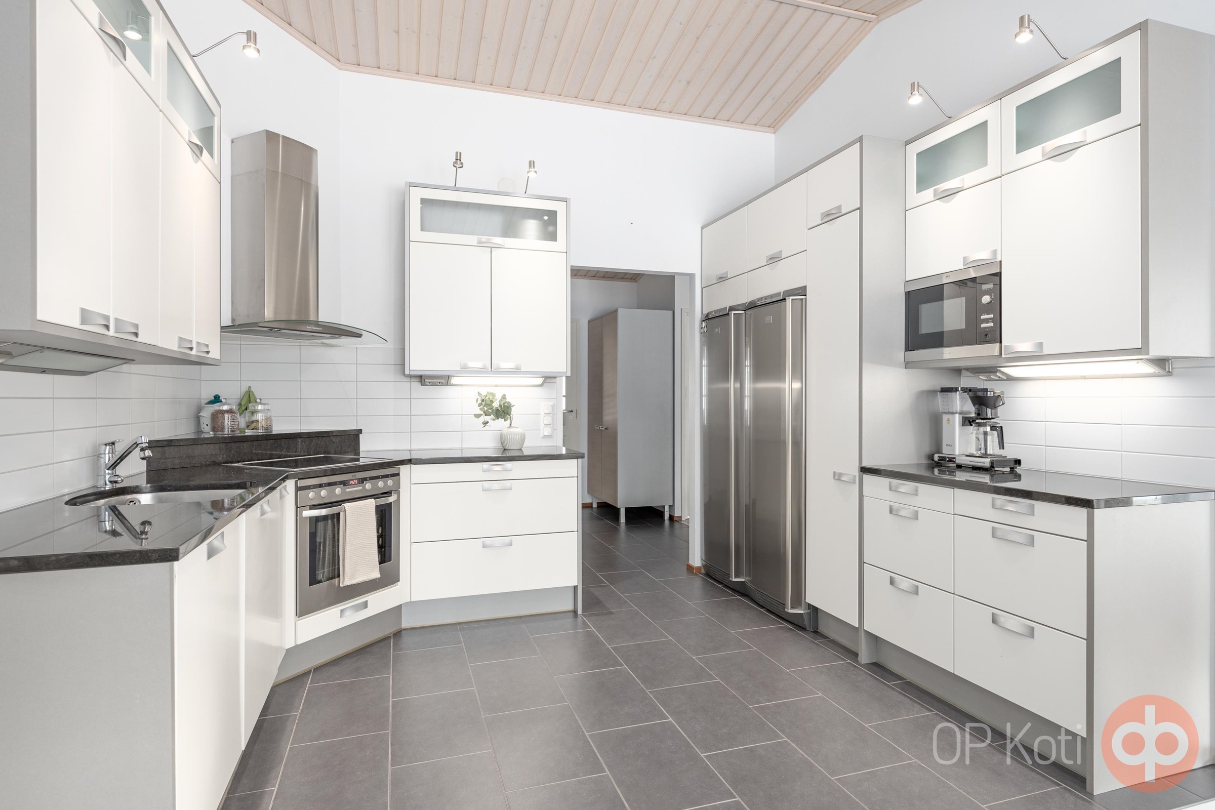 - Jääkaappi, pakastekaappi, erillisuuni, keraaminen liesi, liesikupu, liesituuletin, mikroaaltouuni, astianpesukone, kaapistot, kiinteät valaisimet, pöytätasojen materiaali kivi.