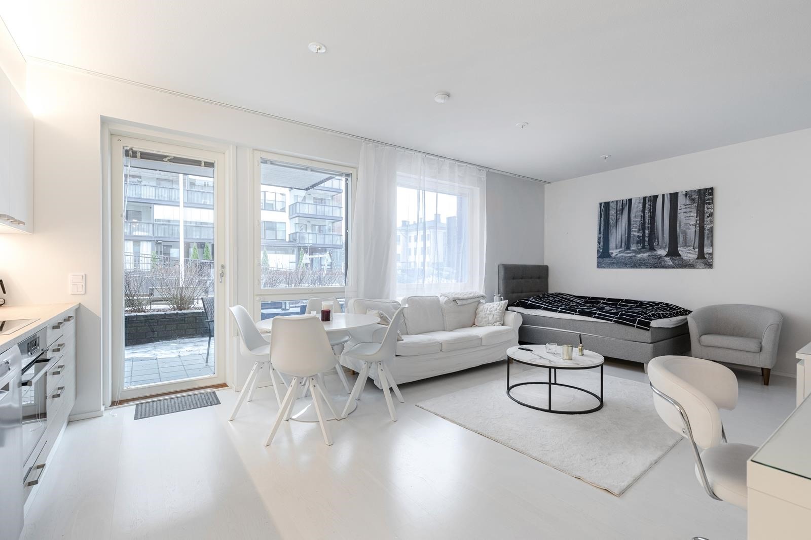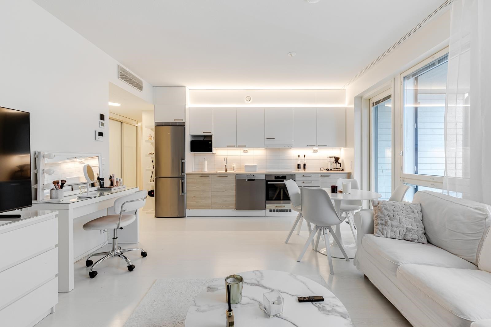 Asunnon selkeä ja yhtenäinen, pohjaratkaisu tekee tilasta toimivan ja avaran. Vaaleat pinnat ja suuret ikkunat tuovat runsaasti luonnonvaloa, luoden raikkaan ja viihtyisän tunnelman.