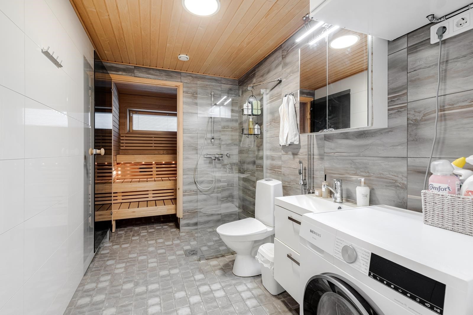 - Sauna, sähkökiuas, kylpyhuone, suihku, suihkuseinä, peilikaappi, allaskaappi, pesukoneliitäntä, lattialämmitys, kiinteät valaisimet.