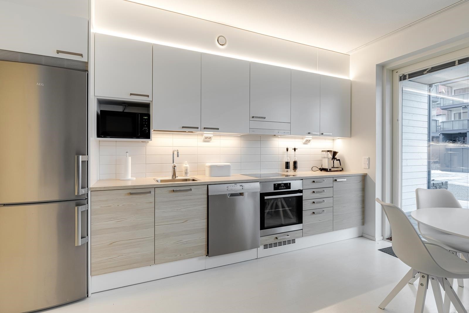 - Jääkaappi, pakastekaappi, induktioliesi (AEG), liesituuletin, astianpesukone (AEG), kaapistot, kiinteät valaisimet.