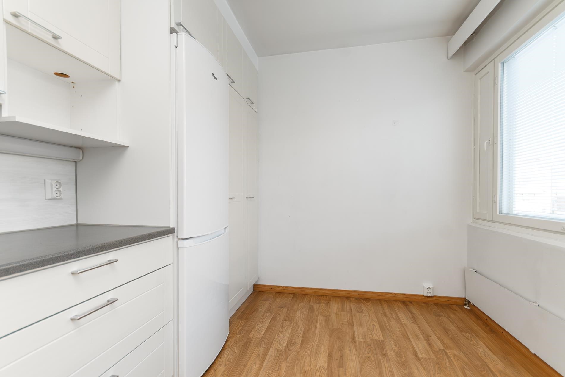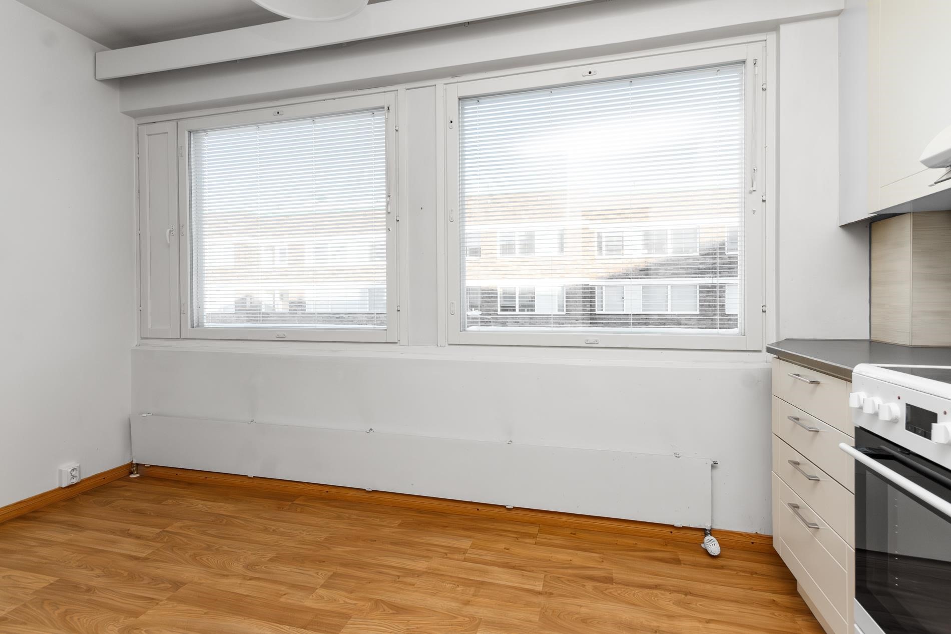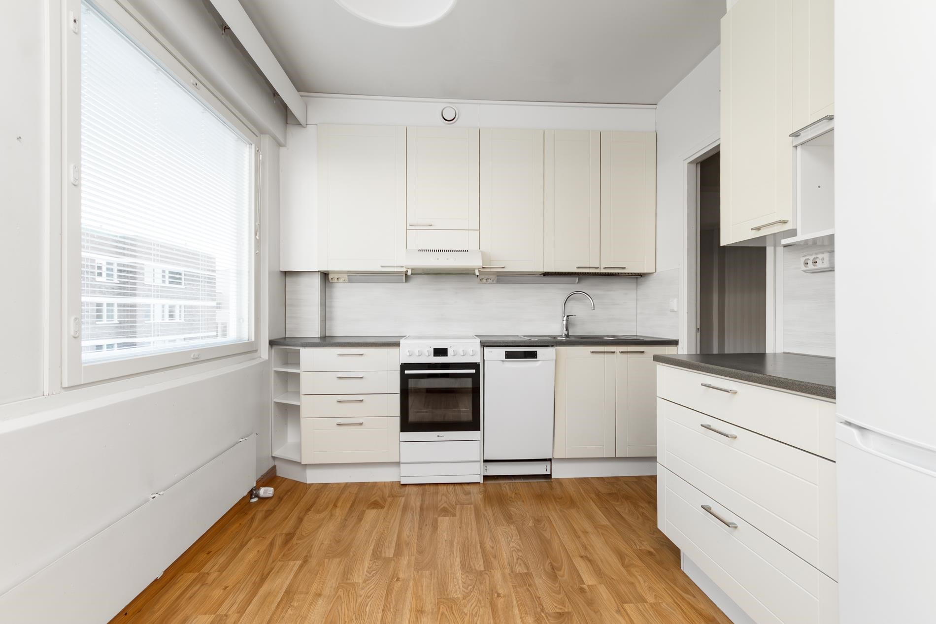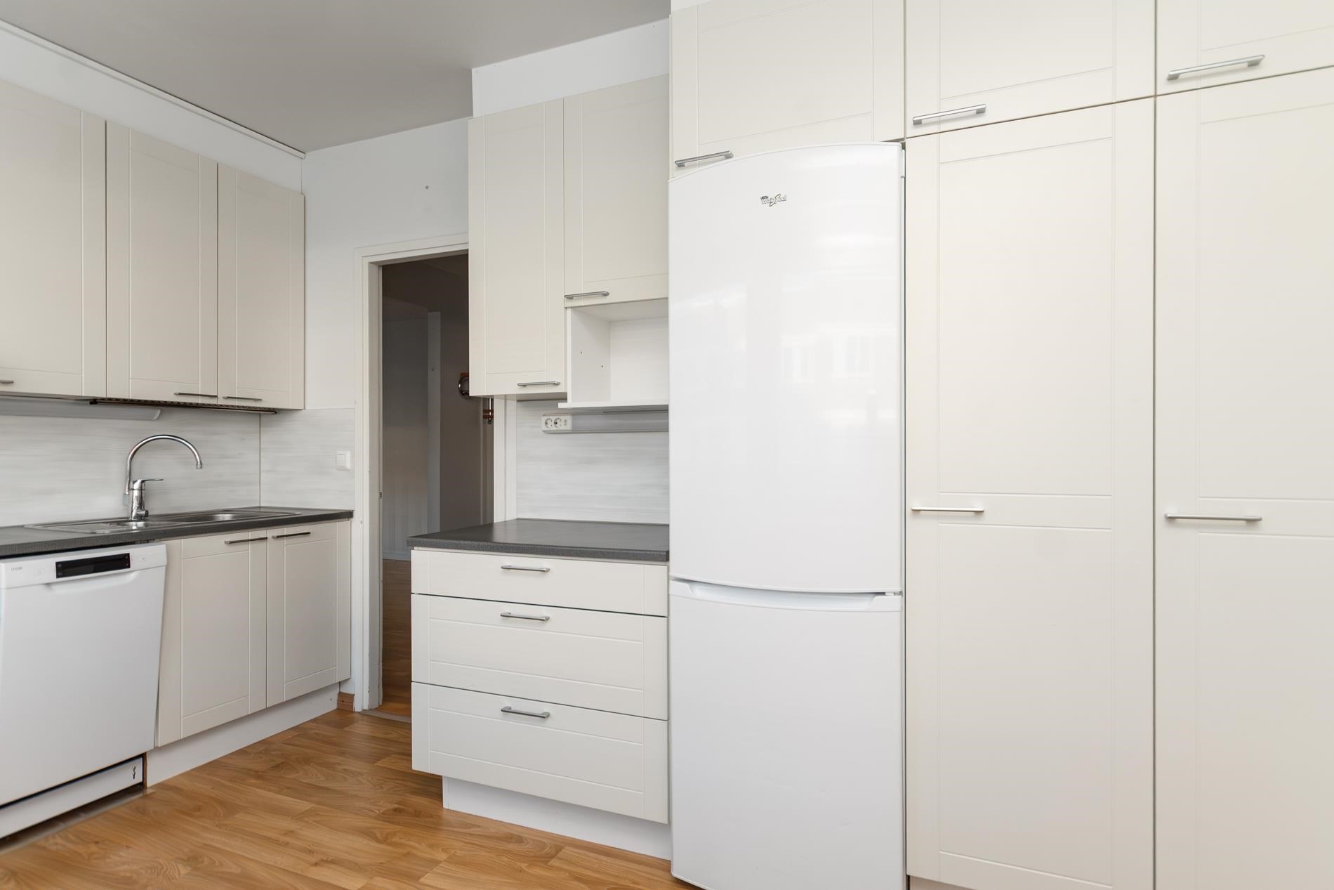- Jääkaappipakastin, keraaminen liesi, liesituuletin, astianpesukone, kaapistot, kiinteät valaisimet.