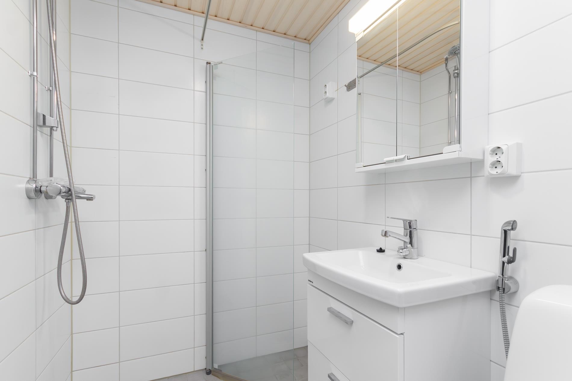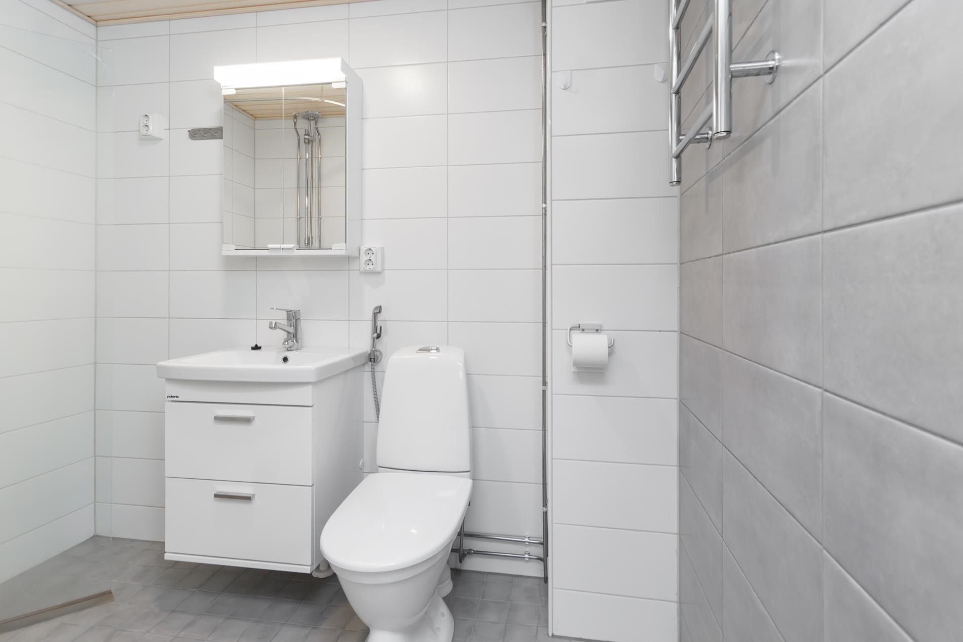 - Kylpyhuone, suihku, suihkuseinä, peilikaappi, allaskaappi, pesukoneliitäntä, lattialämmitys, kiinteät valaisimet, pyyhepatteri.