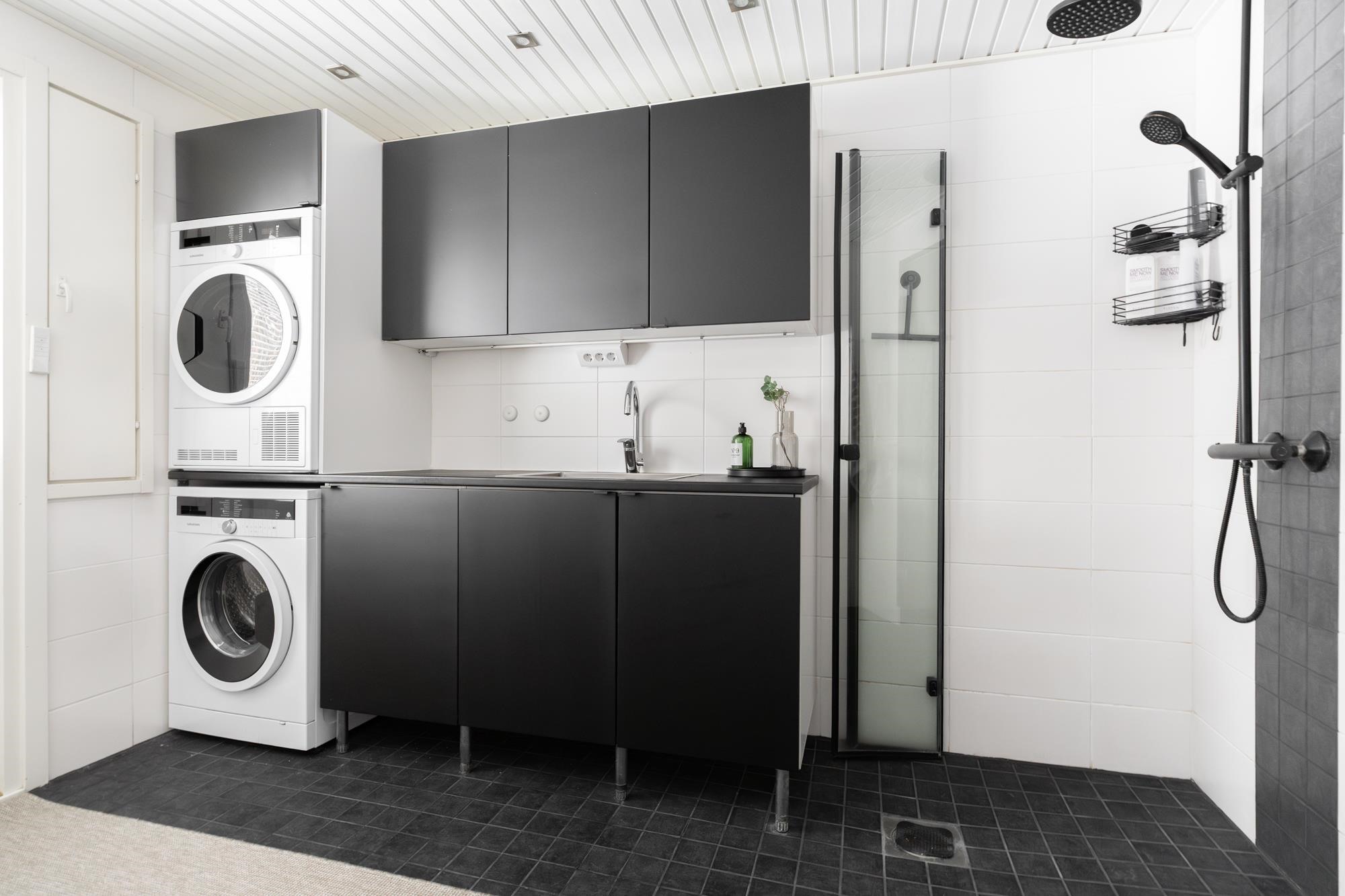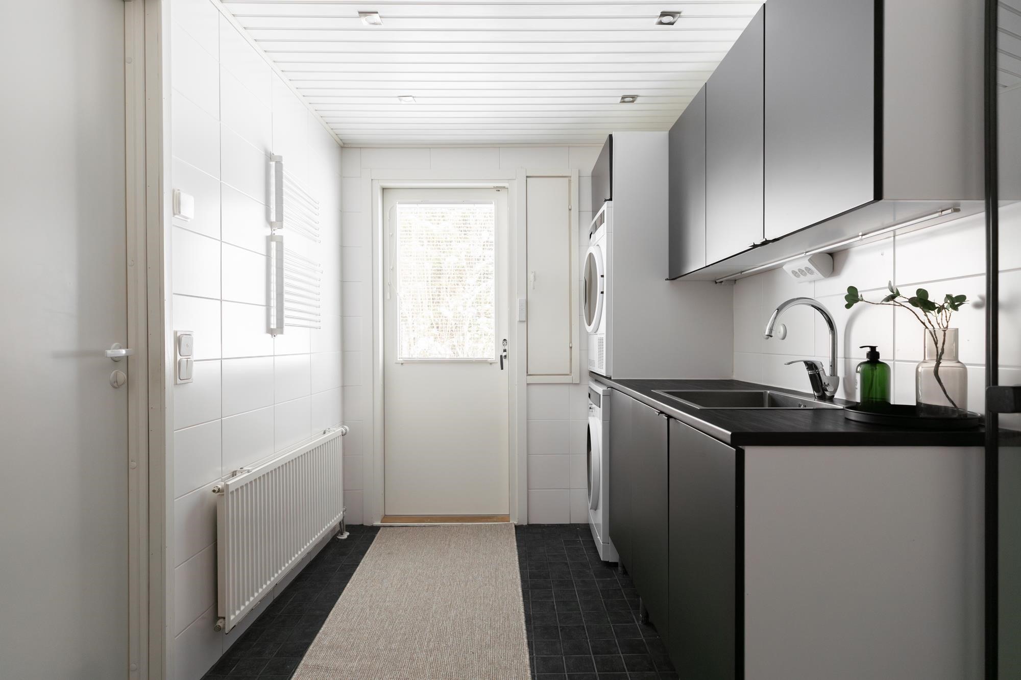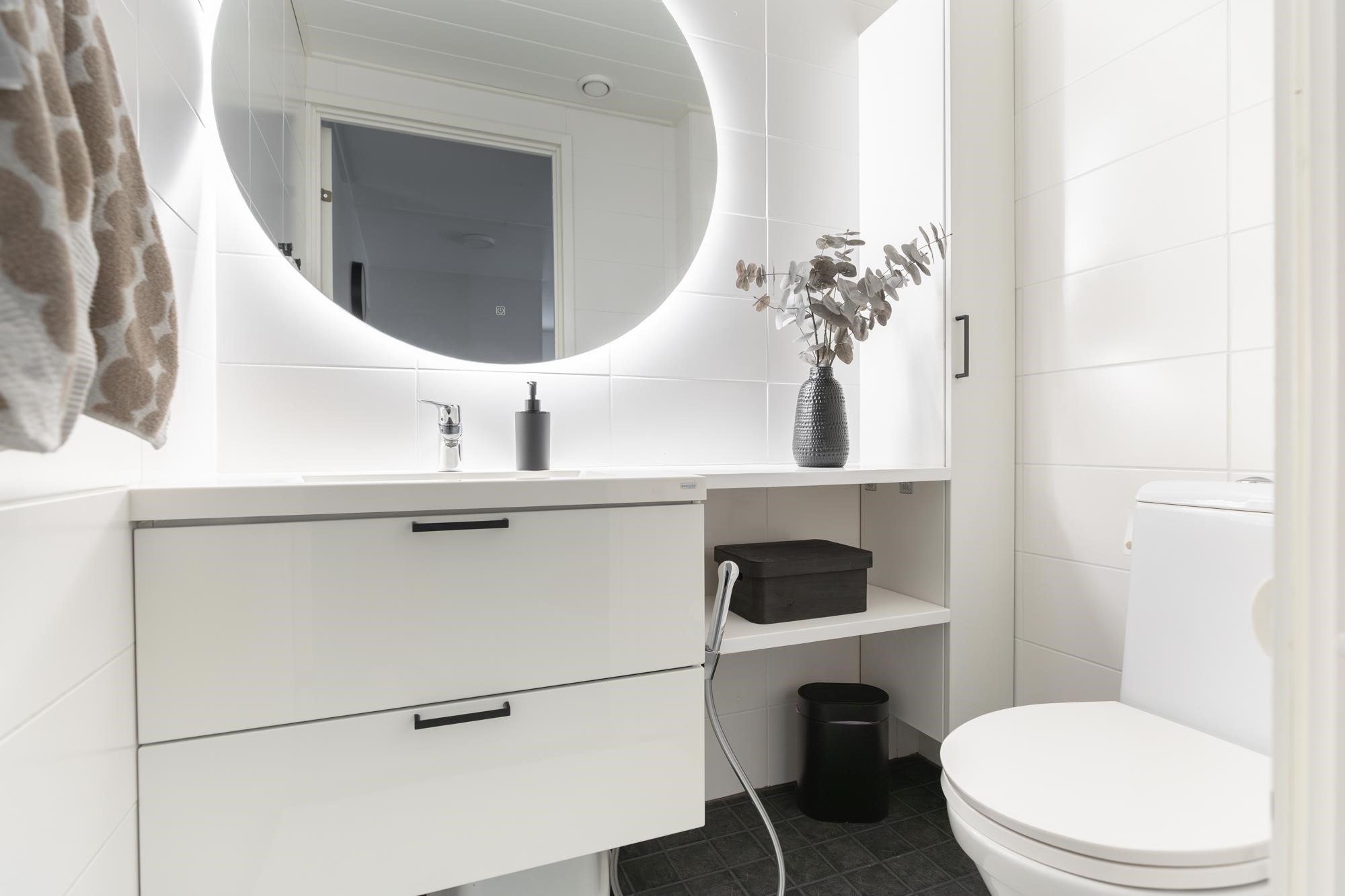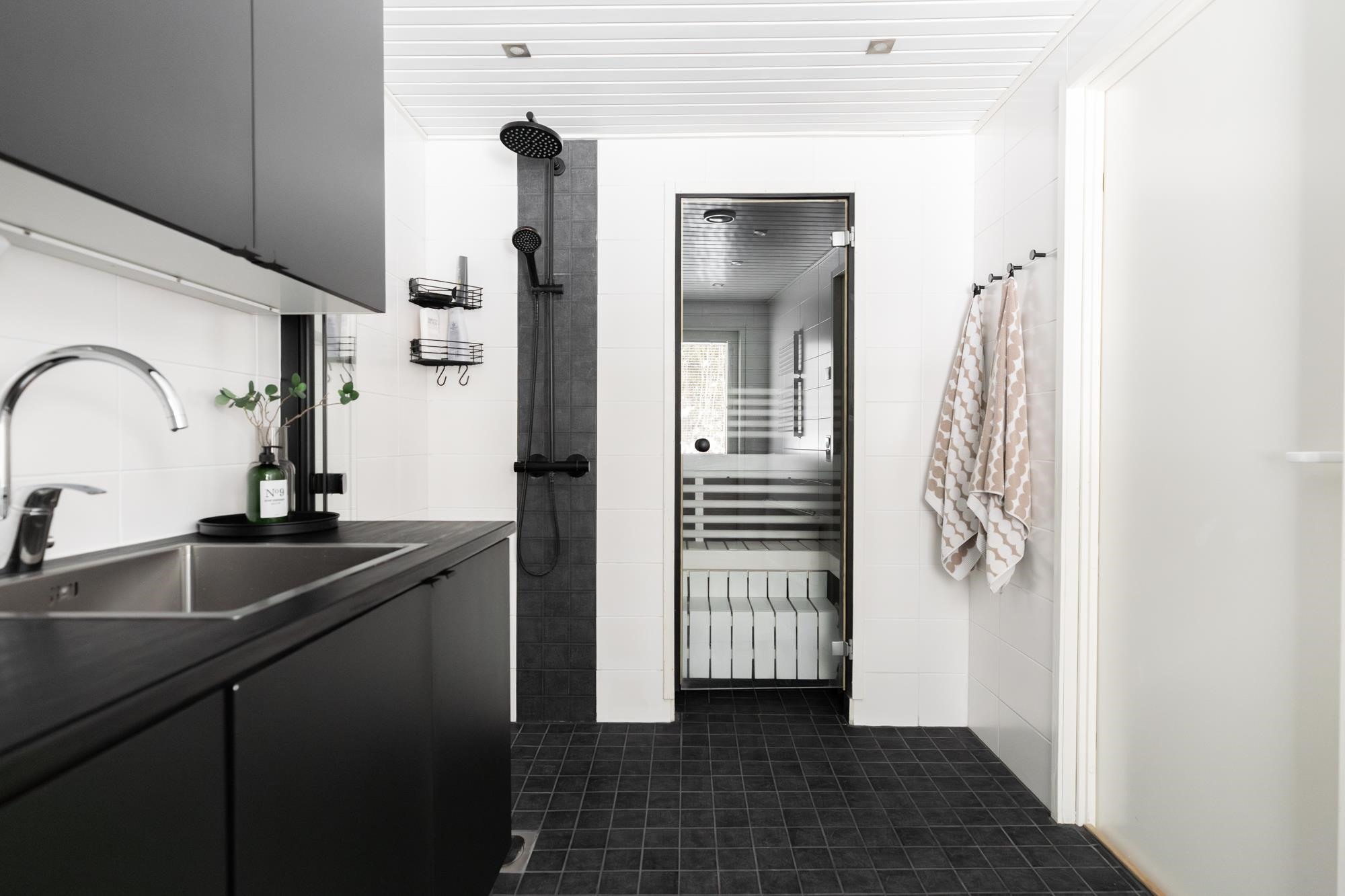 - Sauna, sähkökiuas, kylpyhuone, erillinen wc, suihku, suihkuseinä, peilit, kaapit, allaskaappi, pesukoneliitäntä, lattialämmitys, kiinteät valaisimet.