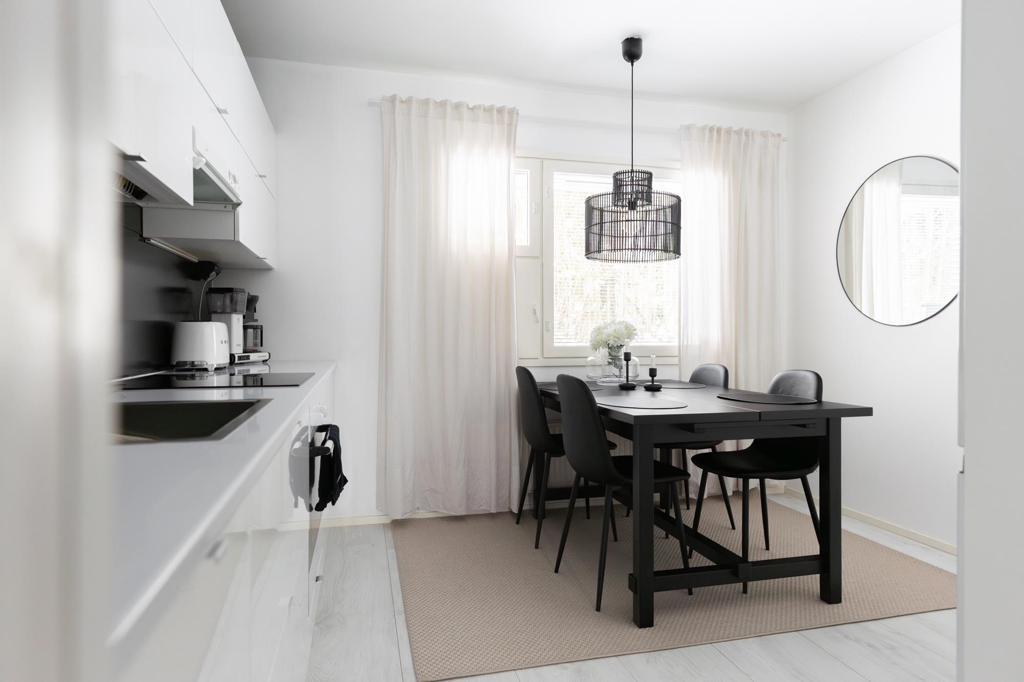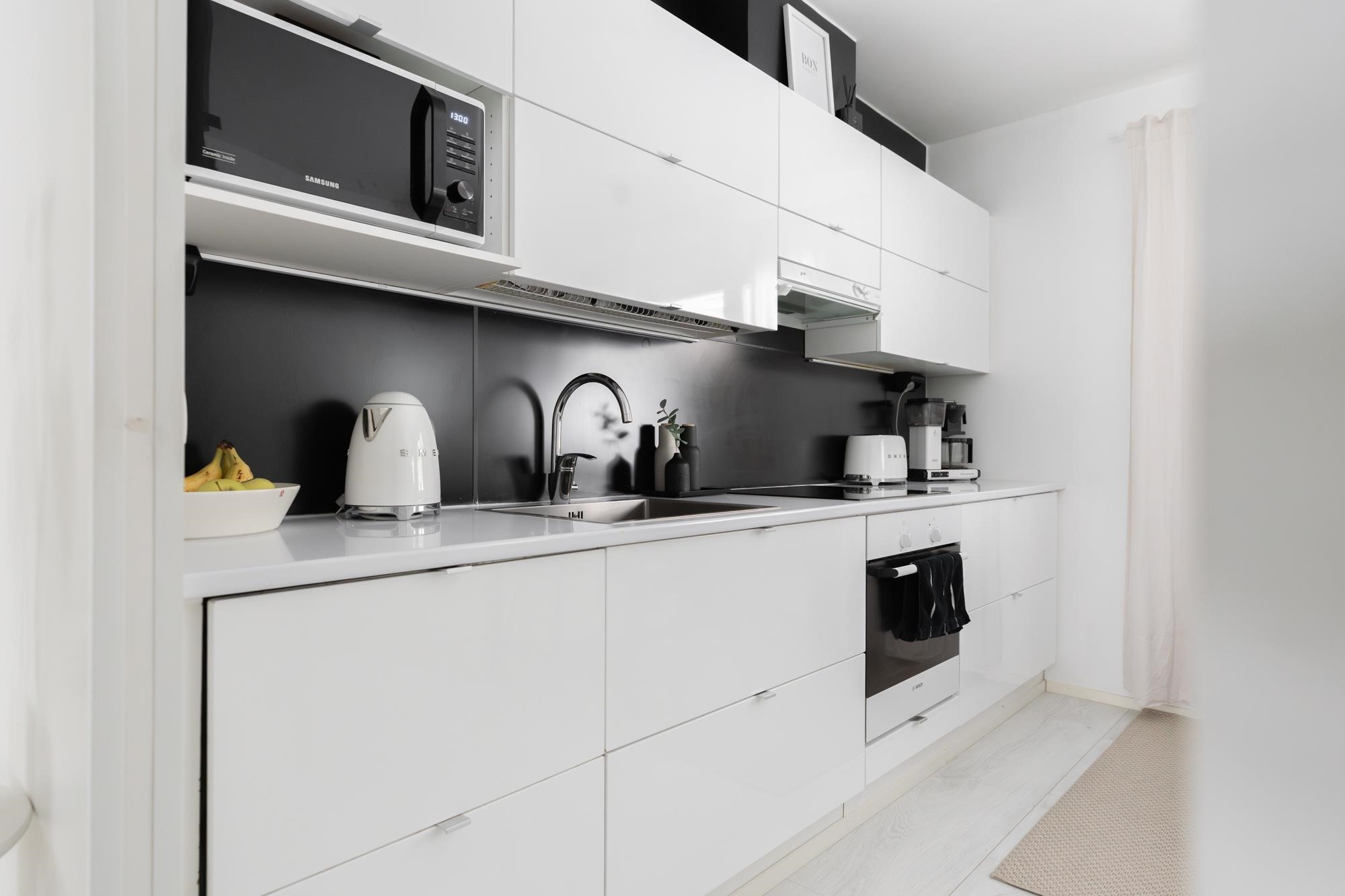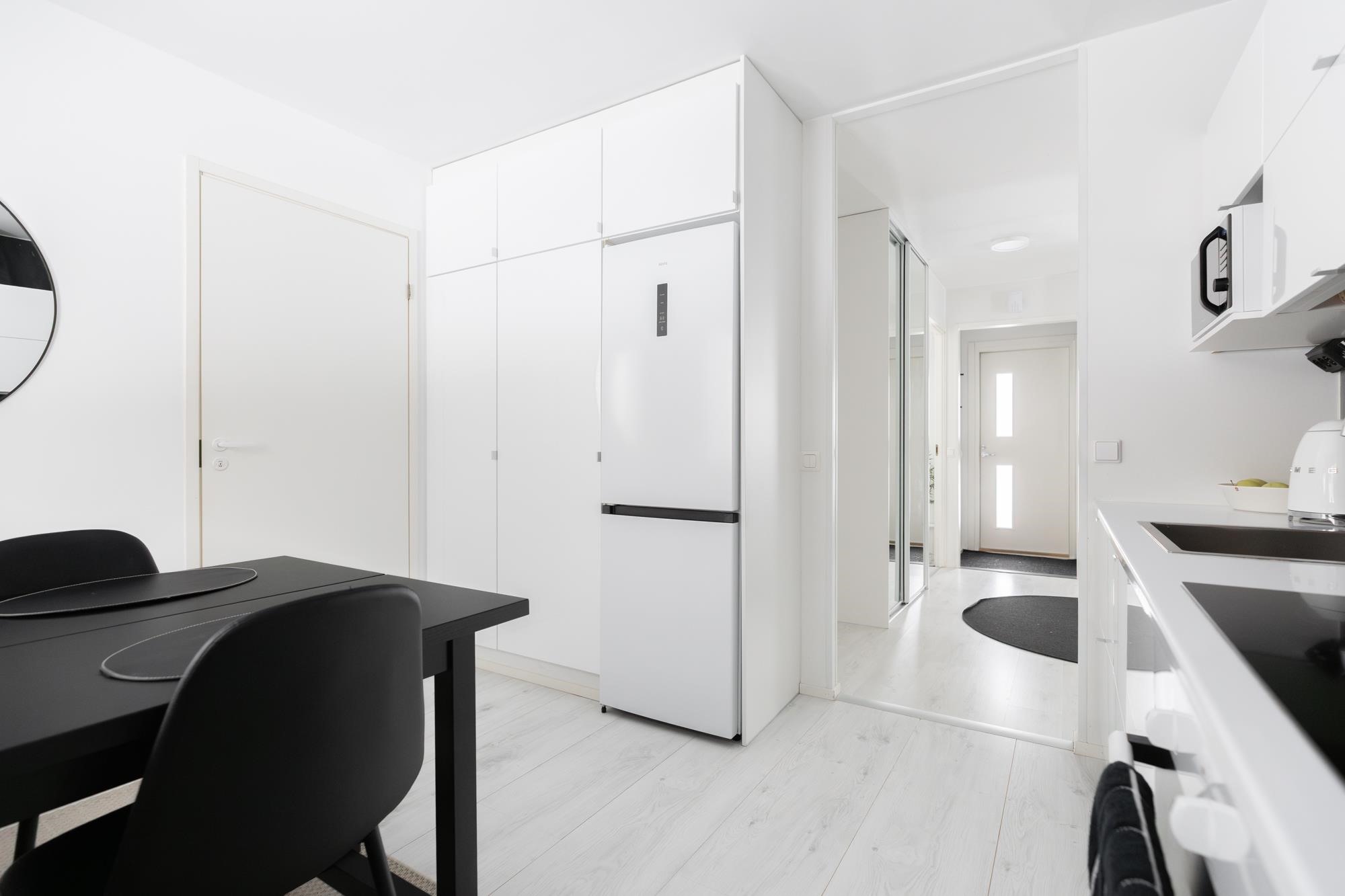 - Jääkaappipakastin, erillisuuni, induktioliesi, liesituuletin, astianpesukone, kaapistot, kiinteät valaisimet.