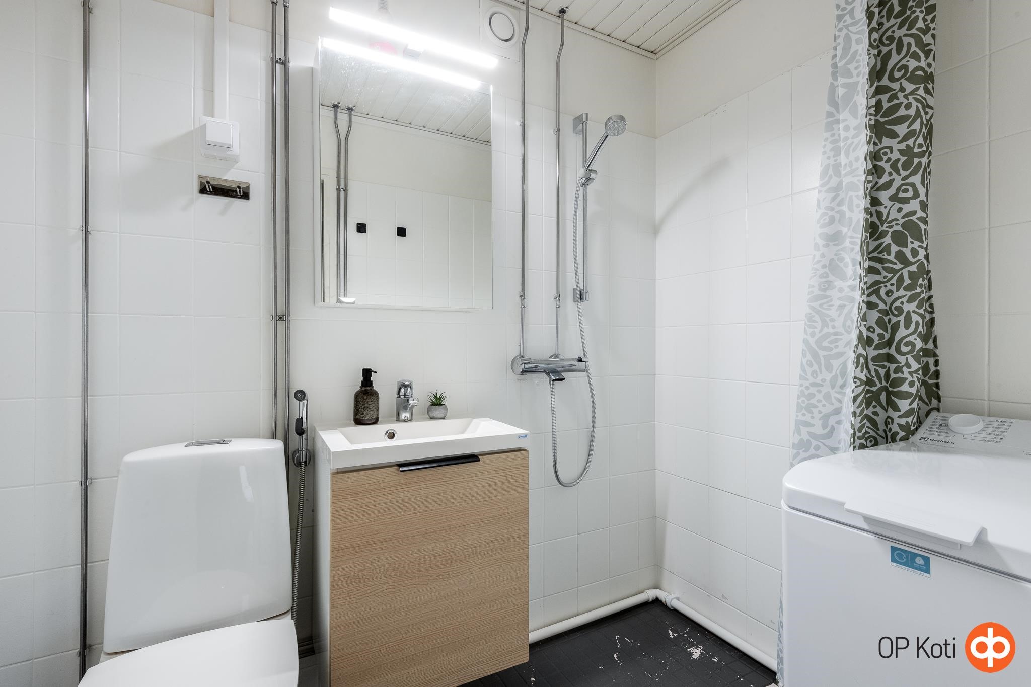 - Kylpyhuone, suihku, suihkuseinä, peilikaappi, allaskaappi, pesukoneliitäntä, lattialämmitys, kiinteät valaisimet. Vesikalusteet uusittu 2022.
