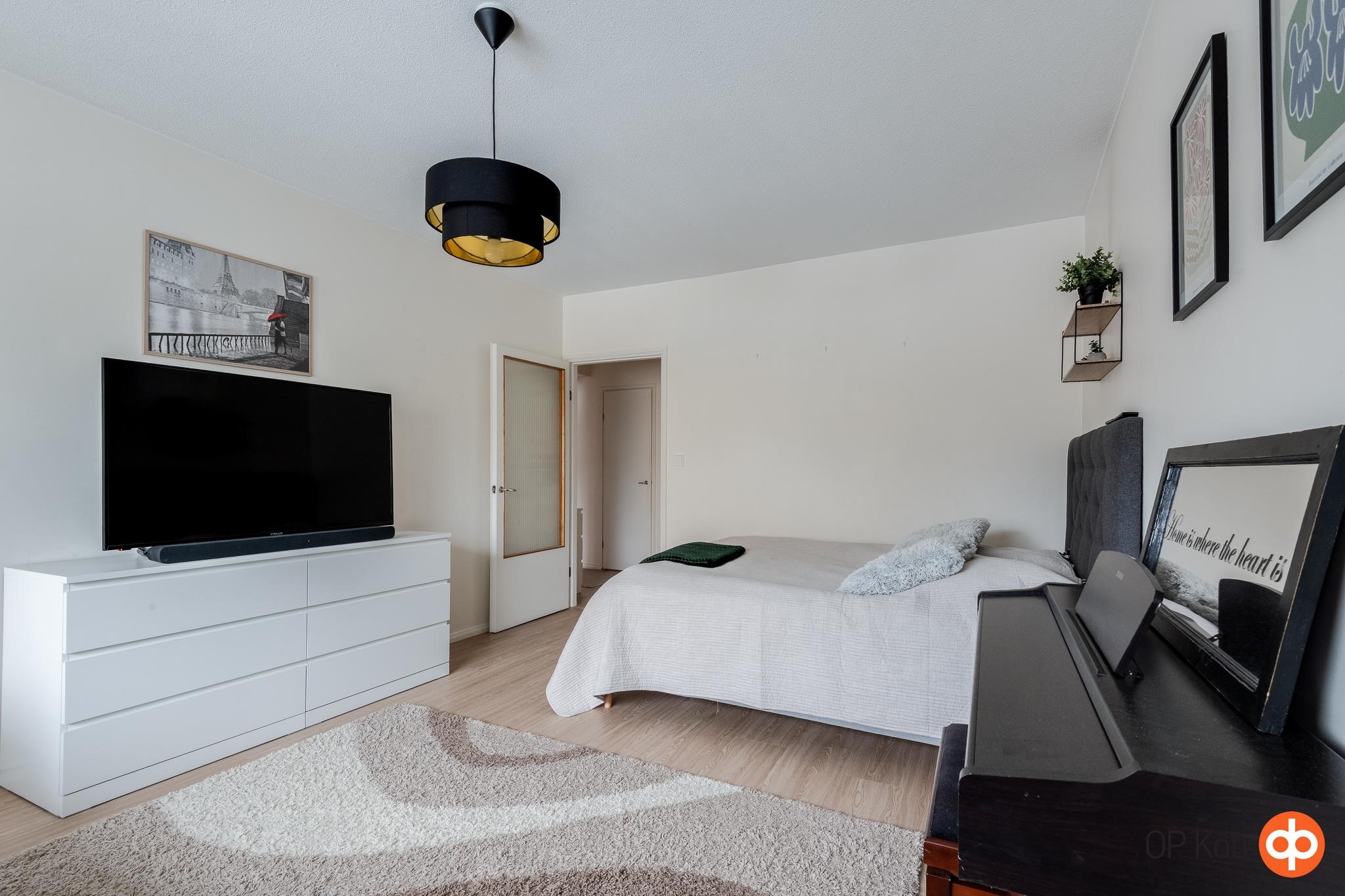 Huoneiston pohjaratkaisu on selkeä ja käytännöllinen: olohuone sijoittuu keskelle asuntoa, mikä tekee tilasta helposti kalustettavan. Keittiö on kokonaan uusittu vuonna 2022 ja varustettu modernilla kalustuksella sekä vetolaatikostoilla. Makuuhuoneen yhteydessä on tilava vaatehuone, ja eteisessä on tyylikäs liukuovikaapisto.