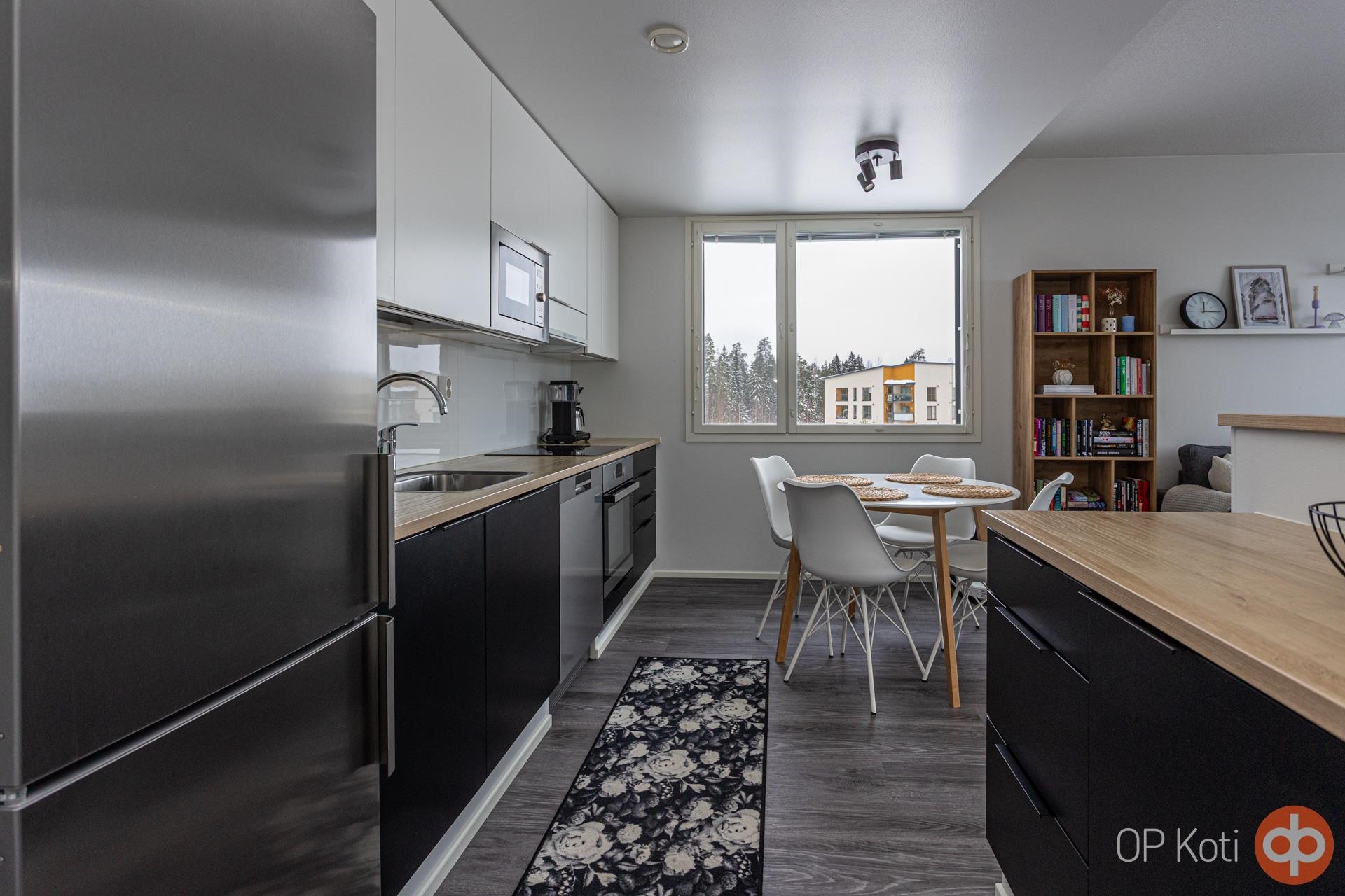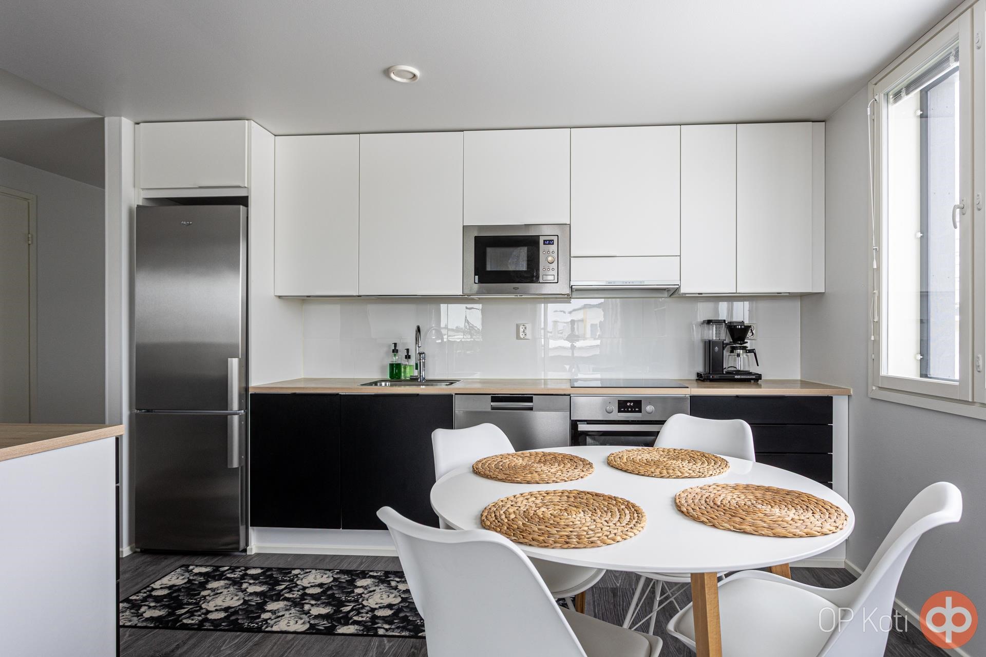 - Jääkaappipakastin, erillisuuni, liesitaso induktio, liesituuletin, mikroaaltouuni, astianpesukone, kaapistot, kiinteät valaisimet.