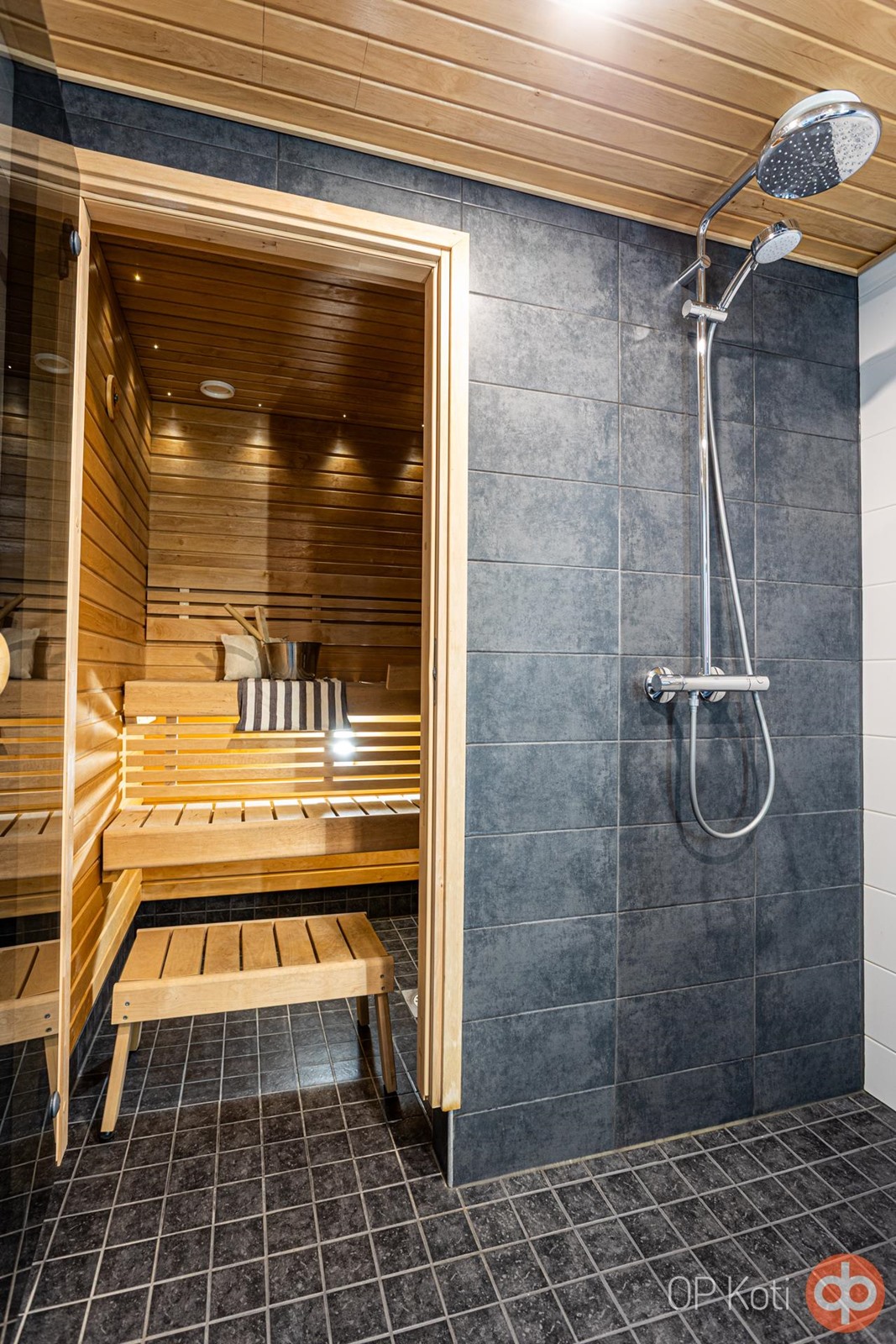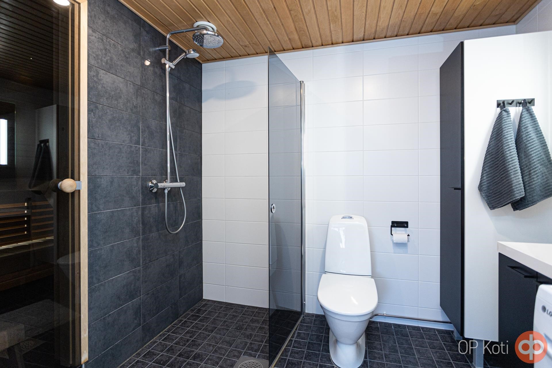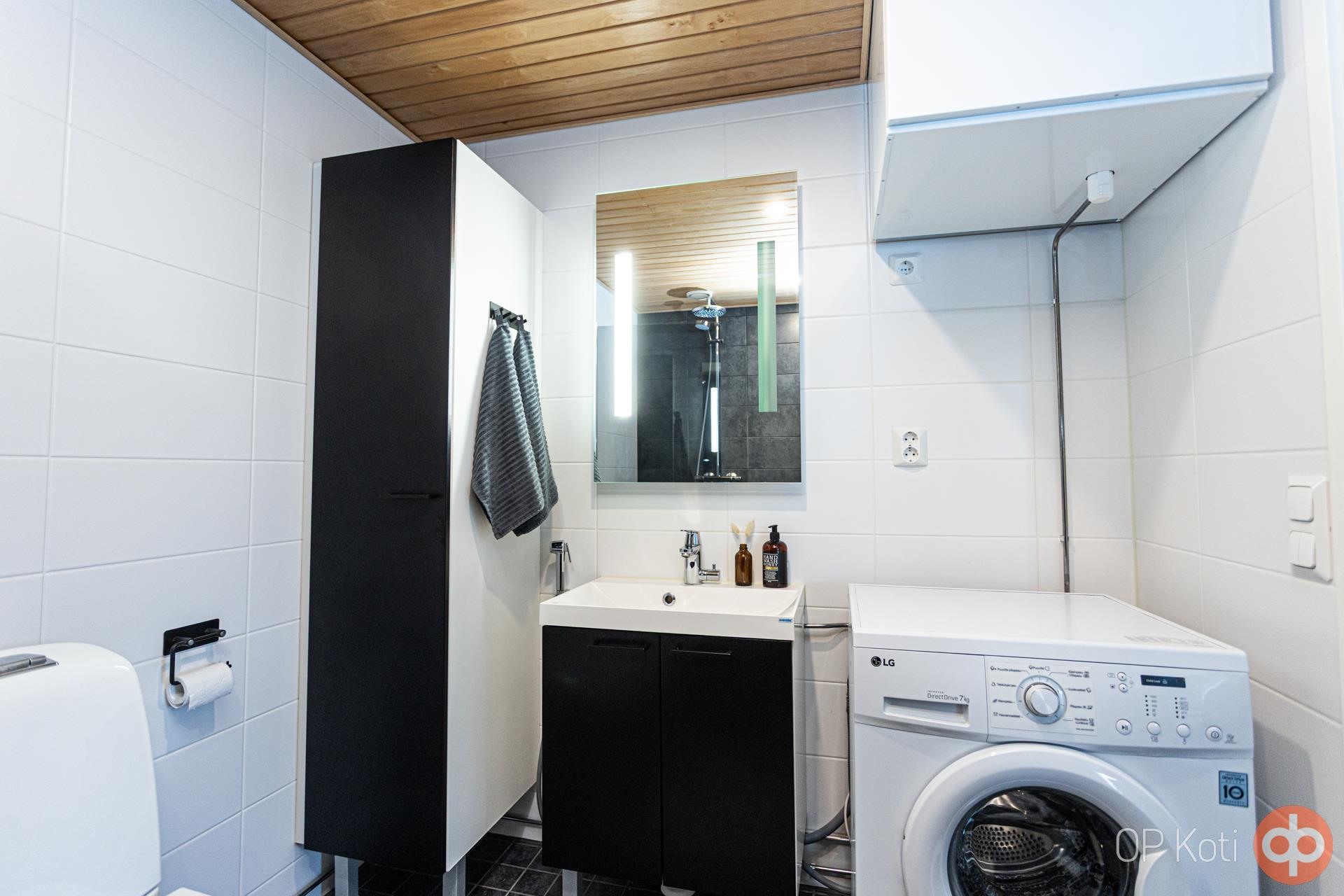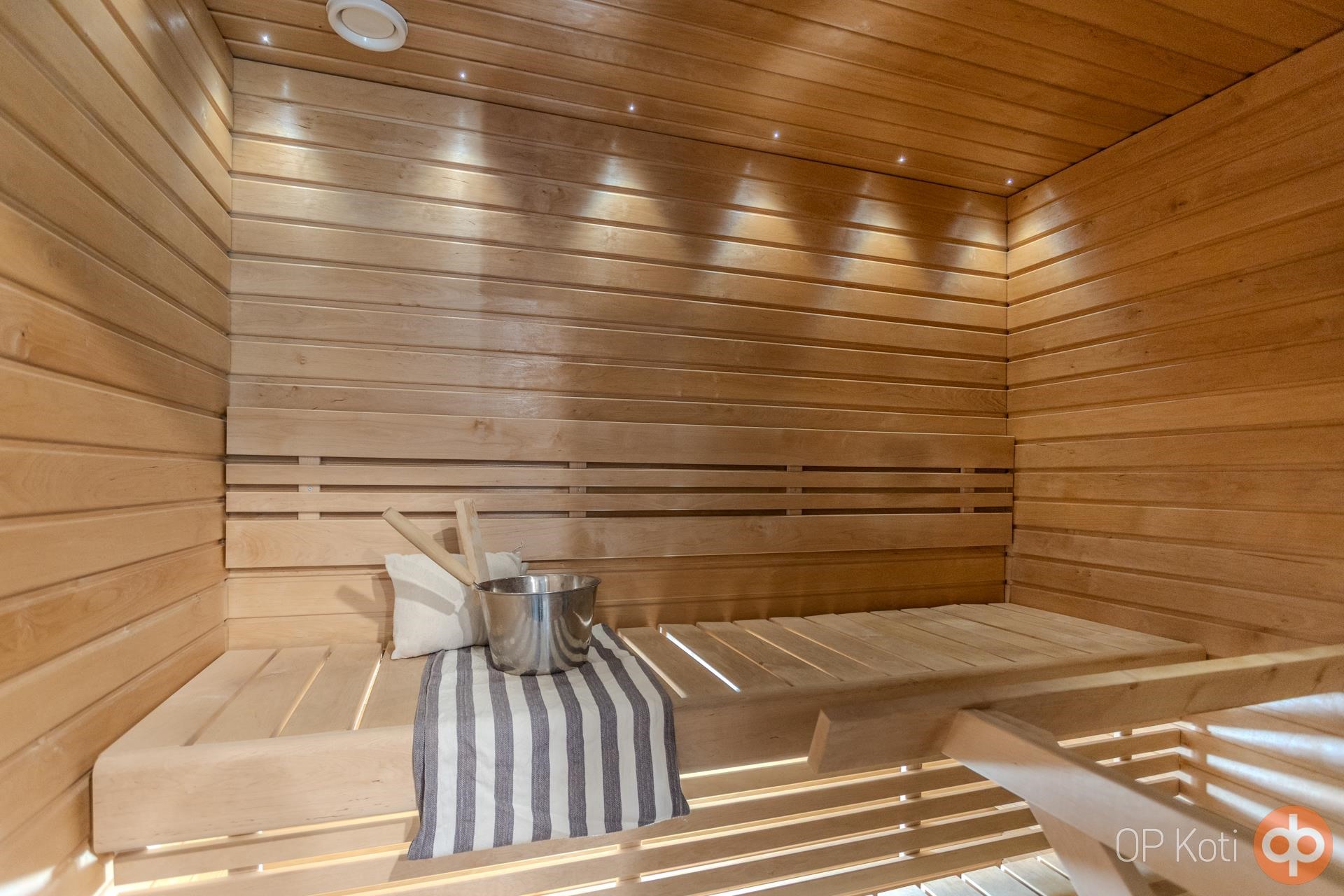 - Sauna, sähkökiuas, kylpyhuone, suihku, suihkuseinä, peilit, allaskaappi, pesukoneliitäntä, lattialämmitys koko huoneisto, kiinteät valaisimet.