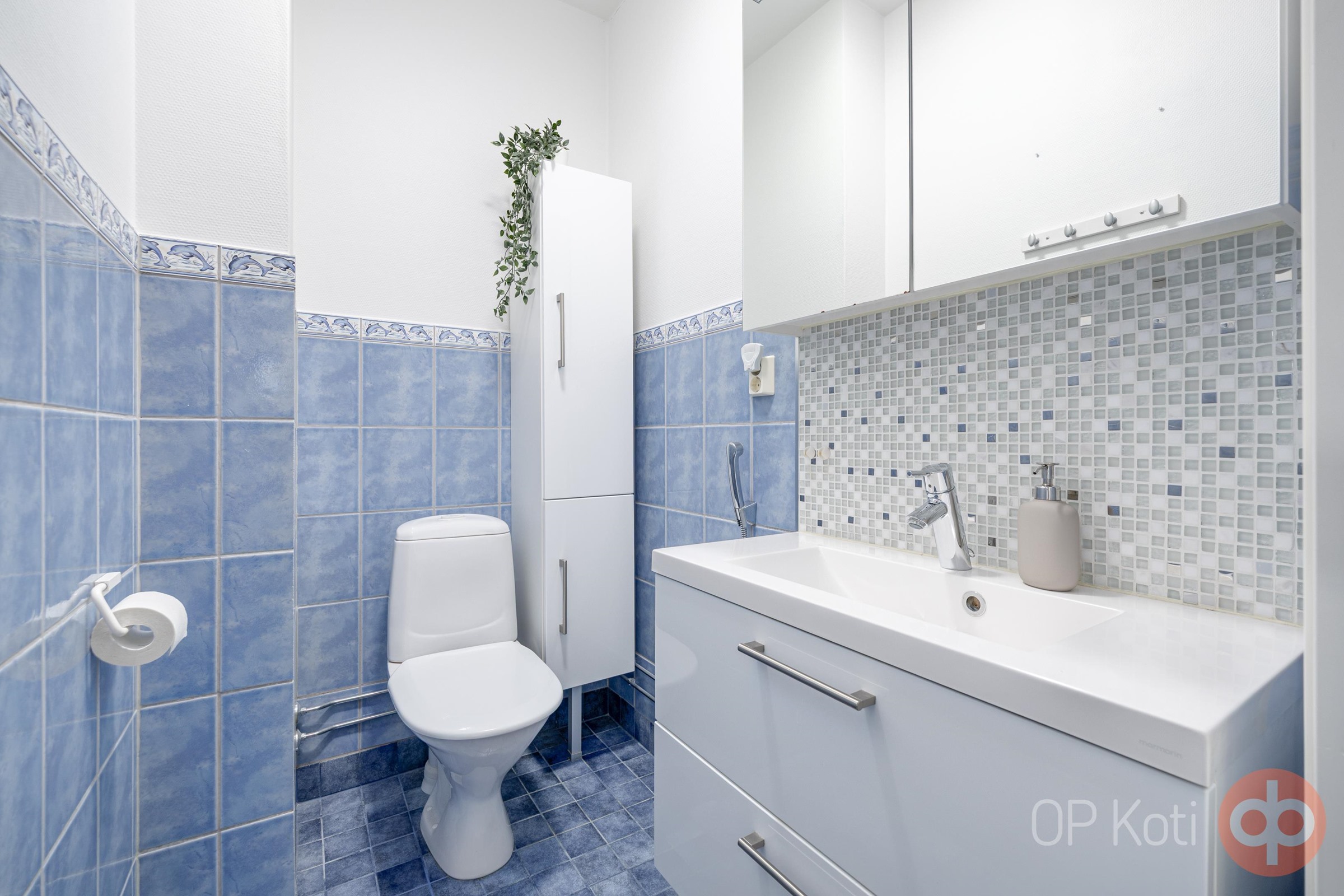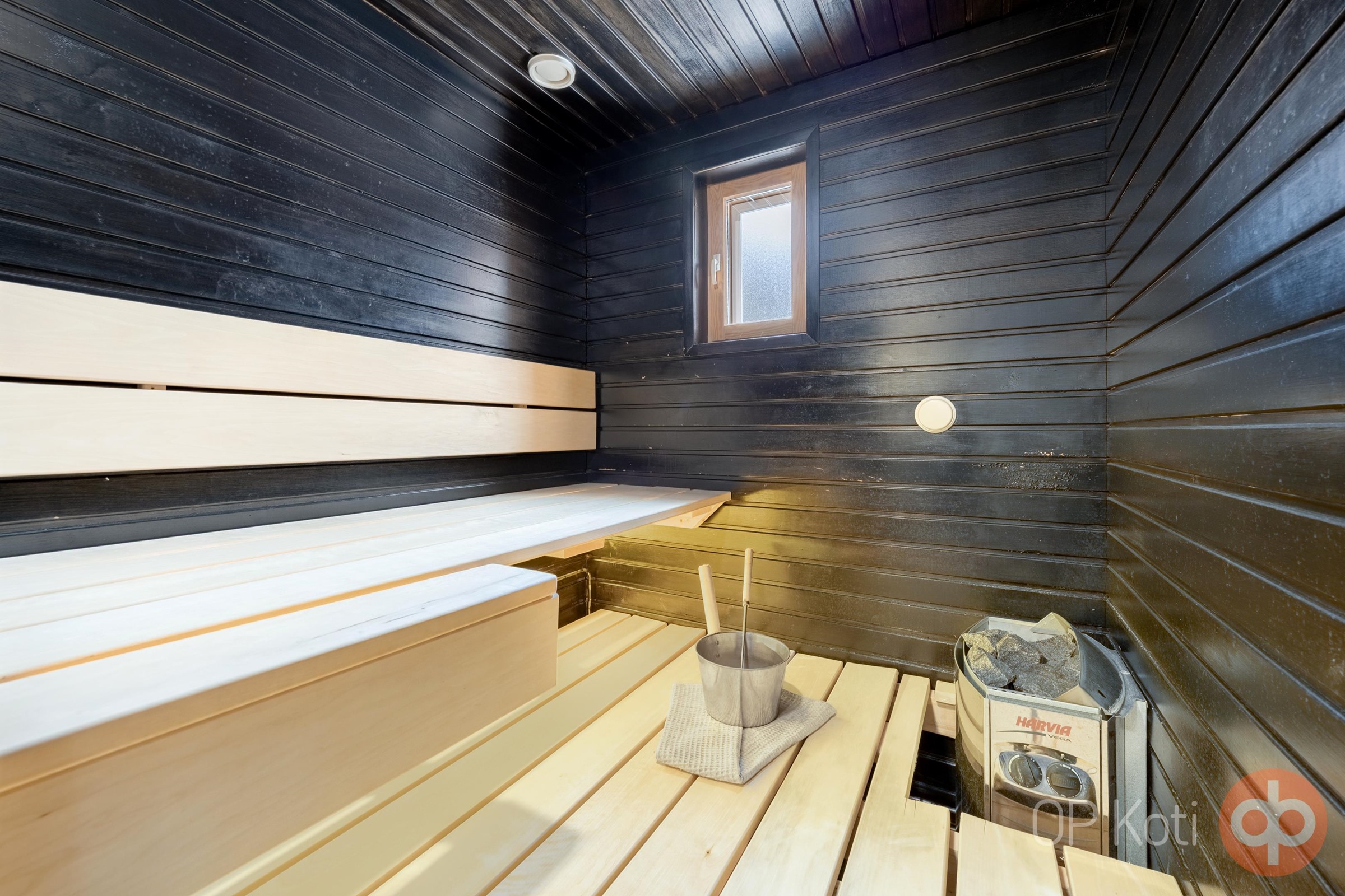 - Sauna, sähkökiuas, kylpyhuone, erillinen wc 2 kpl (ylä- ja alakerrassa), suihku, peilikaappi, allaskaappi, pesukoneliitäntä.