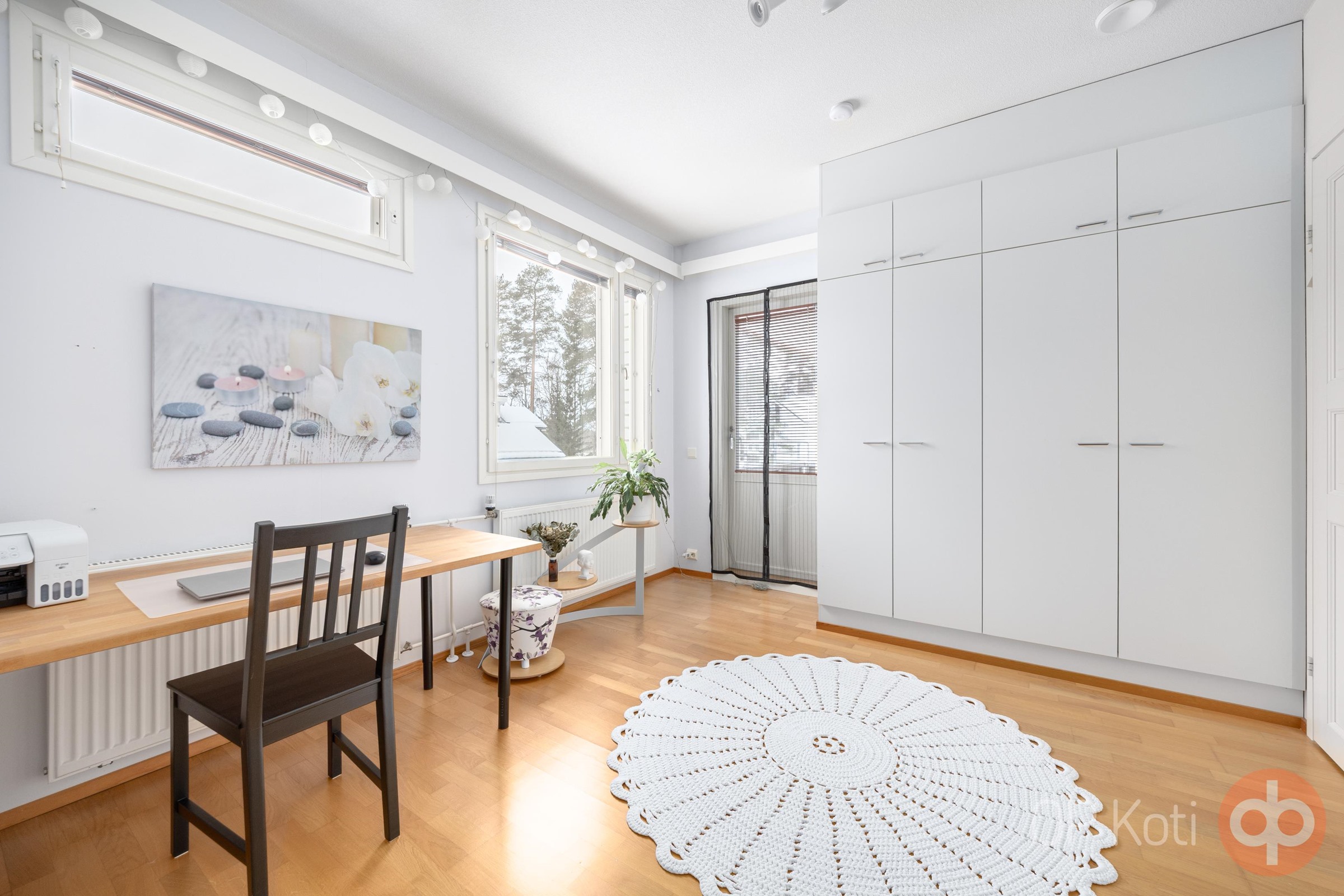 Kaksikerroksinen koti tarjoaa avarat 114,5 m² asuintilaa, jotka on suunniteltu toimivaksi kokonaisuudeksi arjen tarpeisiin. Yläkerrasta löytyvät neljä makuuhuonetta, erillinen wc sekä lounaaseen avautuva parveke, joka tarjoaa aurinkoiset näkymät ja mukavat puitteet oleskeluun.